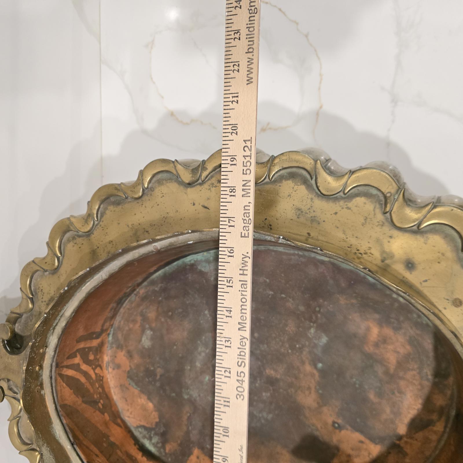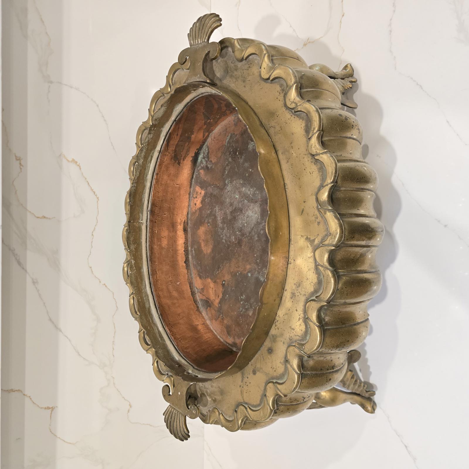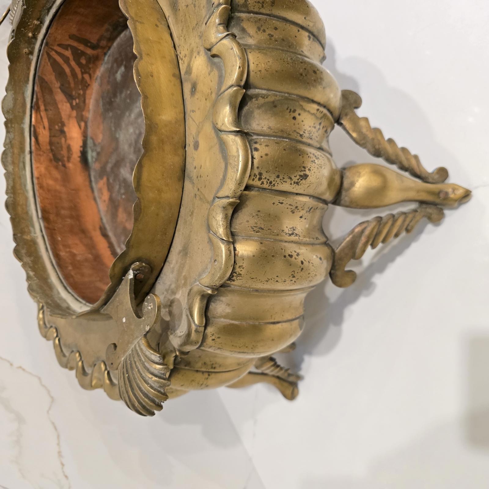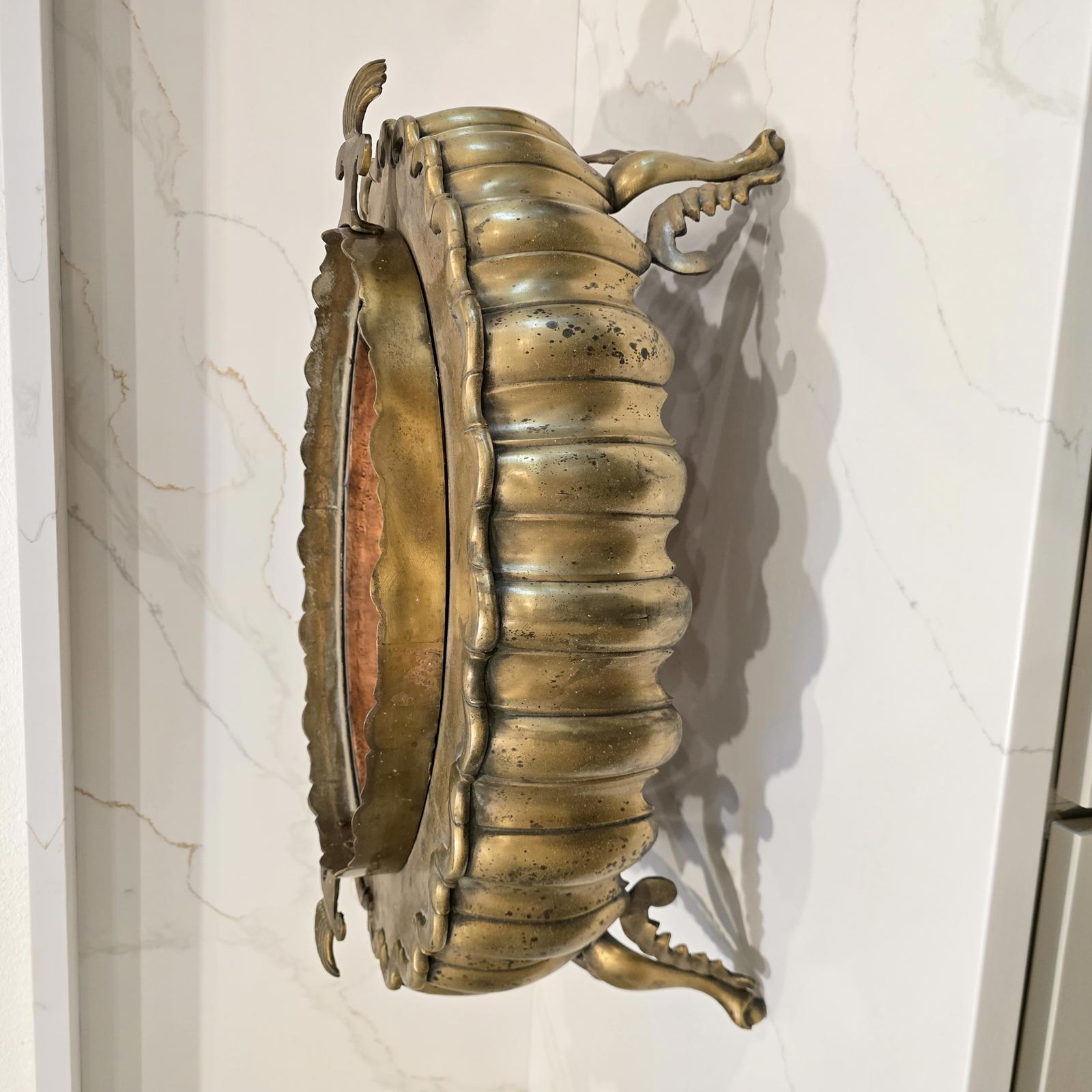 Large, very heavy (about 30lbs) brass and copper brazier dates back to the 19th century when it was used as portable heater. The brazier make a fabulous planter or centerpiece. Fill it with moss, wood, or glass ornamental balls; or anything that comes to your imagination, to create a fabulous tablescape. Handcrafted, it features a fluted brass base with cast, hairy-paw feet. The separate copper and brass liner has scalloped handles so that it can be easily lifted from the base. This is an antique and shows heavy wear and the gorgeous patina and craftsmanship you expect from a piece of this age and use. Please refer to photos as they are part of the description. Interior measures 13"W x 17"L. Approximate exterior measurements 24"L x 19.25"W x 10.5"H.