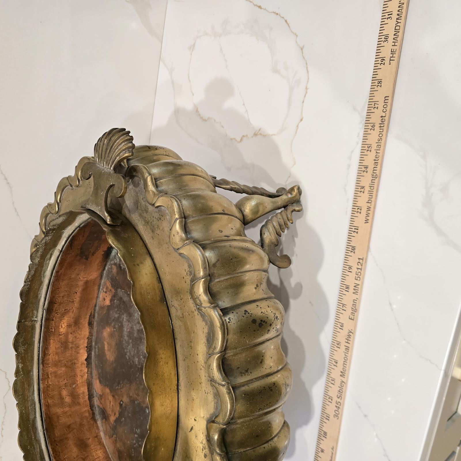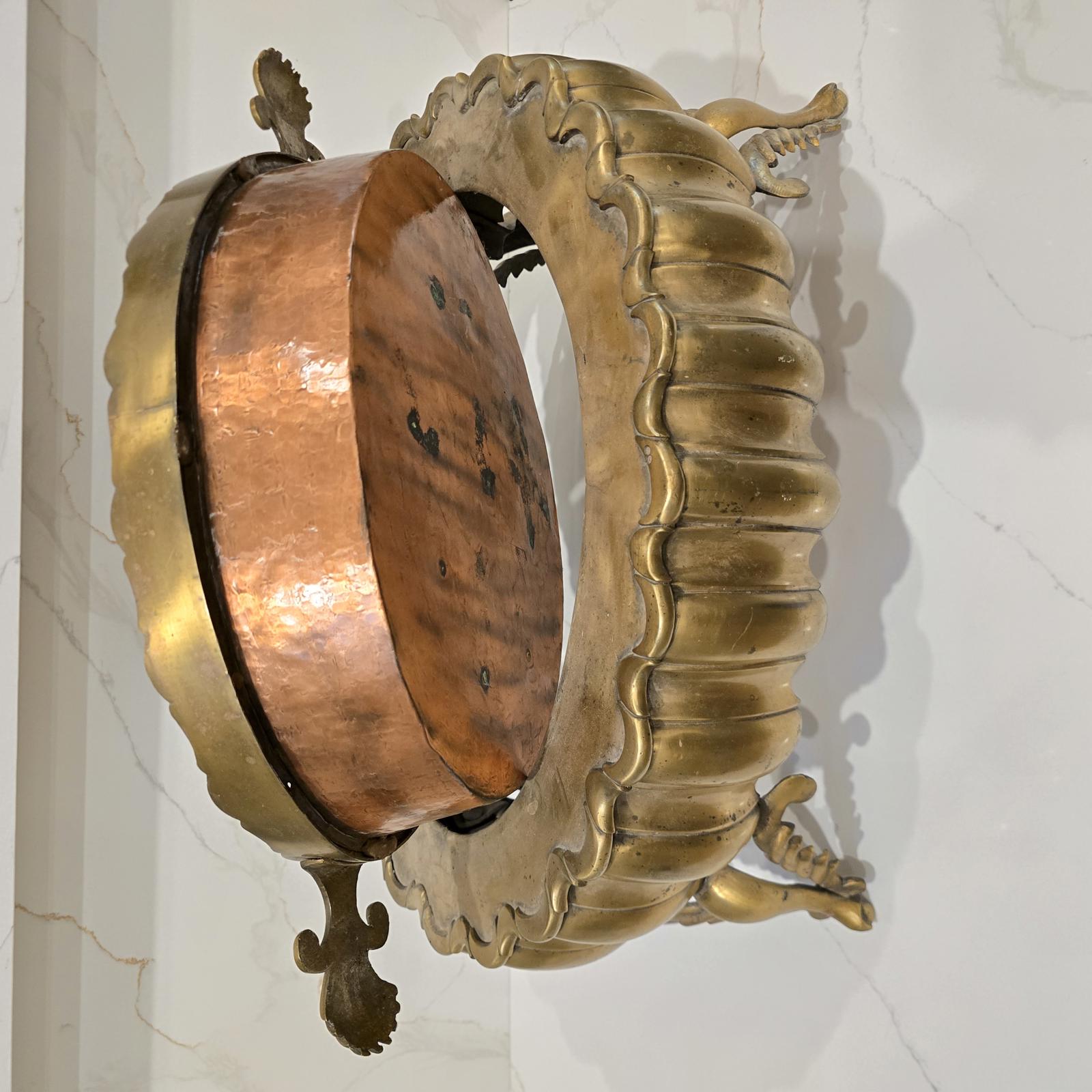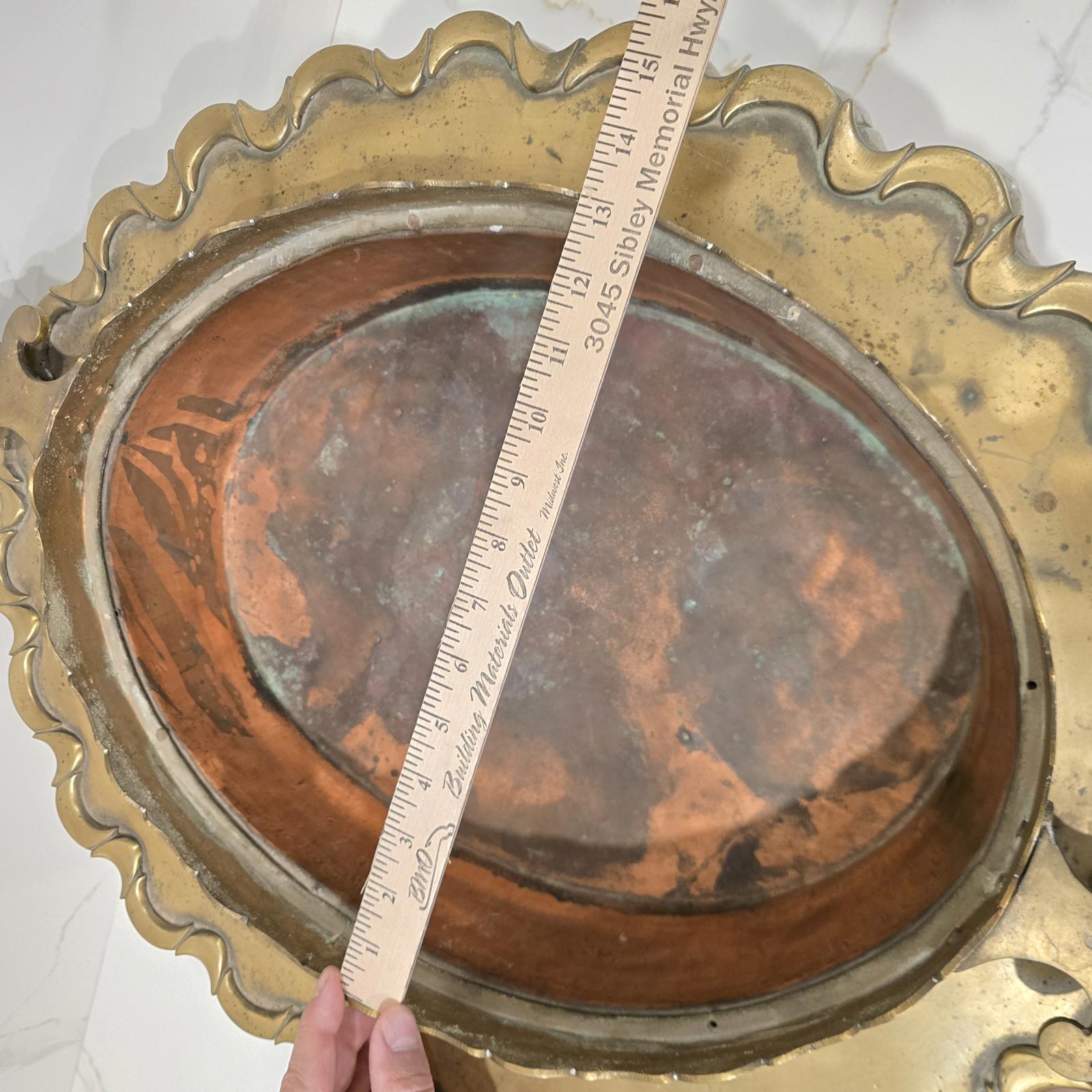 Large, very heavy (about 30lbs) brass and copper brazier dates back to the 19th century when it was used as portable heater. The brazier make a fabulous planter or centerpiece. Fill it with moss, wood, or glass ornamental balls; or anything that comes to your imagination, to create a fabulous tablescape. Handcrafted, it features a fluted brass base with cast, hairy-paw feet. The separate copper and brass liner has scalloped handles so that it can be easily lifted from the base. This is an antique and shows heavy wear and the gorgeous patina and craftsmanship you expect from a piece of this age and use. Please refer to photos as they are part of the description. Interior measures 13"W x 17"L. Approximate exterior measurements 24"L x 19.25"W x 10.5"H.