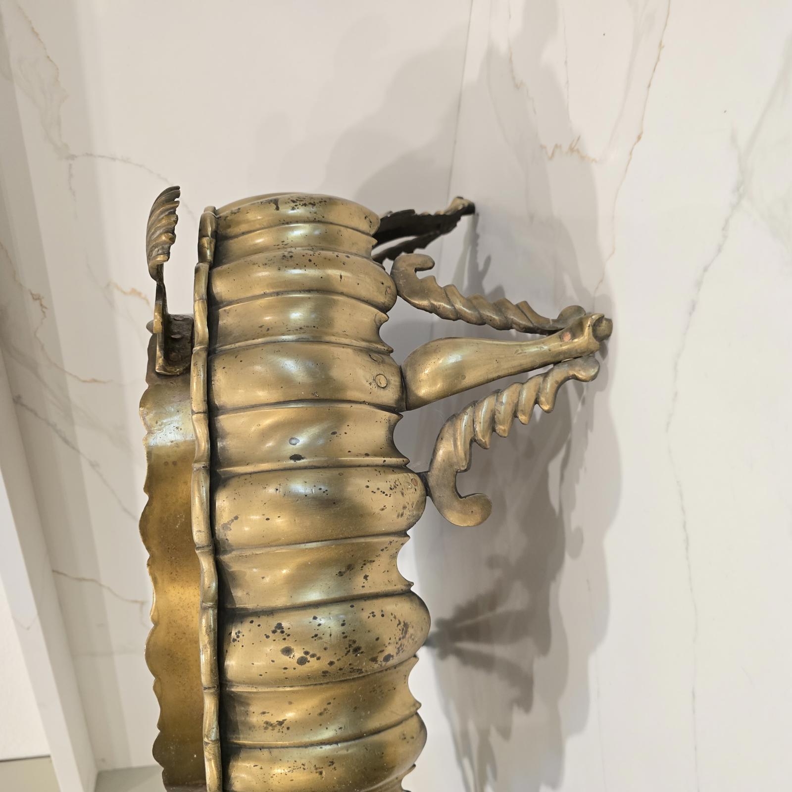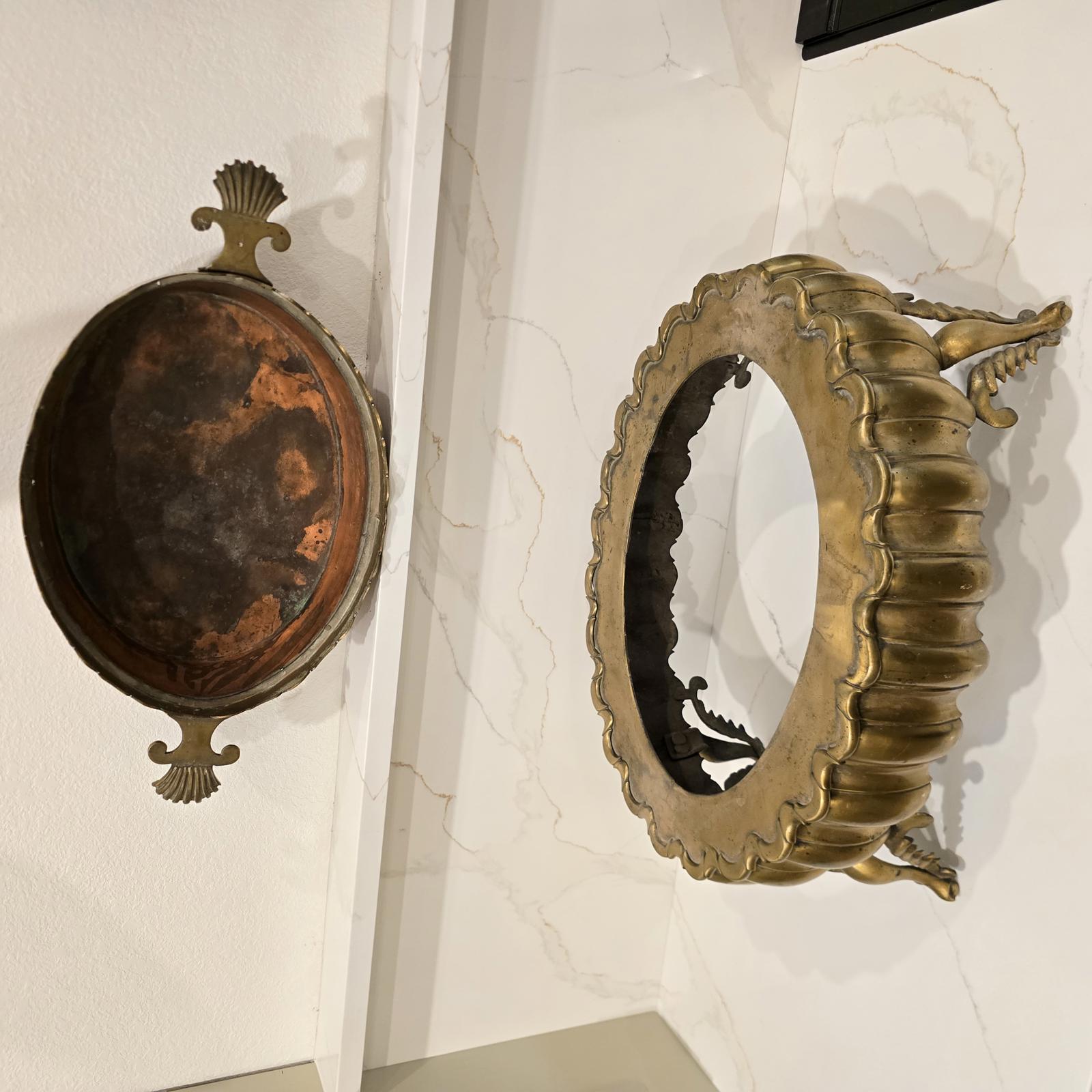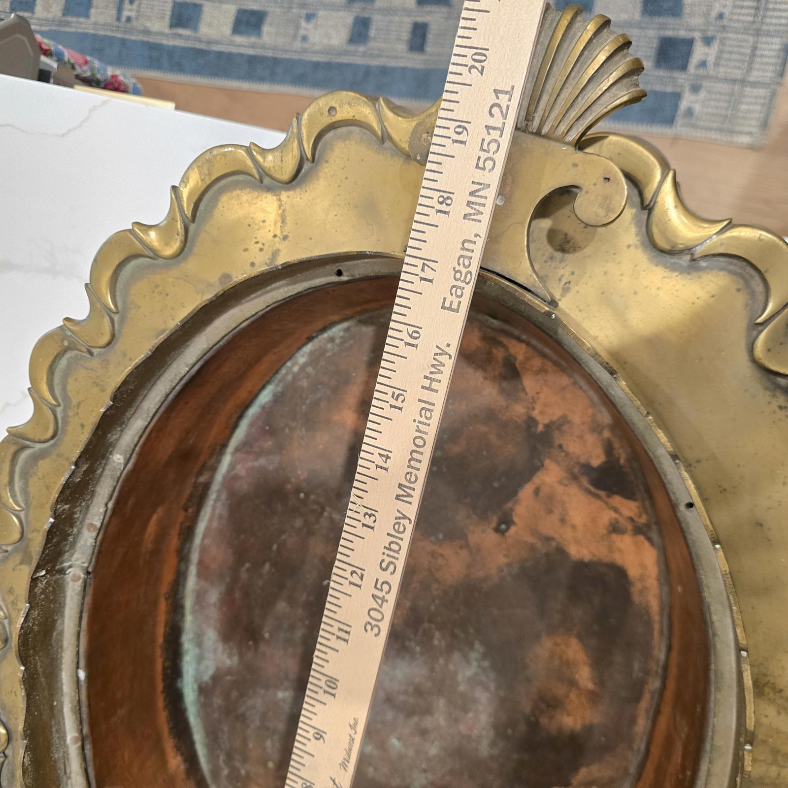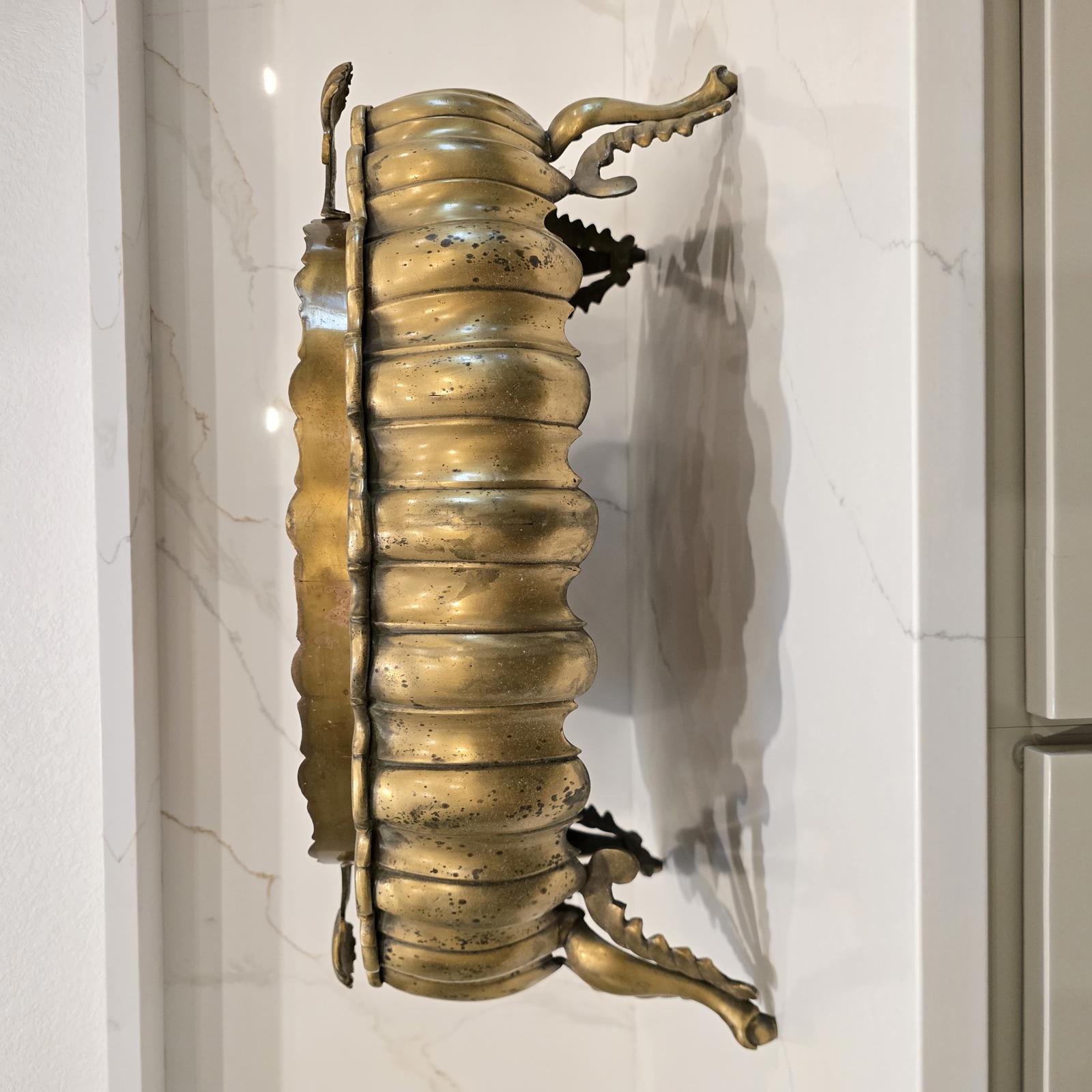 Large, very heavy (about 30lbs) brass and copper brazier dates back to the 19th century when it was used as portable heater. The brazier make a fabulous planter or centerpiece. Fill it with moss, wood, or glass ornamental balls; or anything that comes to your imagination, to create a fabulous tablescape. Handcrafted, it features a fluted brass base with cast, hairy-paw feet. The separate copper and brass liner has scalloped handles so that it can be easily lifted from the base. This is an antique and shows heavy wear and the gorgeous patina and craftsmanship you expect from a piece of this age and use. Please refer to photos as they are part of the description. Interior measures 13"W x 17"L. Approximate exterior measurements 24"L x 19.25"W x 10.5"H.