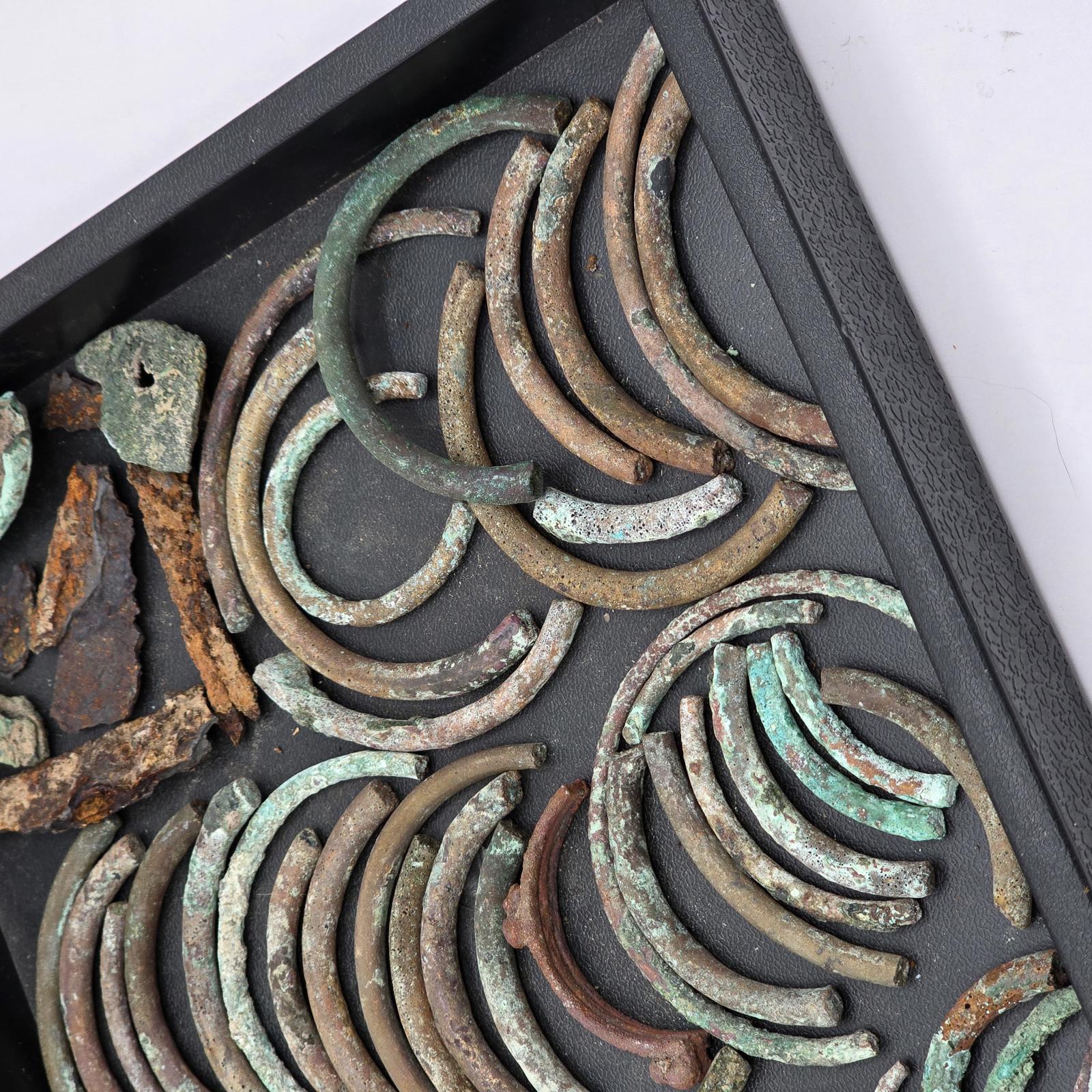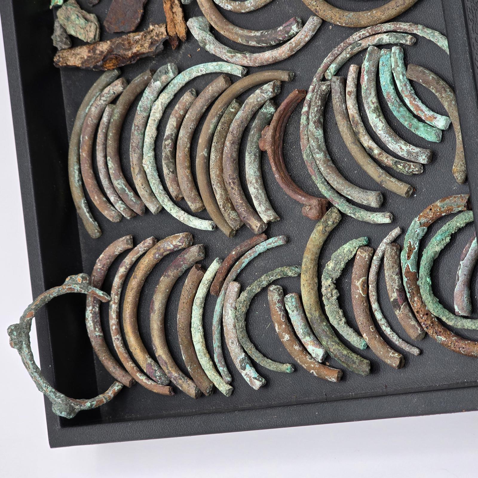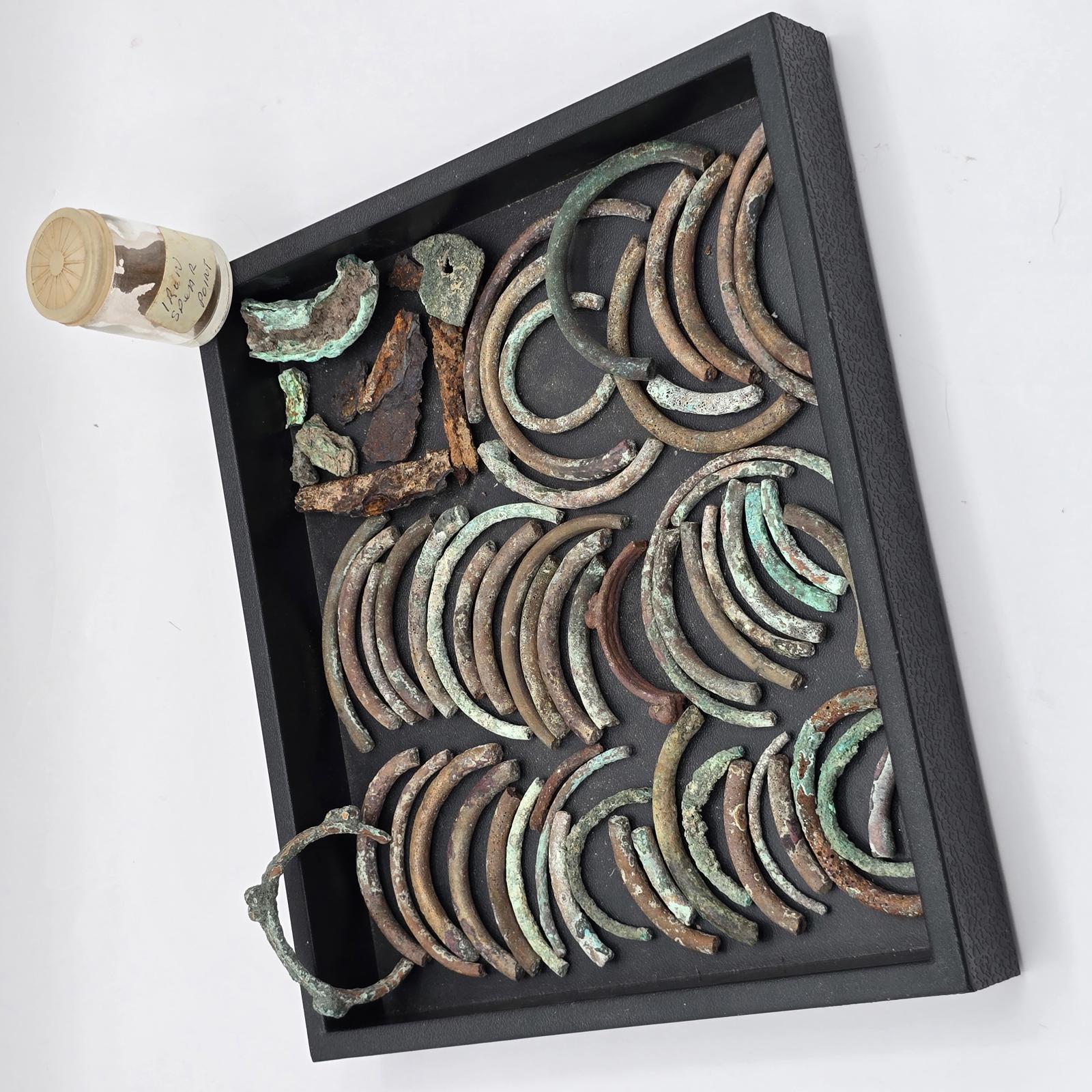 Fascinating collection of relics from Roman history. Pieces of arm bands(known as armilla and awarded as a military decoration to soldiers of ancient Rome for acts of gallantry), and also worn by men and women. Bracelets, bronze and copper pieces, and iron spear points. Please refer to photos to view complete set. Tray not included