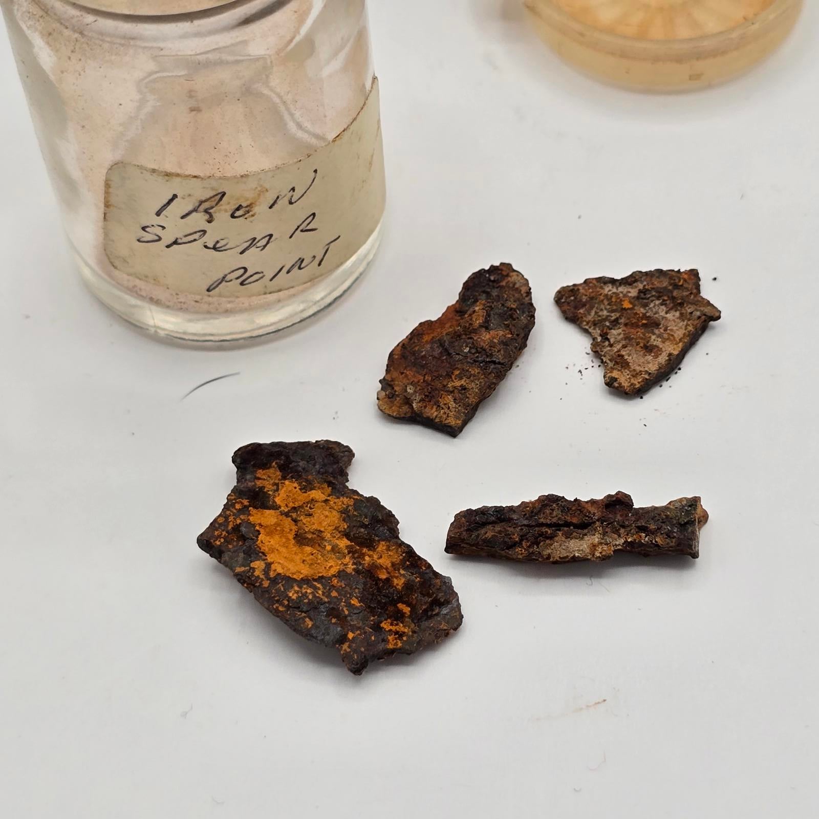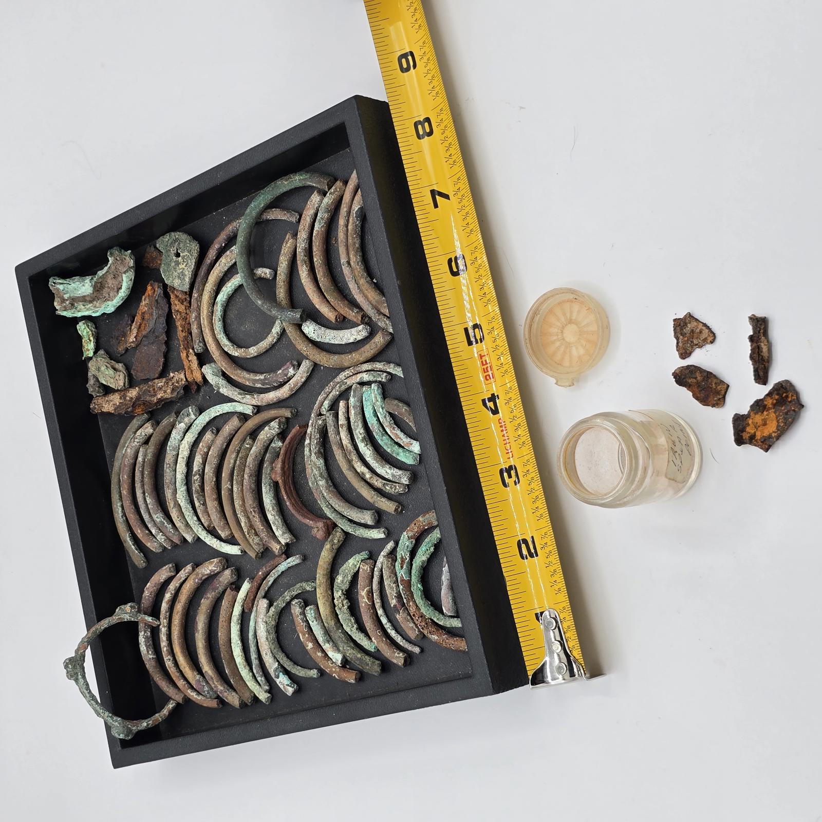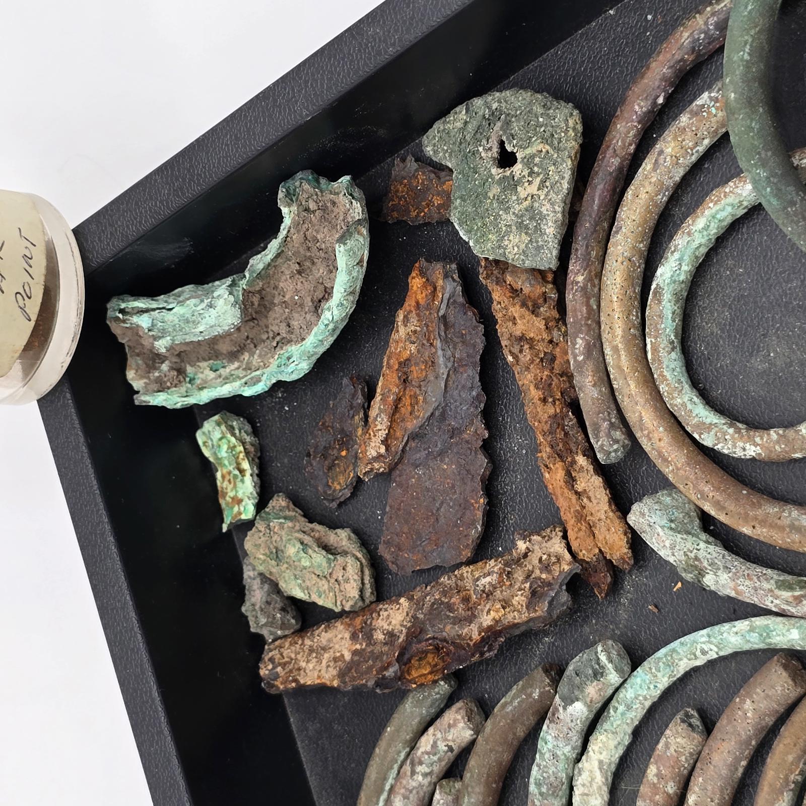Fascinating collection of relics from Roman history. Pieces of arm bands(known as armilla and awarded as a military decoration to soldiers of ancient Rome for acts of gallantry), and also worn by men and women. Bracelets, bronze and copper pieces, and iron spear points. Please refer to photos to view complete set. Tray not included
