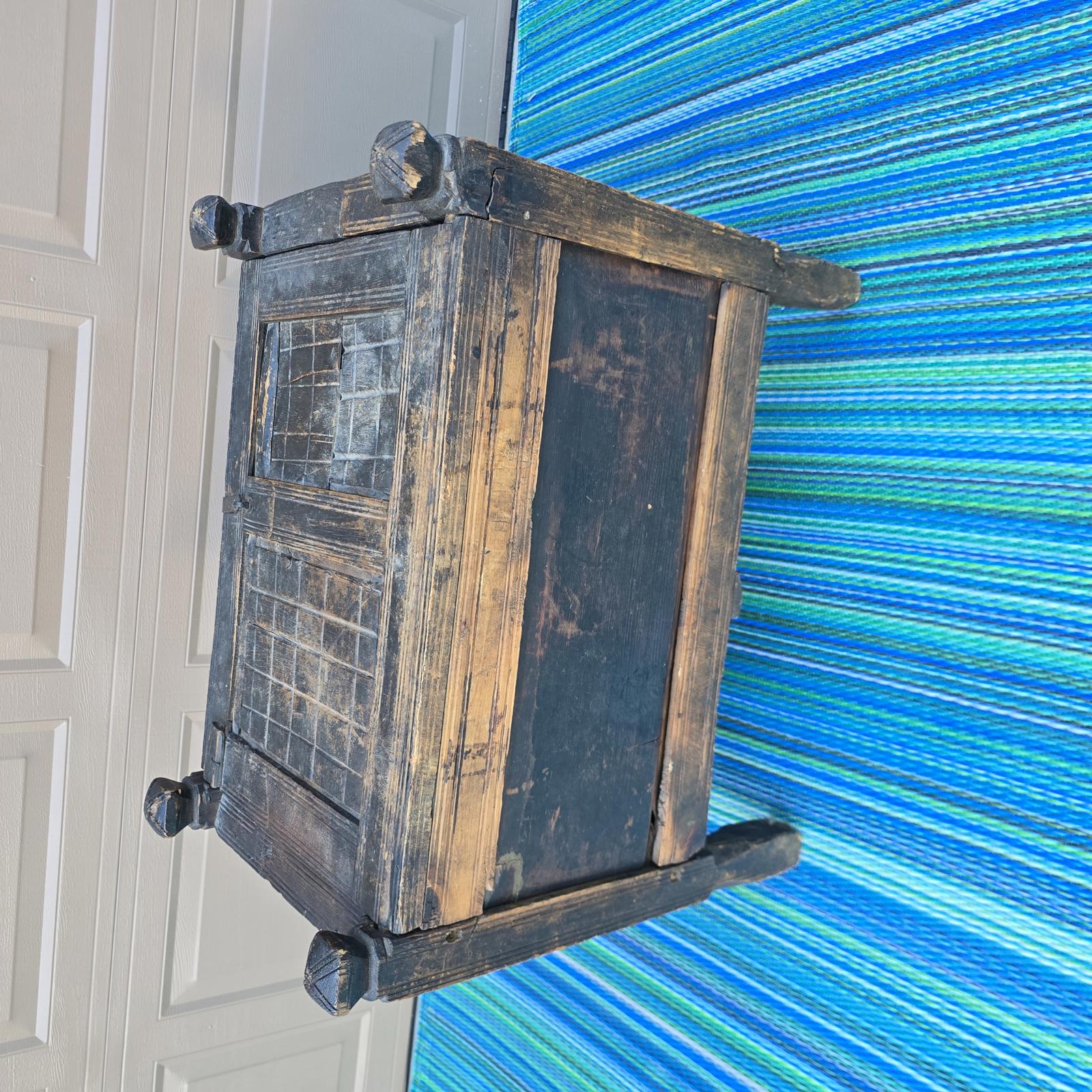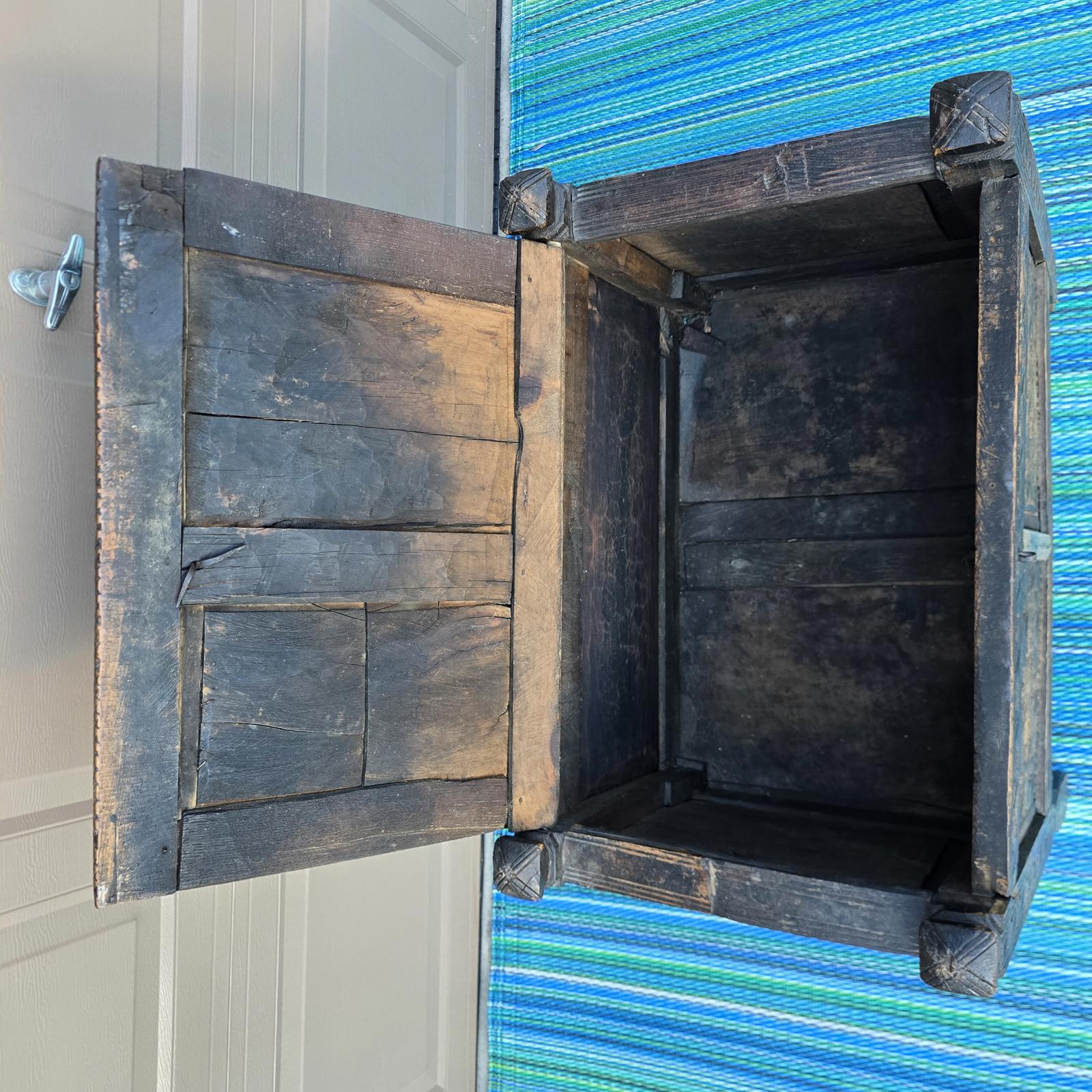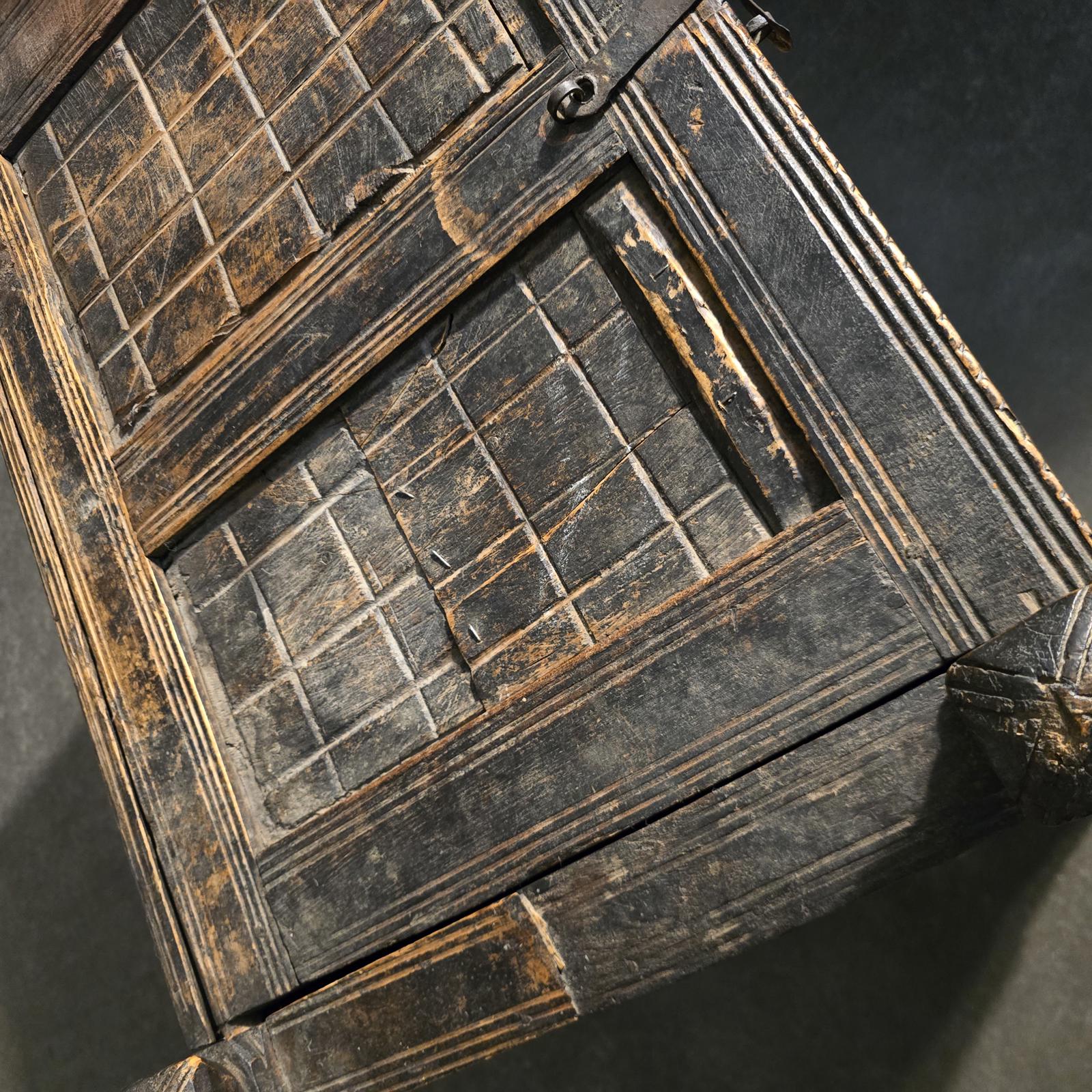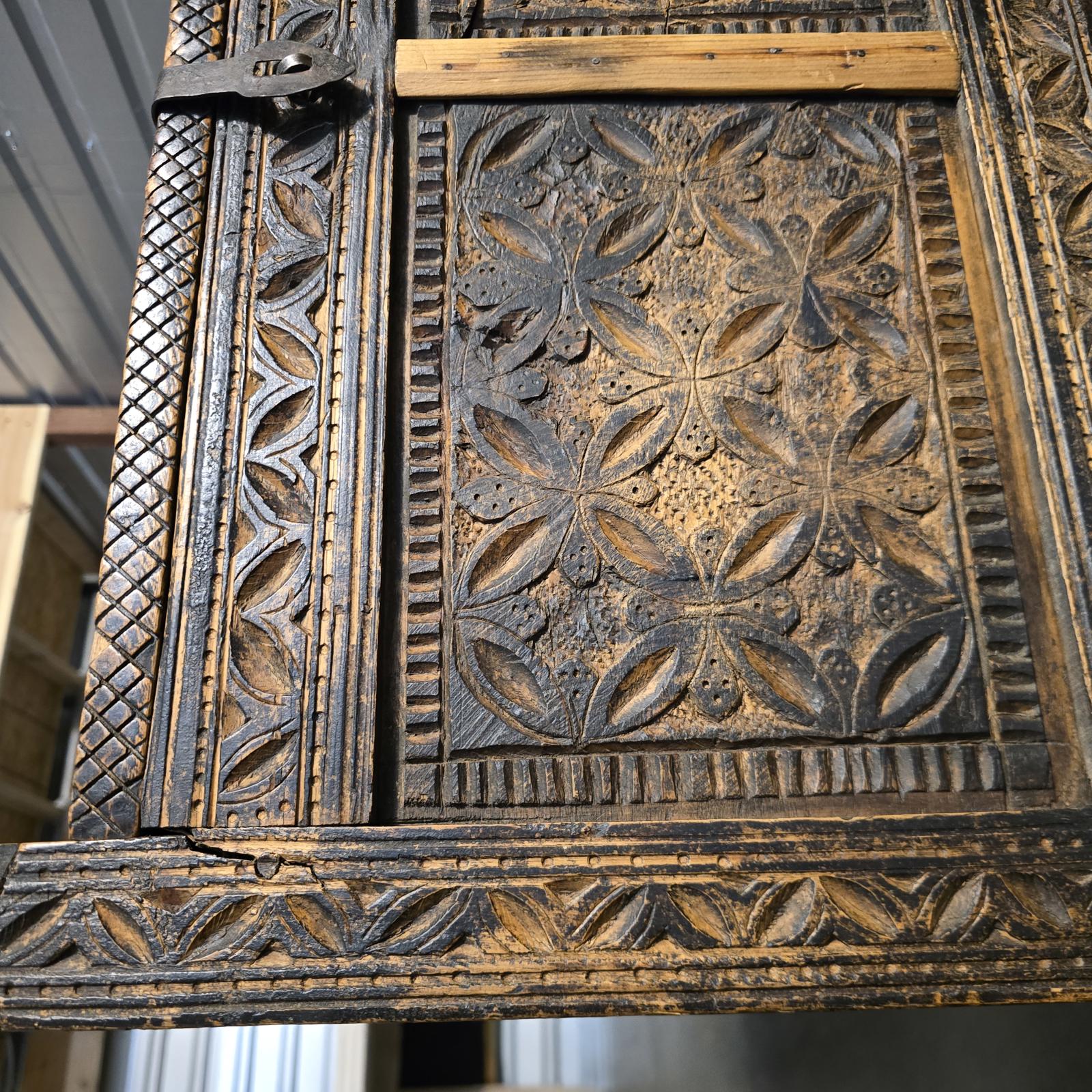Handcrafted 18th-19th century footed chest with intricate floral carvings, metalwork, and details. The chest is beautiful and very old, which adds to its charm. It has stood the test of time, as can be seen by the hand-cut nails, warping, and natural splitting on both the vertical and horizontal surfaces due to expansion and contraction of the wood throughout the years. A wood piece was more recently added to the front of the chest for support. This chest is a unique, curated piece with a gorgeous patina and will be a great addition to your home or collection. 27.25"W x 17.75"D x 22.25"H (25"H including finials).