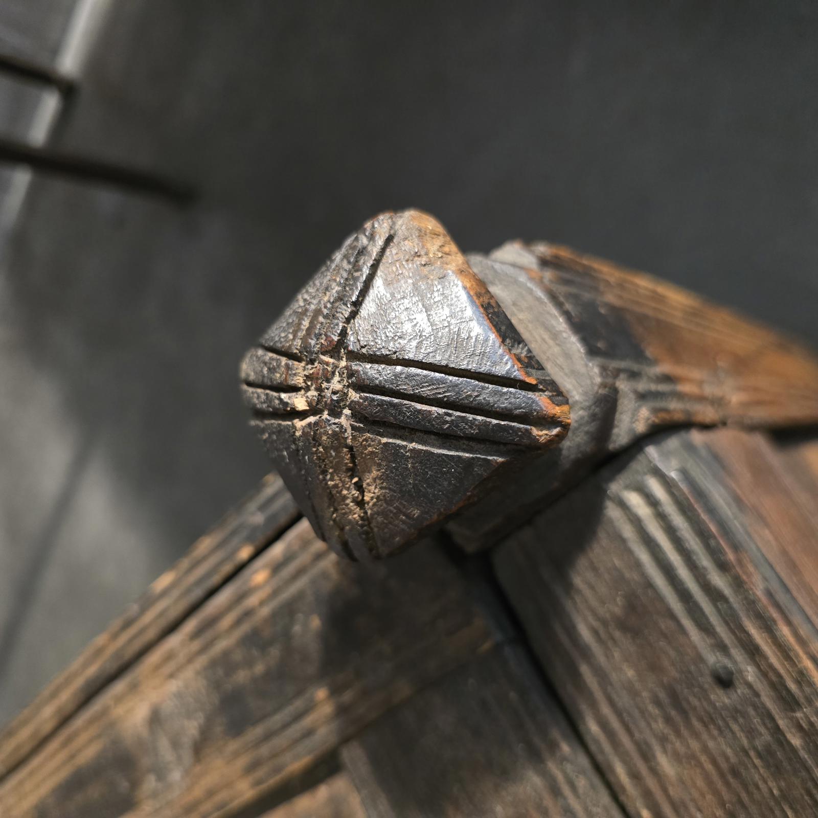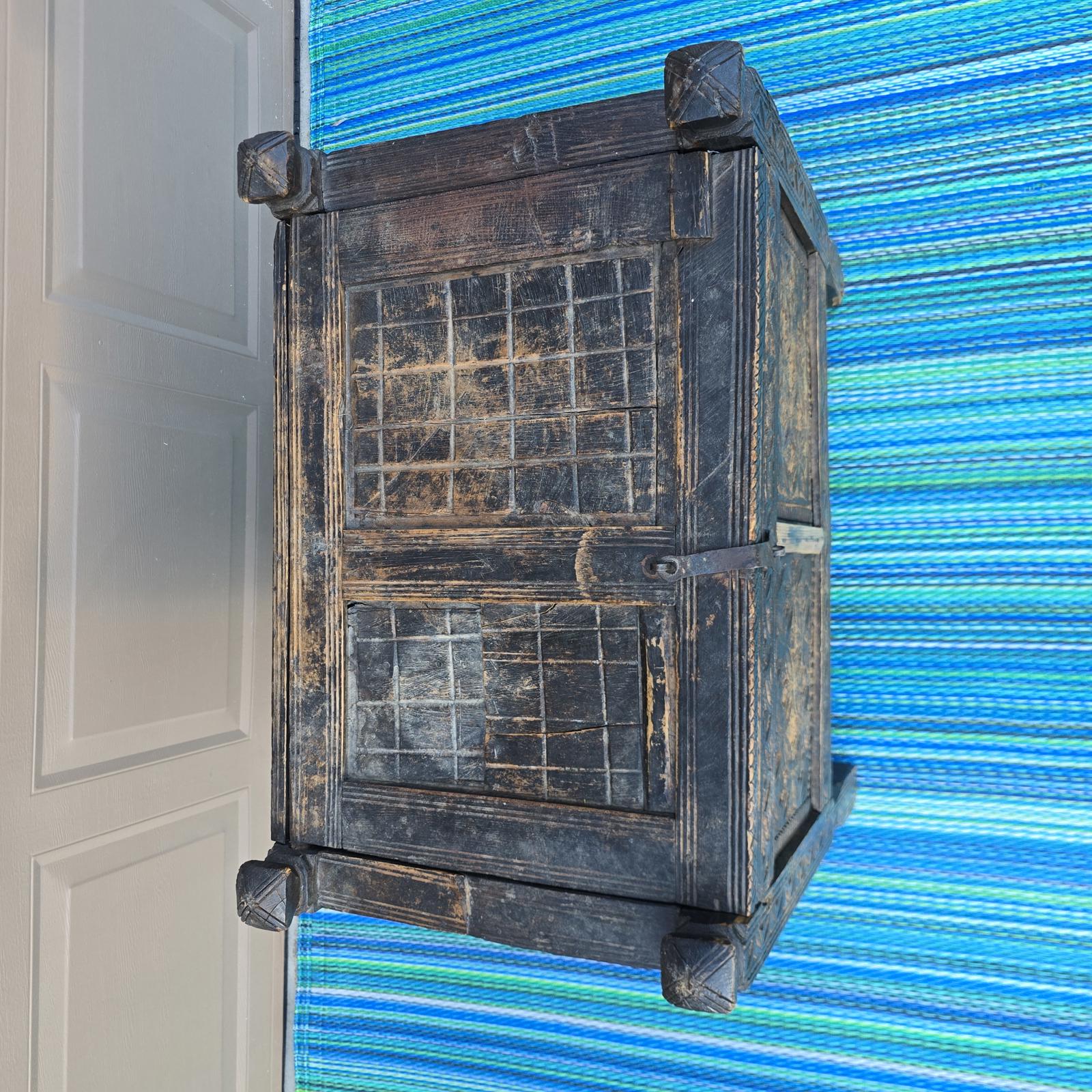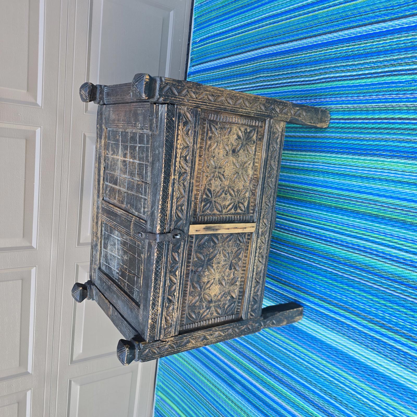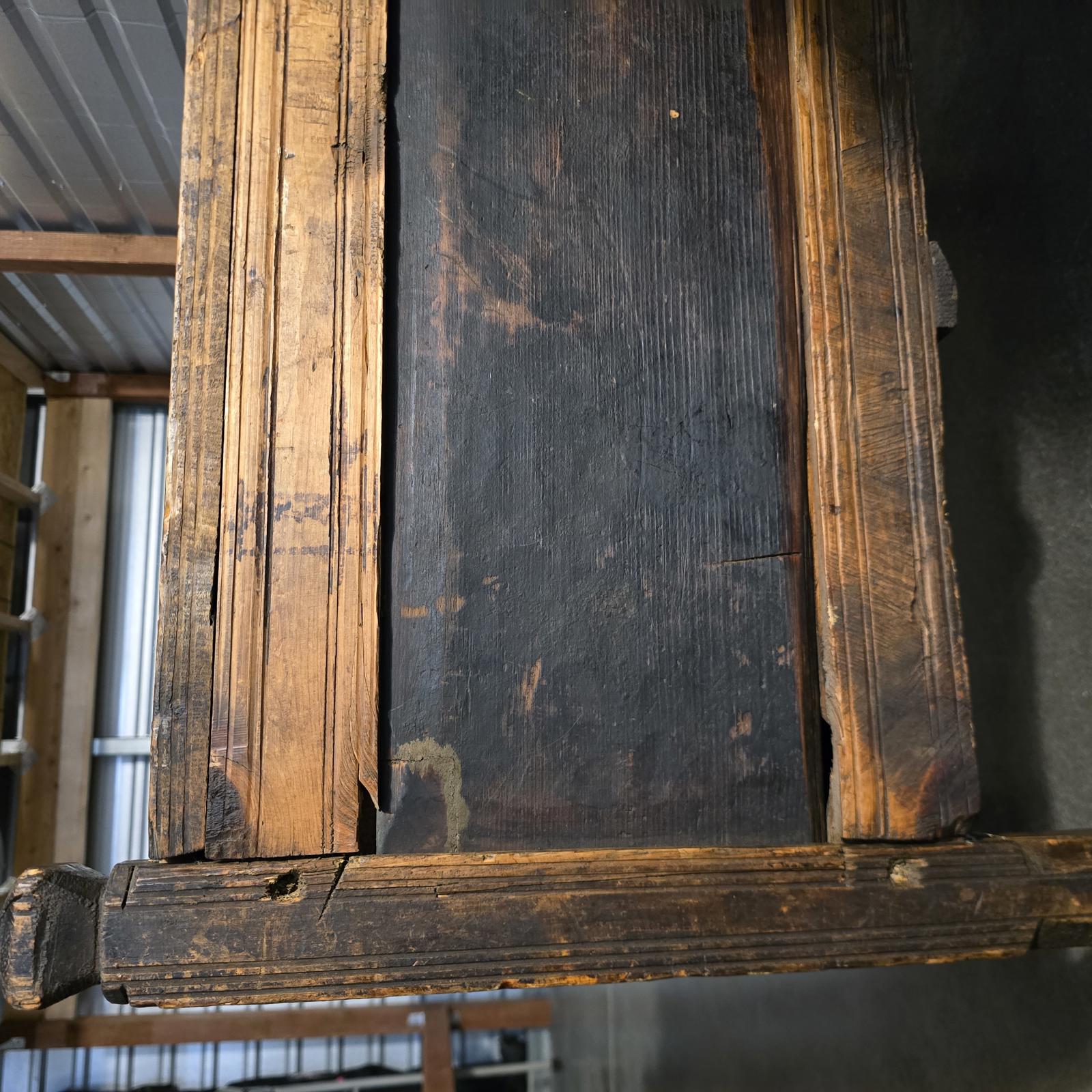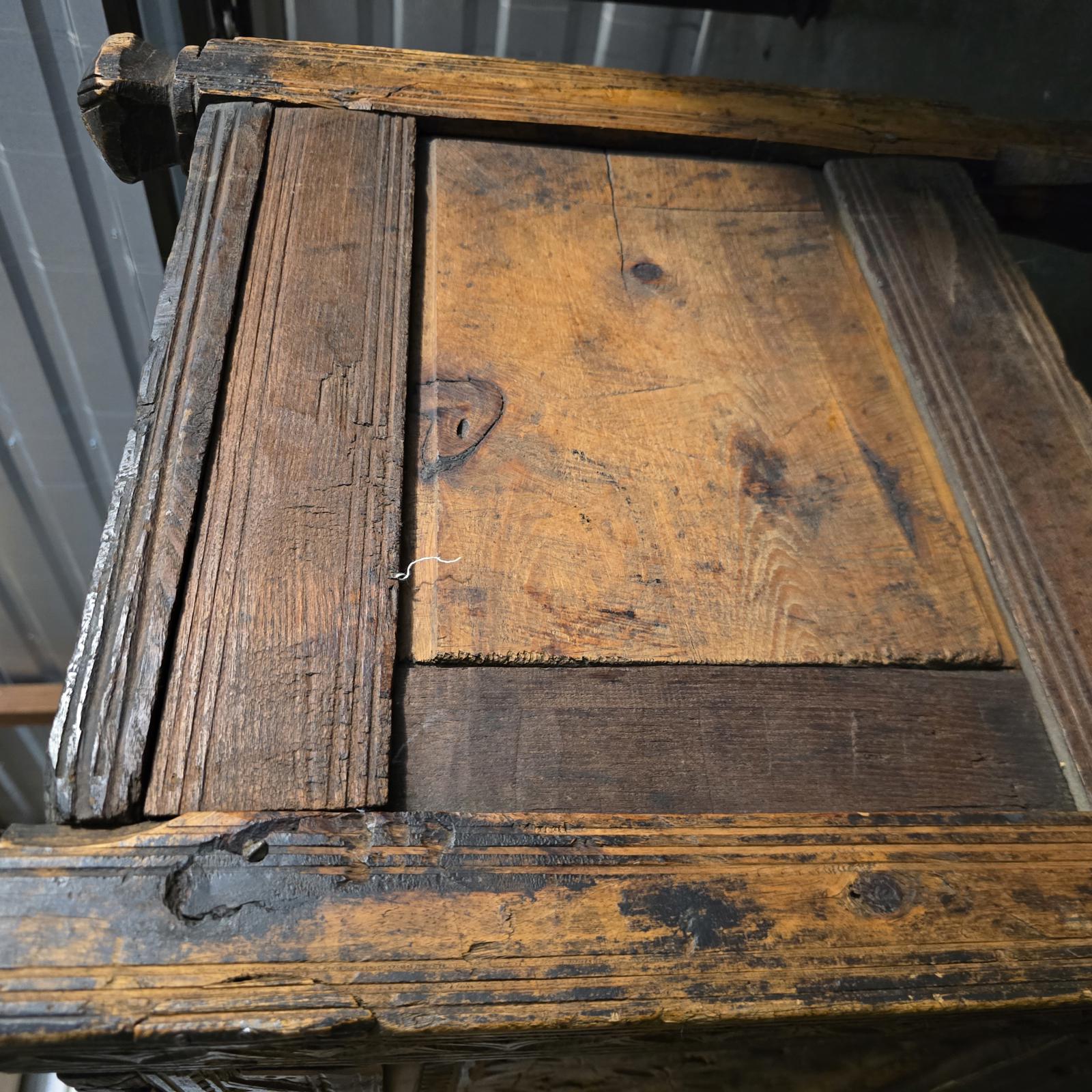 Handcrafted 18th-19th century footed chest with intricate floral carvings, metalwork, and details. The chest is beautiful and very old, which adds to its charm. It has stood the test of time, as can be seen by the hand-cut nails, warping, and natural splitting on both the vertical and horizontal surfaces due to expansion and contraction of the wood throughout the years. A wood piece was more recently added to the front of the chest for support. This chest is a unique, curated piece with a gorgeous patina and will be a great addition to your home or collection. 27.25"W x 17.75"D x 22.25"H (25"H including finials).