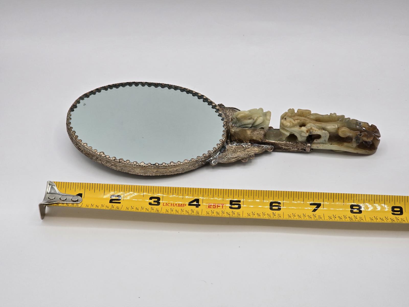 Antique Chinese Silver-plated Hand Mirror with Carved Jade Belt Hook Handle