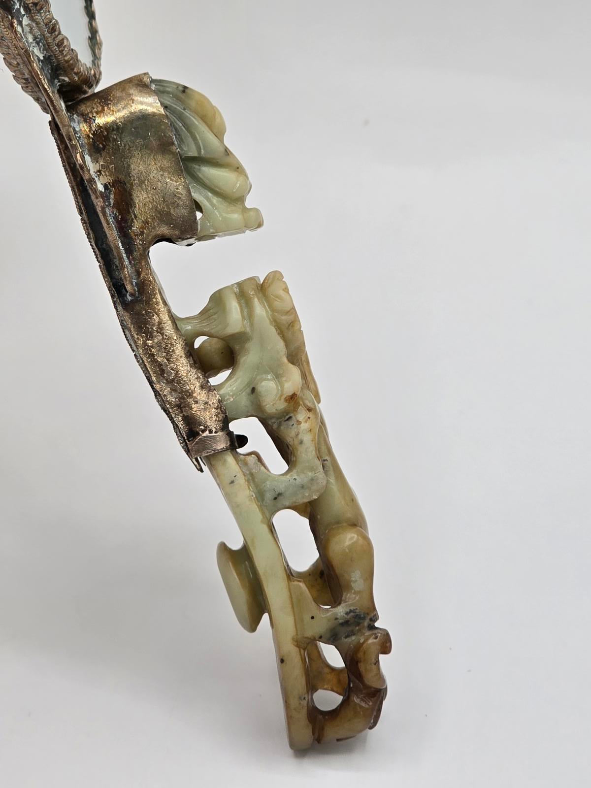 Often given as a wedding present, the older jade would be carved from a belt hook with an animal head and a flowing creature body. The silver-plated repousse back would be added to the handle, which has an intricate carving of a dragon surrounded by beautiful scrollwork. Circa late 1800's-early 20th century. Condition shows natural jade imperfections and wear consistent with age and use. Approximately 8.5" x 3.5" x 1.25"