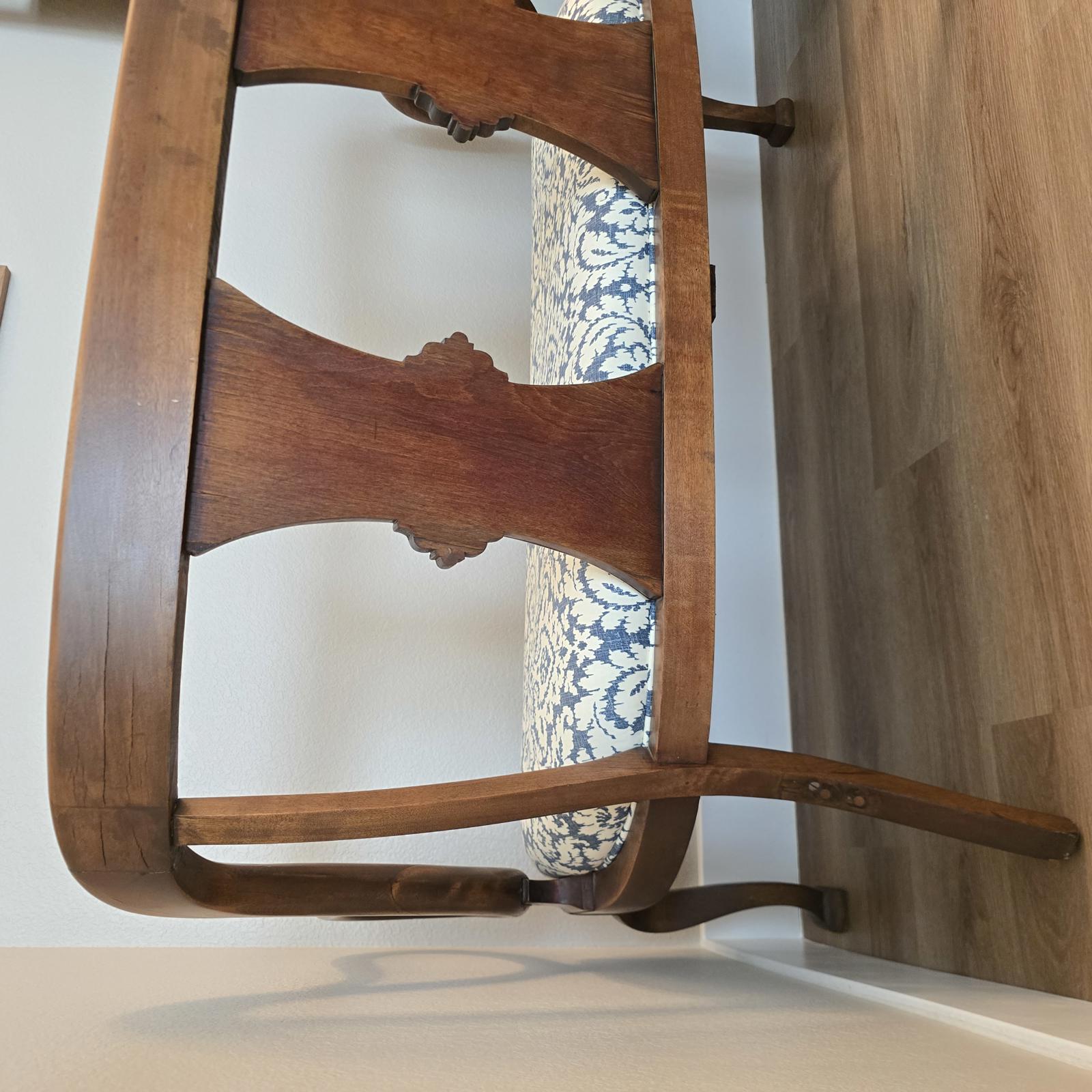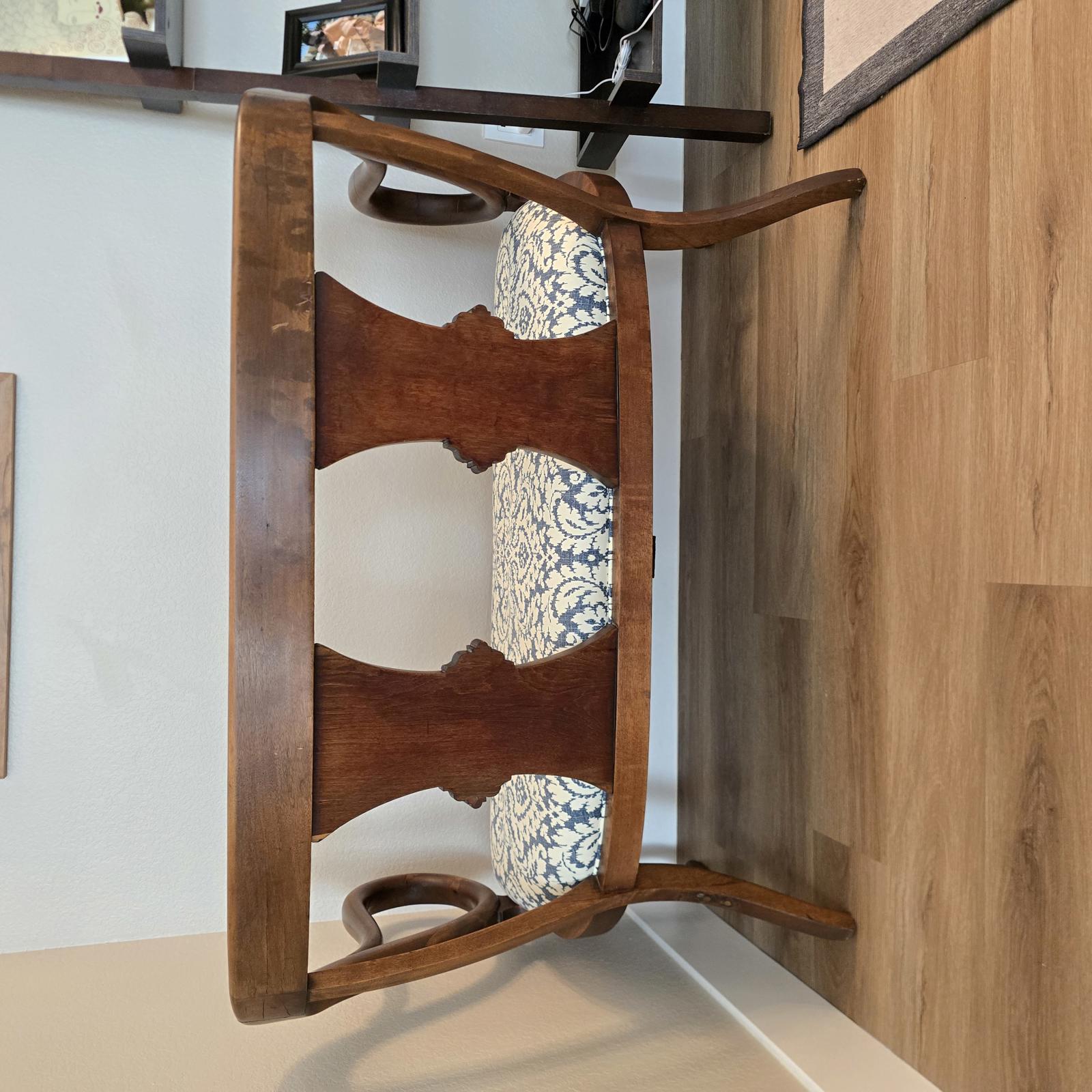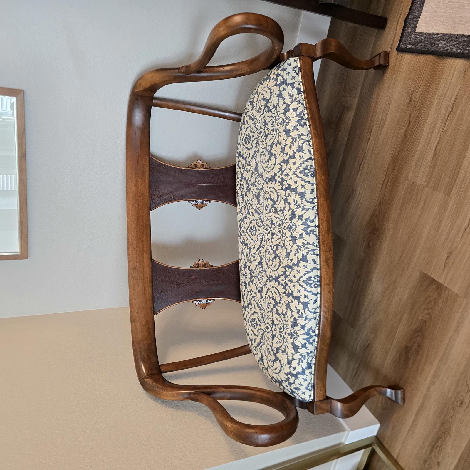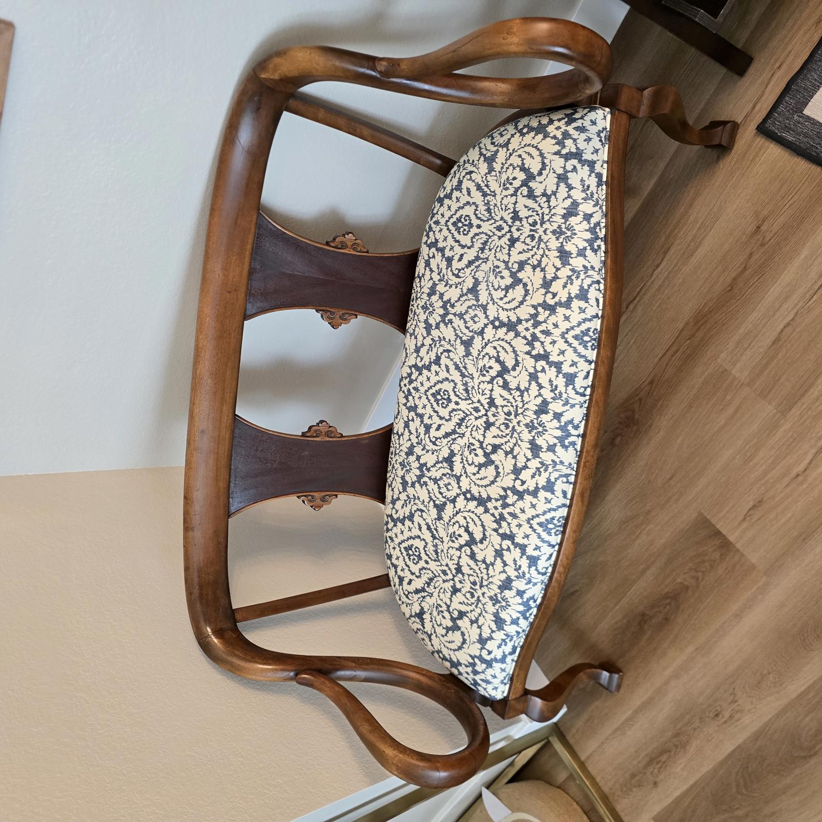 Fabulous, hand-crafted bench/settee with distinctive, scrolled arms, a detailed splat back, and cabriole legs. The walnut frame curves and has a flowing silhouette that is sculptural, and appears almost animated. The seat has been professionally upholstered with custom trim in a blue and cream damask fabric. This settee is a curated, statement piece which will look great in any setting. c. 1900. The settee has been previously repaired and the frame has wear consistent with age and use. Please refer to photos for condition. Approximate measurements 48.5"W x 24.5"D" x 33"H. Seat height 17" x 19" depth