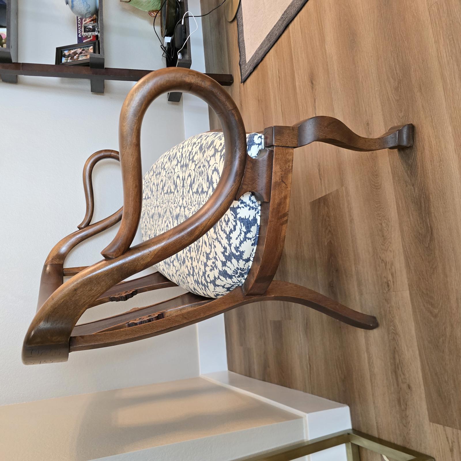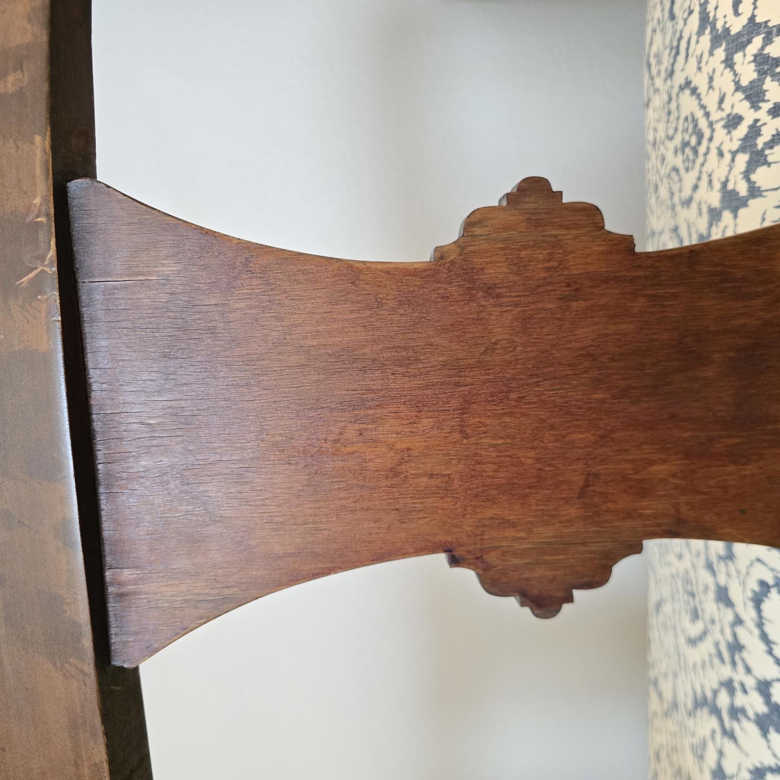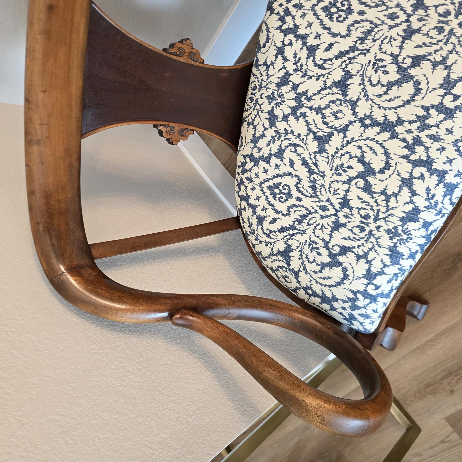 Fabulous, hand-crafted bench/settee with distinctive, scrolled arms, a detailed splat back, and cabriole legs. The walnut frame curves and has a flowing silhouette that is sculptural, and appears almost animated. The seat has been professionally upholstered with custom trim in a blue and cream damask fabric. This settee is a curated, statement piece which will look great in any setting. c. 1900. The settee has been previously repaired and the frame has wear consistent with age and use. Please refer to photos for condition. Approximate measurements 48.5"W x 24.5"D" x 33"H. Seat height 17" x 19" depth