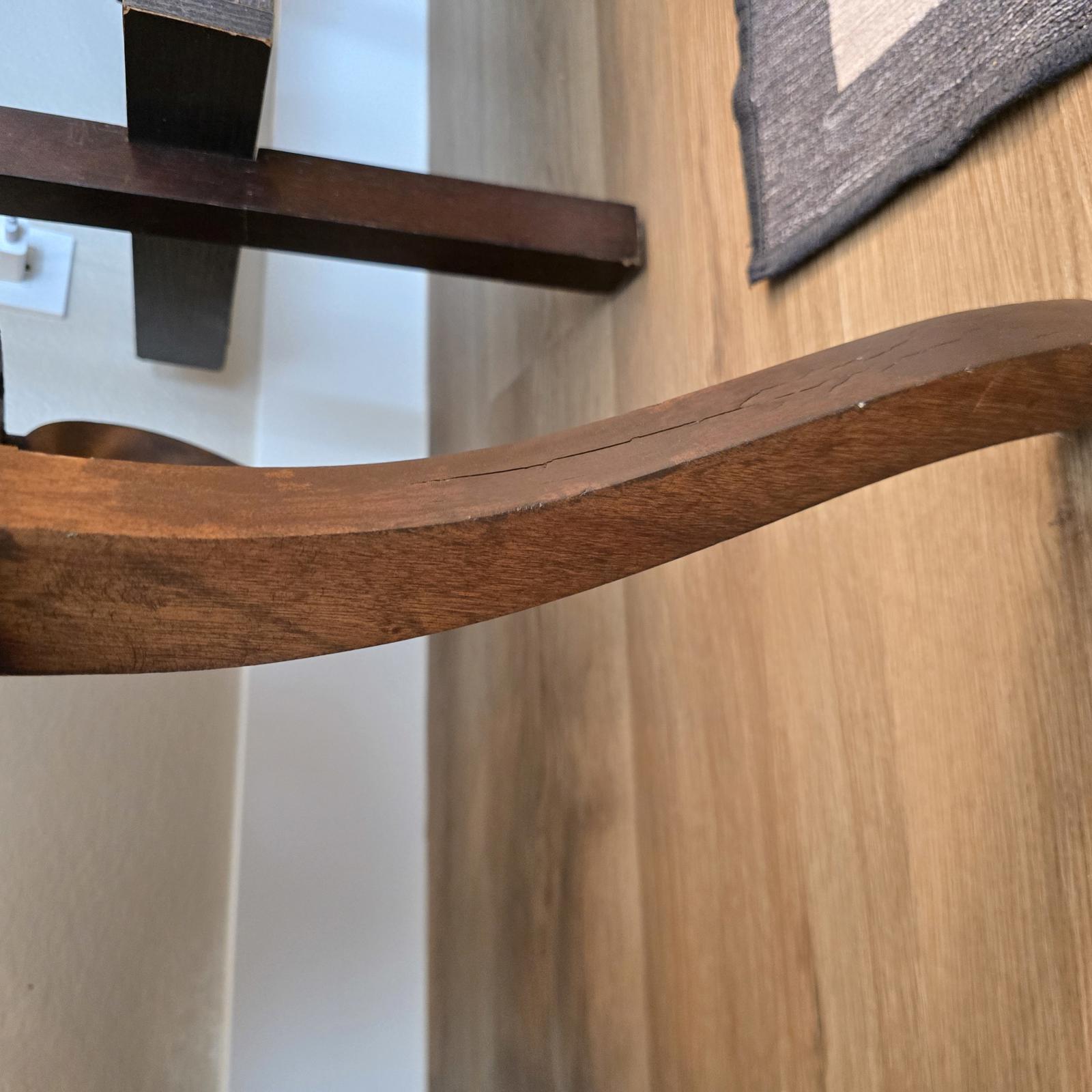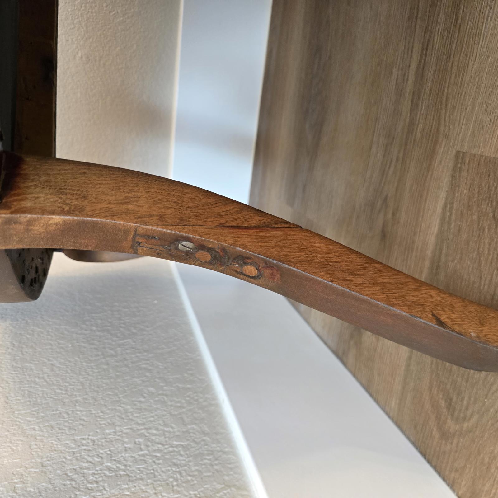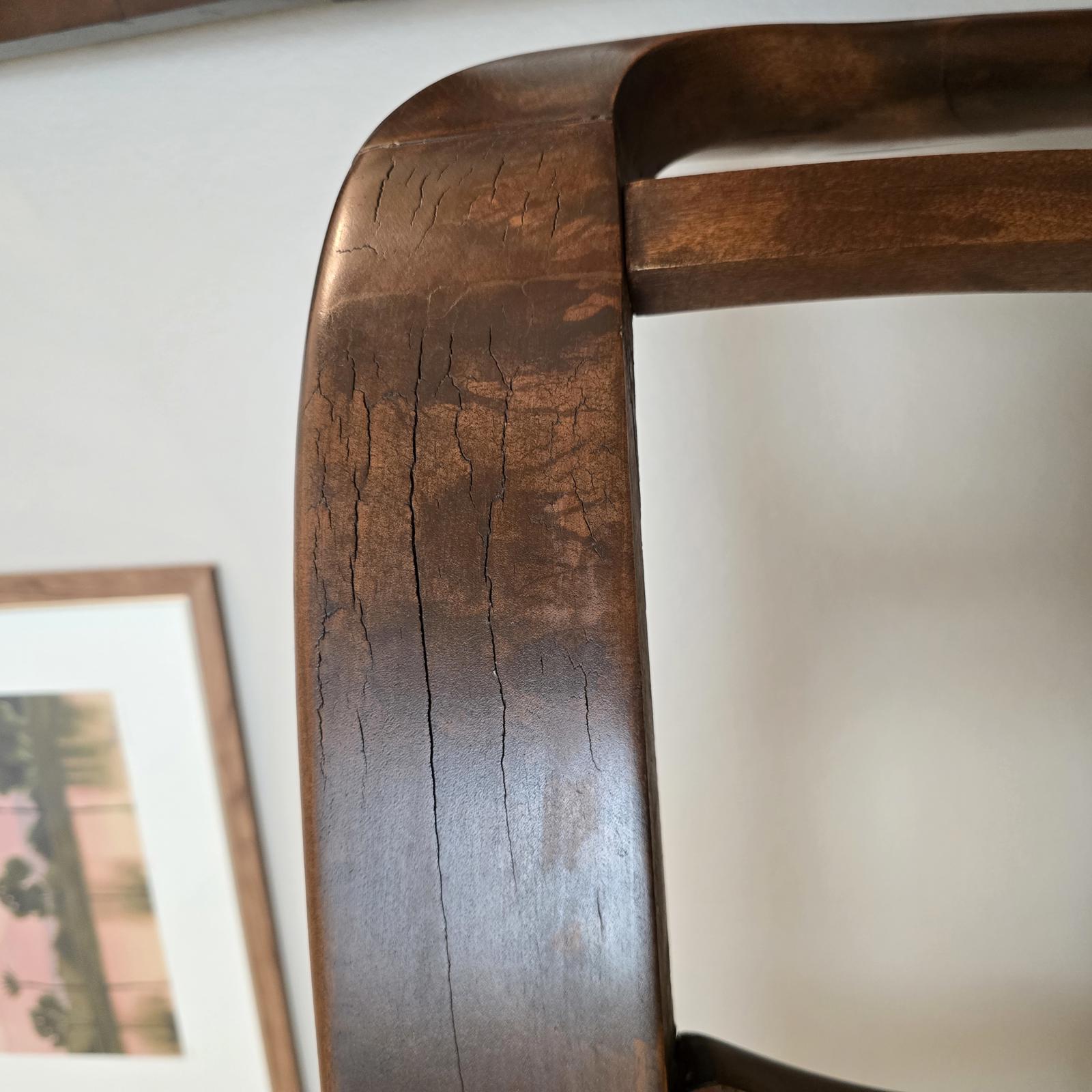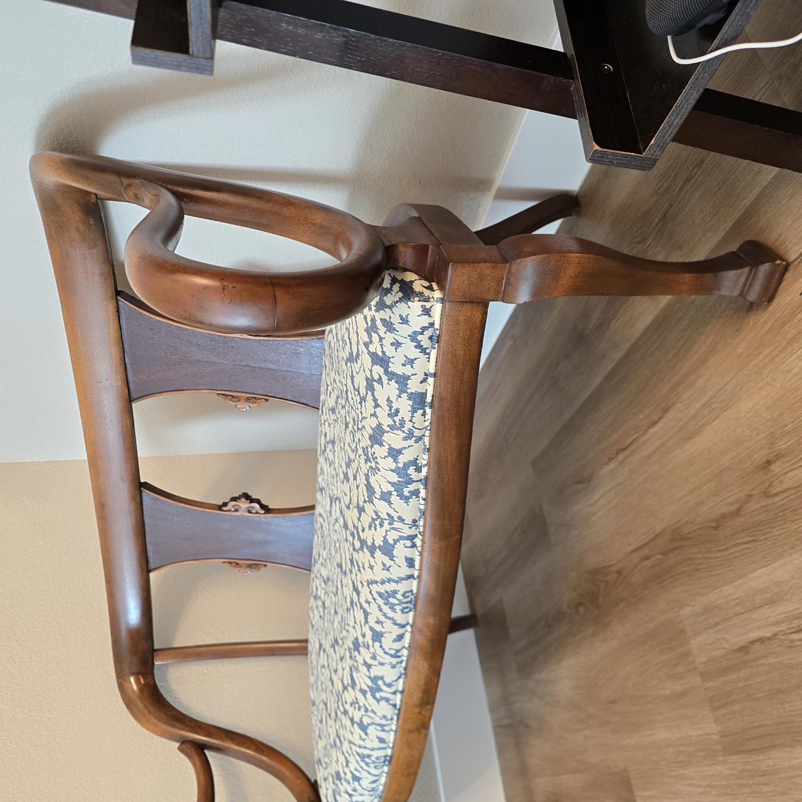 Fabulous, hand-crafted bench/settee with distinctive, scrolled arms, a detailed splat back, and cabriole legs. The walnut frame curves and has a flowing silhouette that is sculptural, and appears almost animated. The seat has been professionally upholstered with custom trim in a blue and cream damask fabric. This settee is a curated, statement piece which will look great in any setting. c. 1900. The settee has been previously repaired and the frame has wear consistent with age and use. Please refer to photos for condition. Approximate measurements 48.5"W x 24.5"D" x 33"H. Seat height 17" x 19" depth