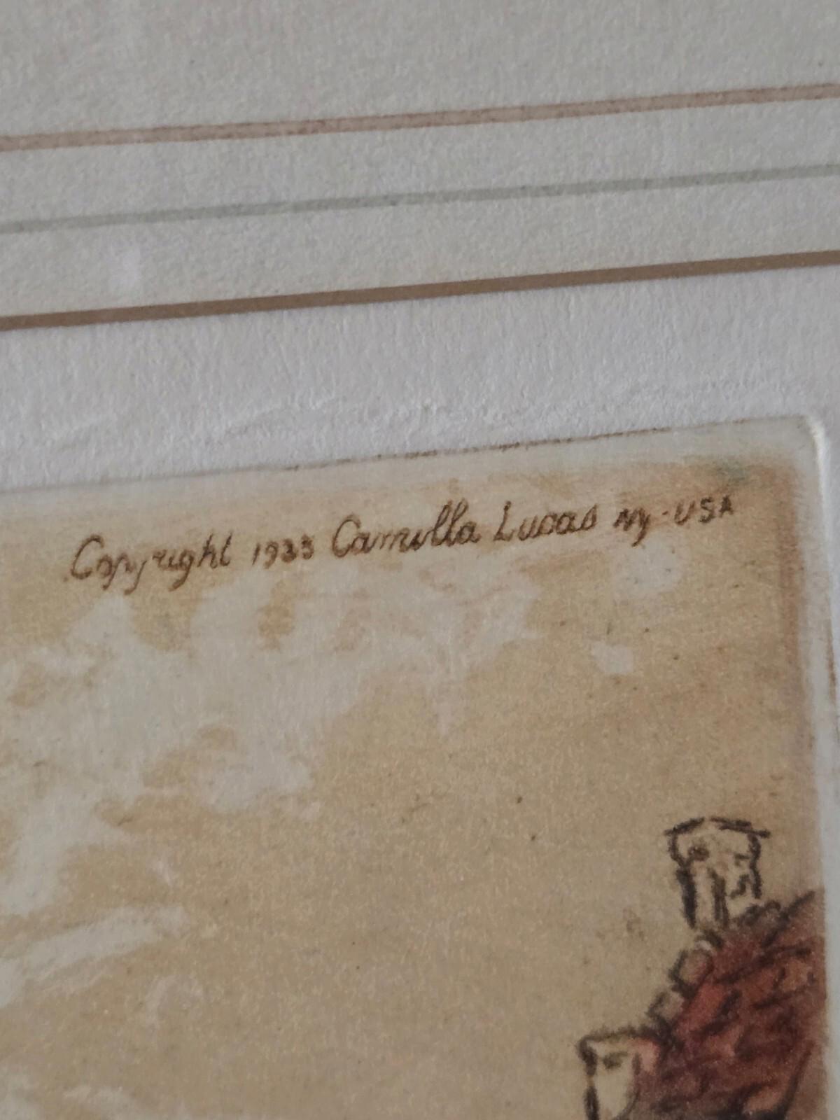 Rare to find such a vibrant and detailed etching in color. In the lower left hand corner, the etching is hand titled in pencil and the hallmark SZL appears above it. It is signed in pencil by the artist Florence, in the lower right corner. Printmaker Sydney Z. Lucas owned the Old Print Center in New York and ran the Camilla Lucas Gallery whose copyright is in the upper right corner. Lucas formed the Paris Etching Society when he traveled to Europe to commission primarily French artists to produce original country scenes. Vintage, matted and framed. Measures 10" wide and 14" tall.