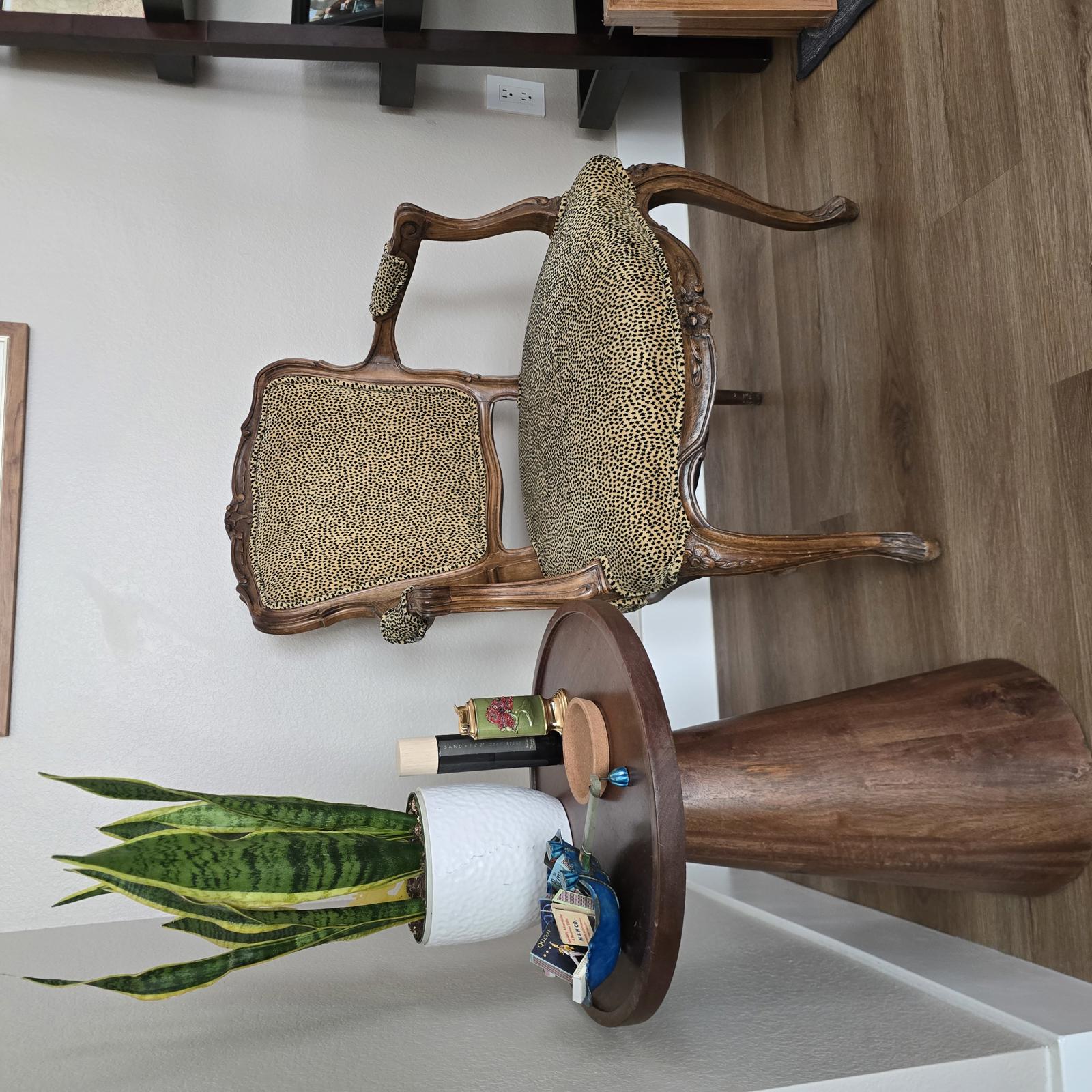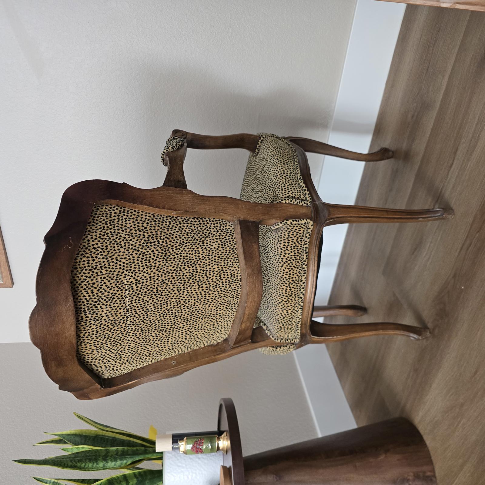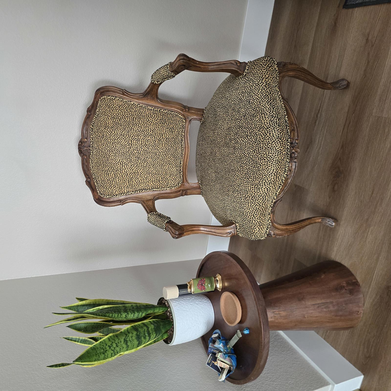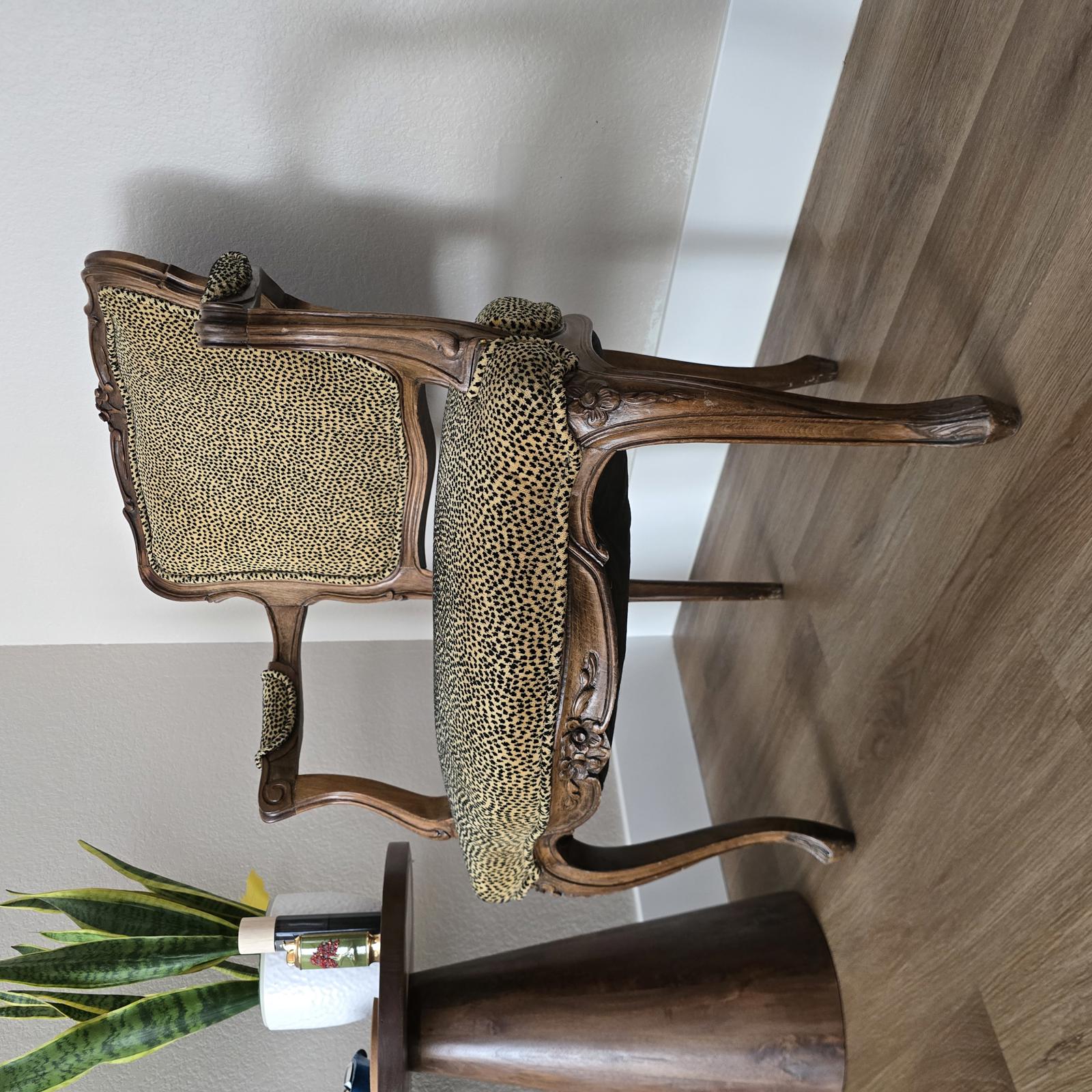 Elegant chair upholstered in velvet cheetah-print fabric and a detailed carved wood frame. A great accent chair for anywhere in your home. Minimal wear consistent with age and use. A sliver of wood has been shaved from the very top of the chair which should be relatively easy to repair or restore. The condition is reflected in the pricing. Measurements 34-5/8"T x 23-1/2"W x 26"D. Seat height 18".