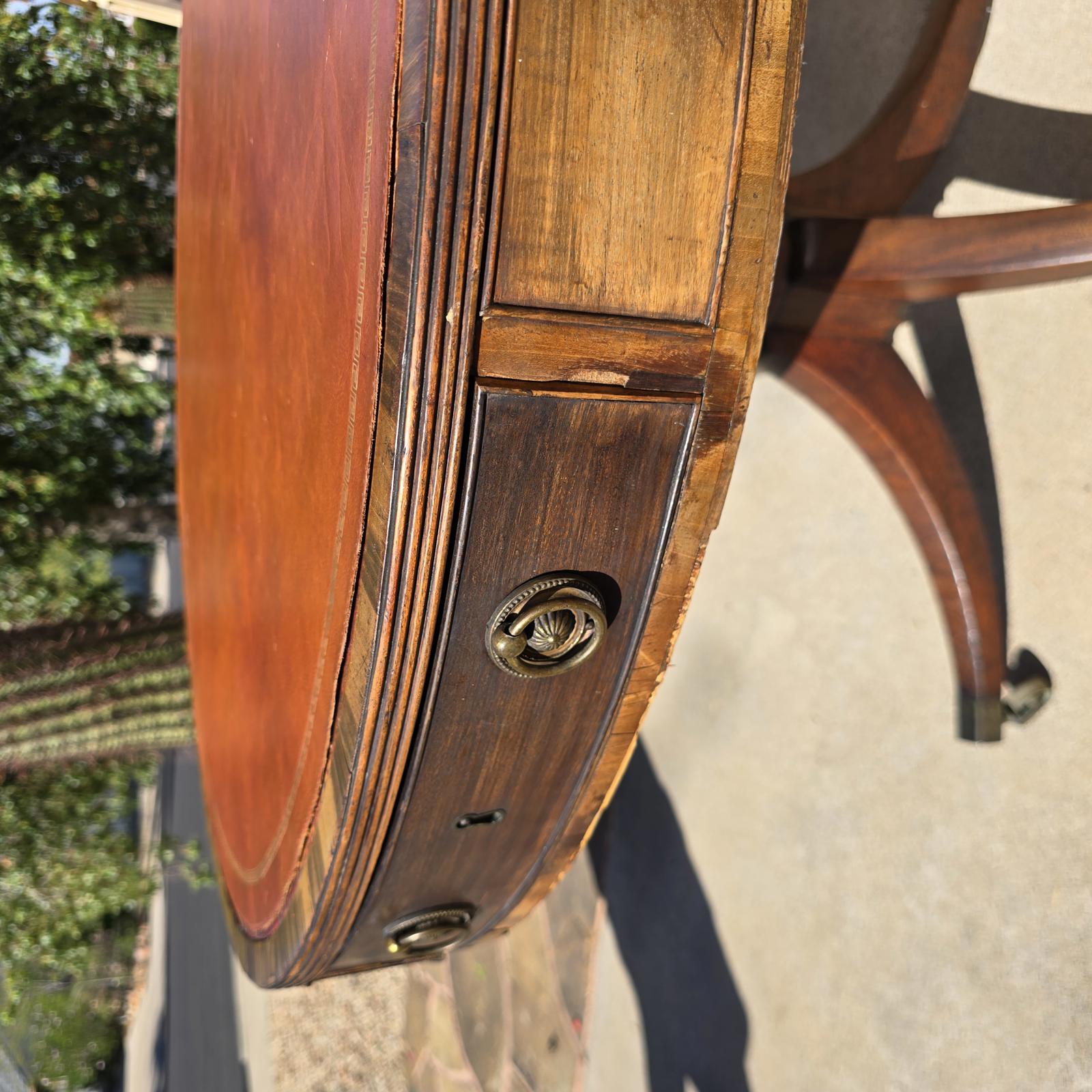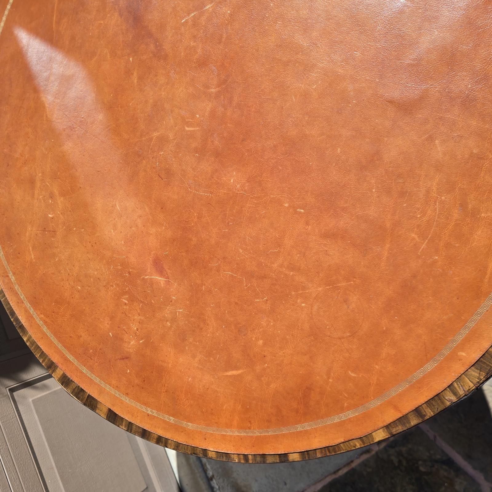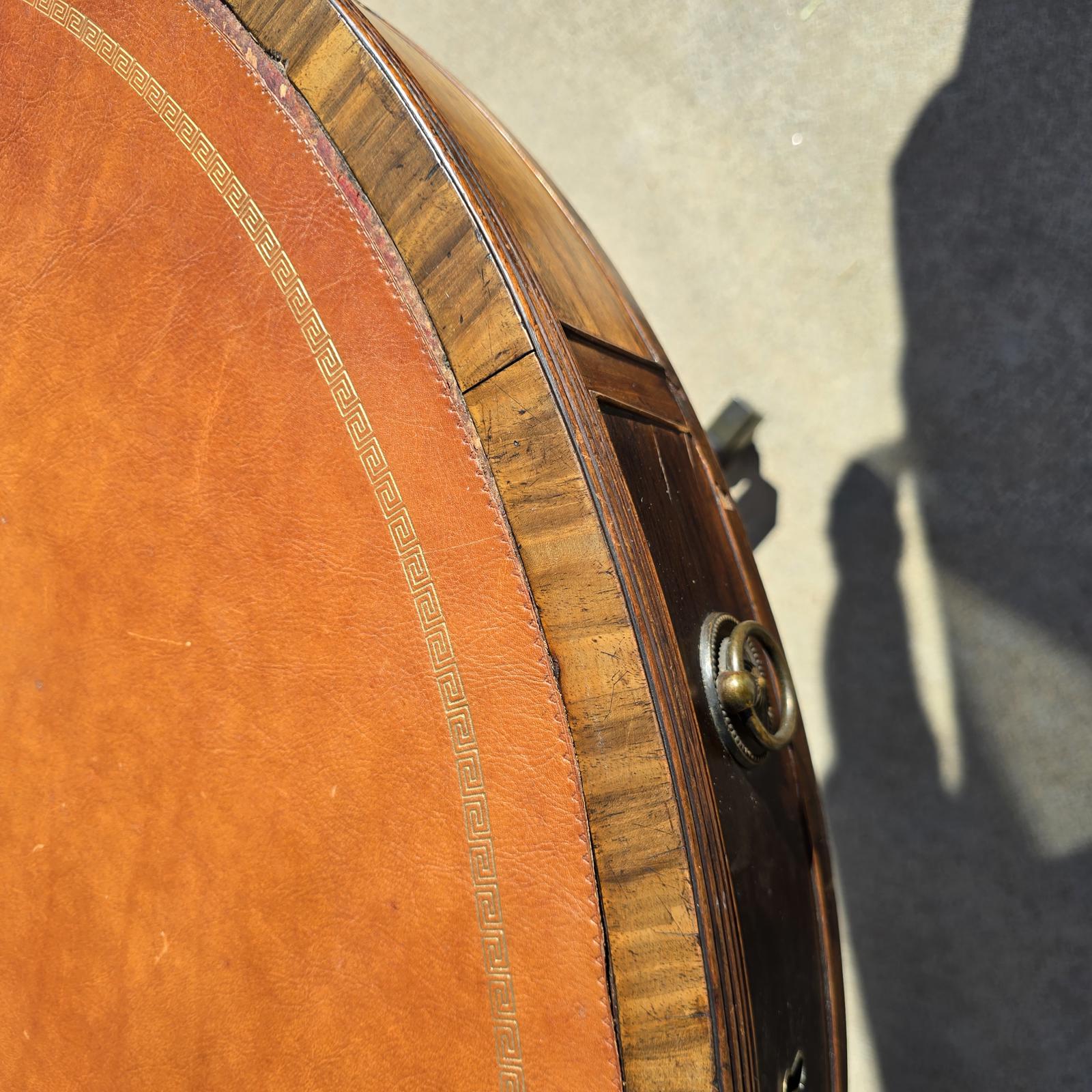 Mid-late 19th century antique English drum table with a gold-embossed, leather top(which is in good condition). An elegant, curated addition to your foyer or living room. This hand-crafted mahogany table features 4 dove-tailed drawers(2 deep and 2 shallow), brass pulls, escutcheon plates, and casters. Unfortunately, the key for the lock has been lost. It appears that the previous owner removed the leather top in order to begin refinishing the table. The restoration was not completed and the leather was not re-adhered to the table. A glass top was placed over the table to protect the leather and the wood. The drum table is currently in "good antique condition" consistent with age and use; or it could be an interesting project or opportunity. Please refer to photos as they are part of the description. The condition has been factored into the price as the appraised value(if the leather top was adhered to the table), is $1000-$1500. Approximately 39"D x 29-3/8"H.