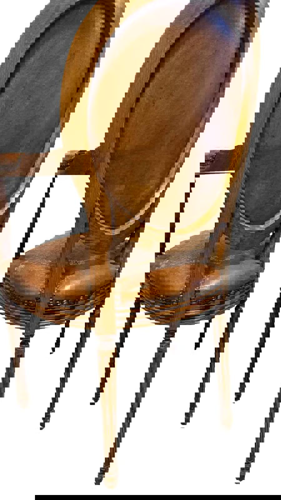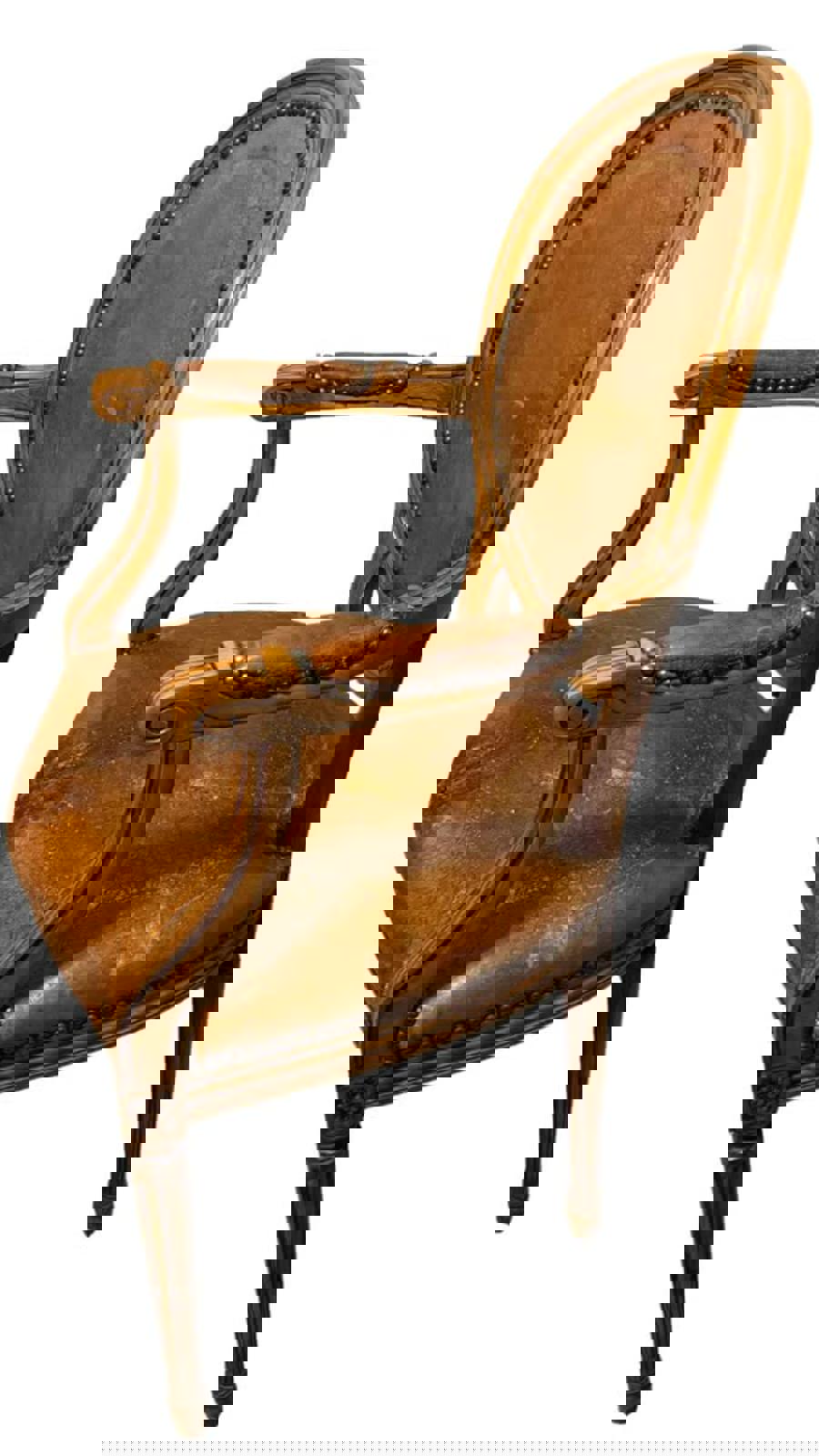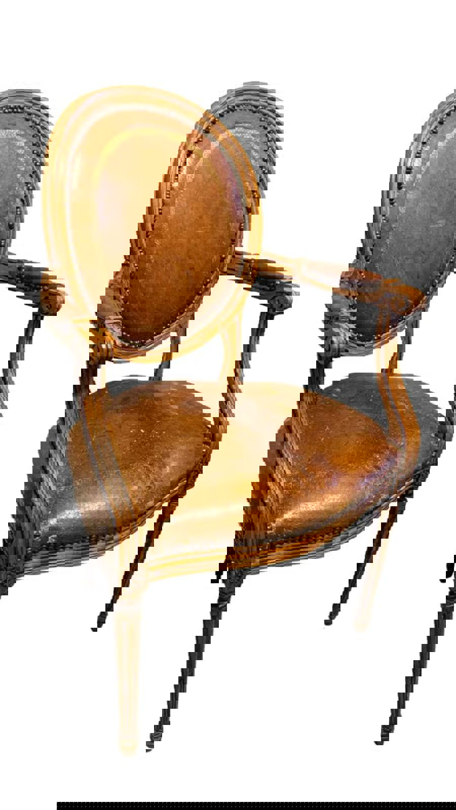 Leather and Wood French Louis XVI Style with cameo back and gilded leather seat. Fauteuil arm chair needs restoration of the frame, under the seat and the leather. Early 1920's. Measures 37.75" tall, 22.5" wide, 22.75" deep from front of seat to back of the backrest. Seat height is 19".
