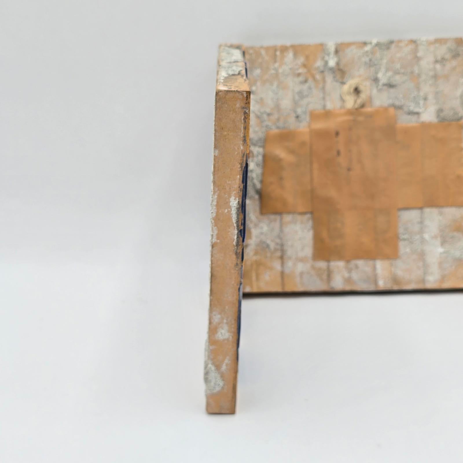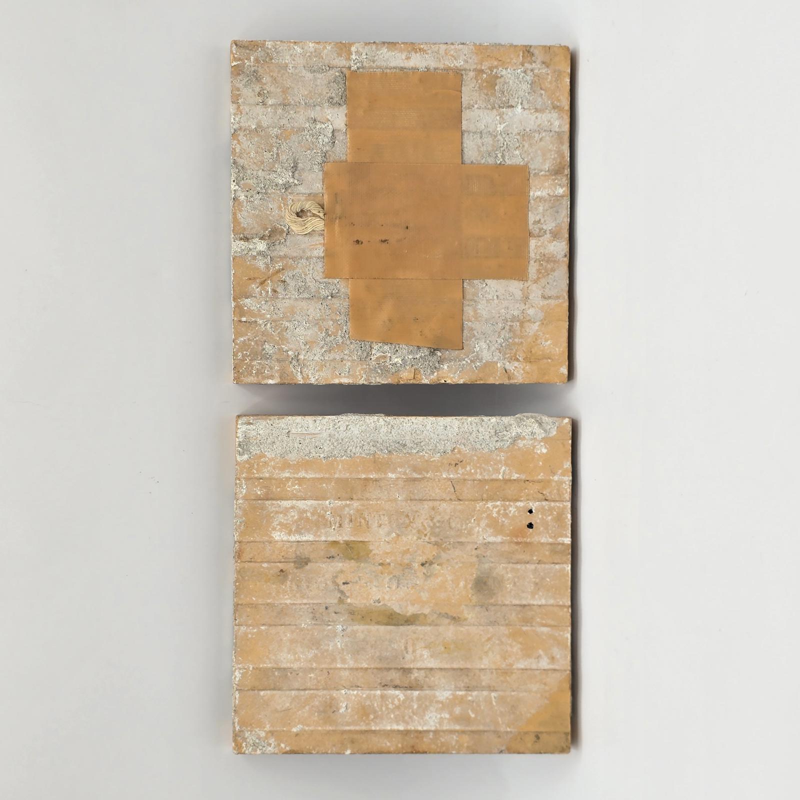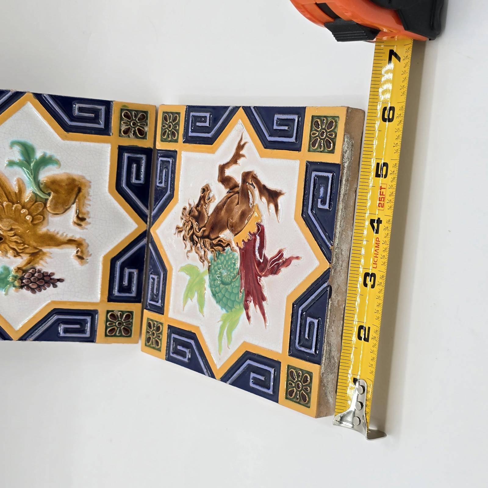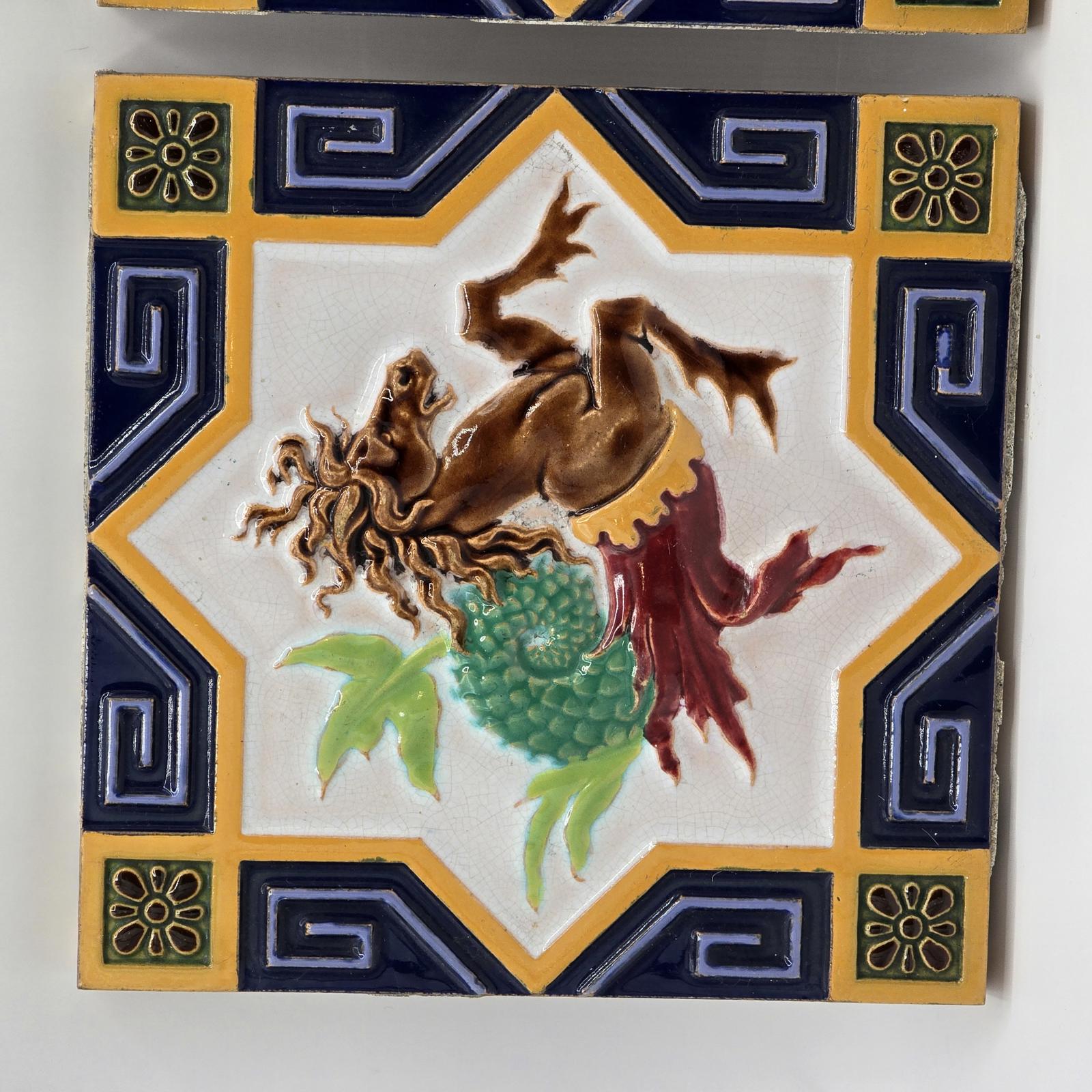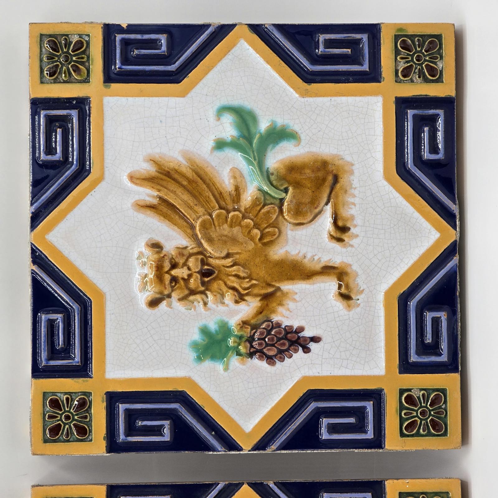 A pair of Victorian Majolica(encaustic), tiles c.1860/1870. Glazed, relief-molded, dust-pressed clay with Minton & Co, Stoke-on-Trent, molded backstamp. The first tile depicts a griffin holding a bunch of grapes, the second a hippocampus(Greek mythological creature, 1/2 horse-1/2 fish), each with a patterned border and floral medallions in the corners. Vivid color, texture, and detail. Please refer to photos for condition. 6" x 6" x .5".
