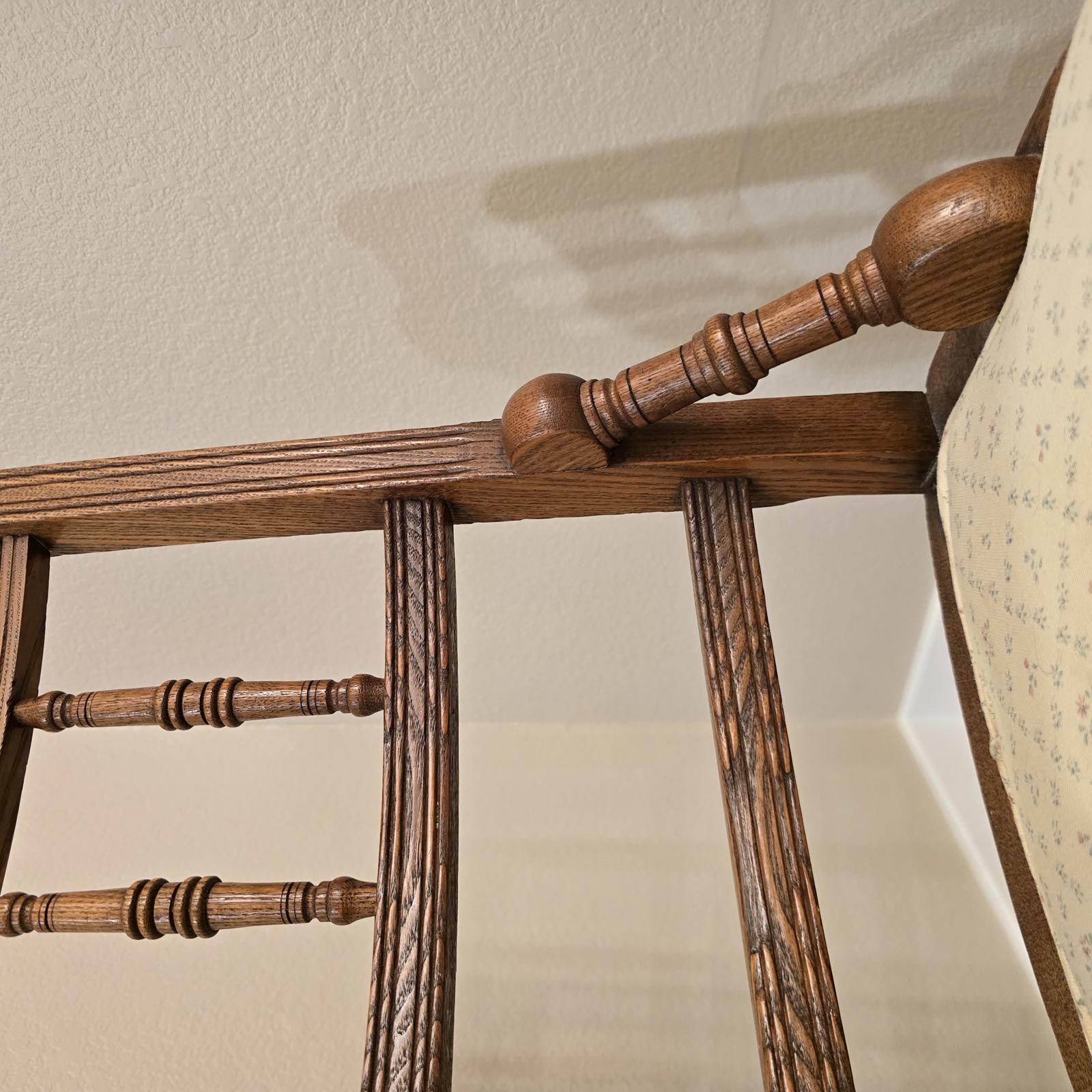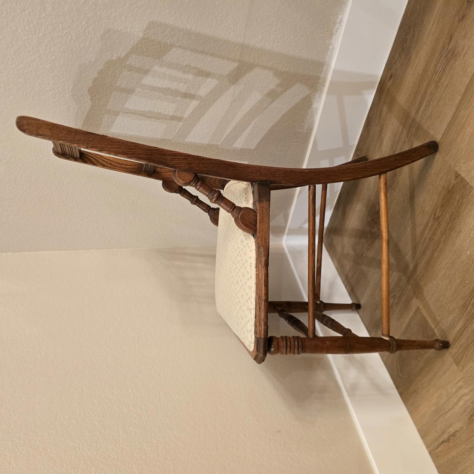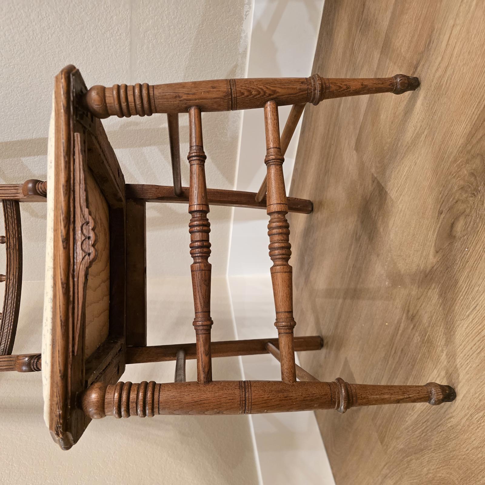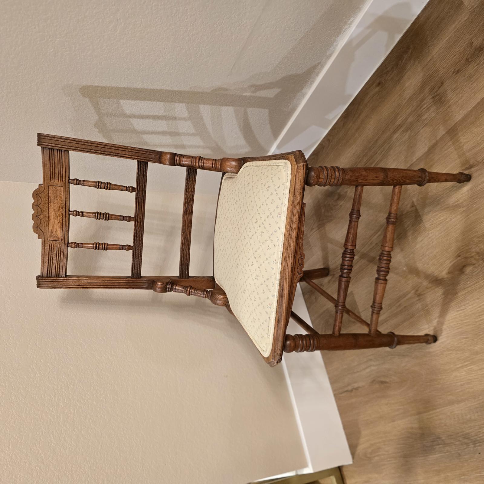 Beautiful handcrafted accent chair with intricately carved spindles and woodwork. The distinctive hip rests are sculptural and the seat has been professionally upholstered in a cream fabric with custom trim. A handsome, curated artisan piece. Please refer to photos as they are part of the description. The condition is good with minimal wear and slight staining on the fabric consistent with age and use. A previous repair was made underneath. Approximate measurements 33"H x 18.75"D x 16.5"W. Seat height 17.5" x 13"deep.