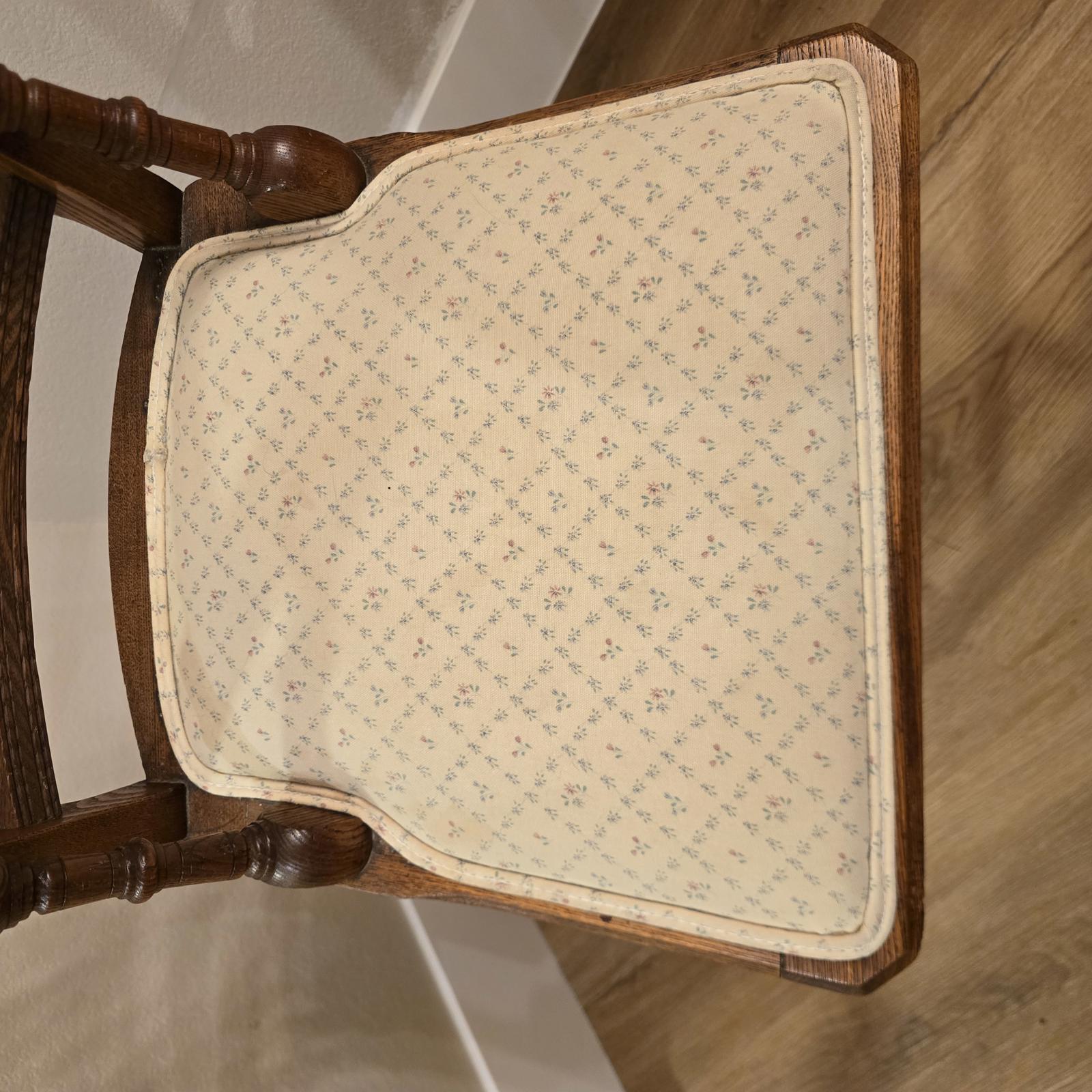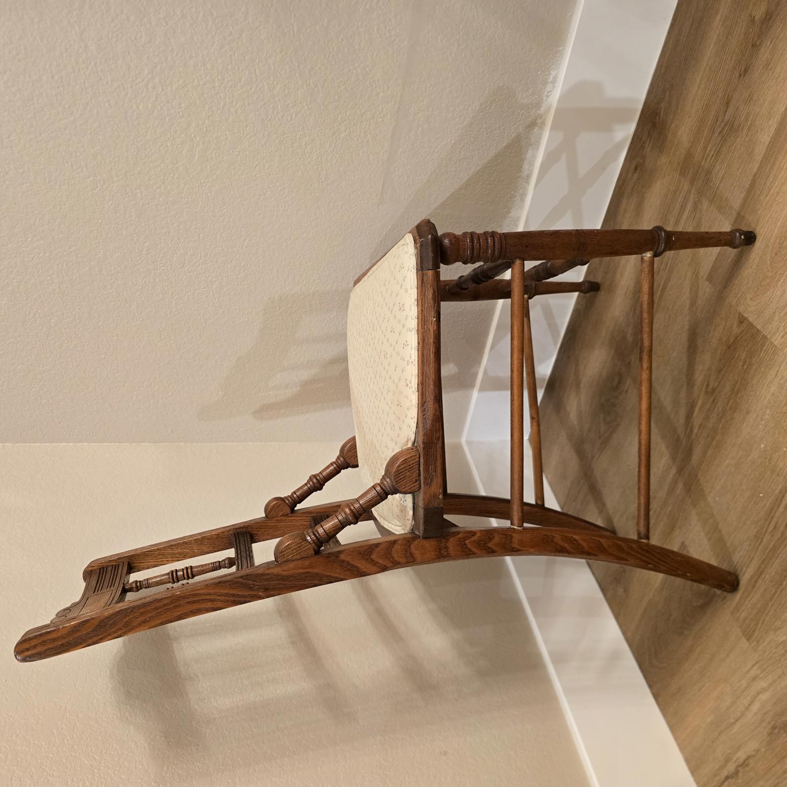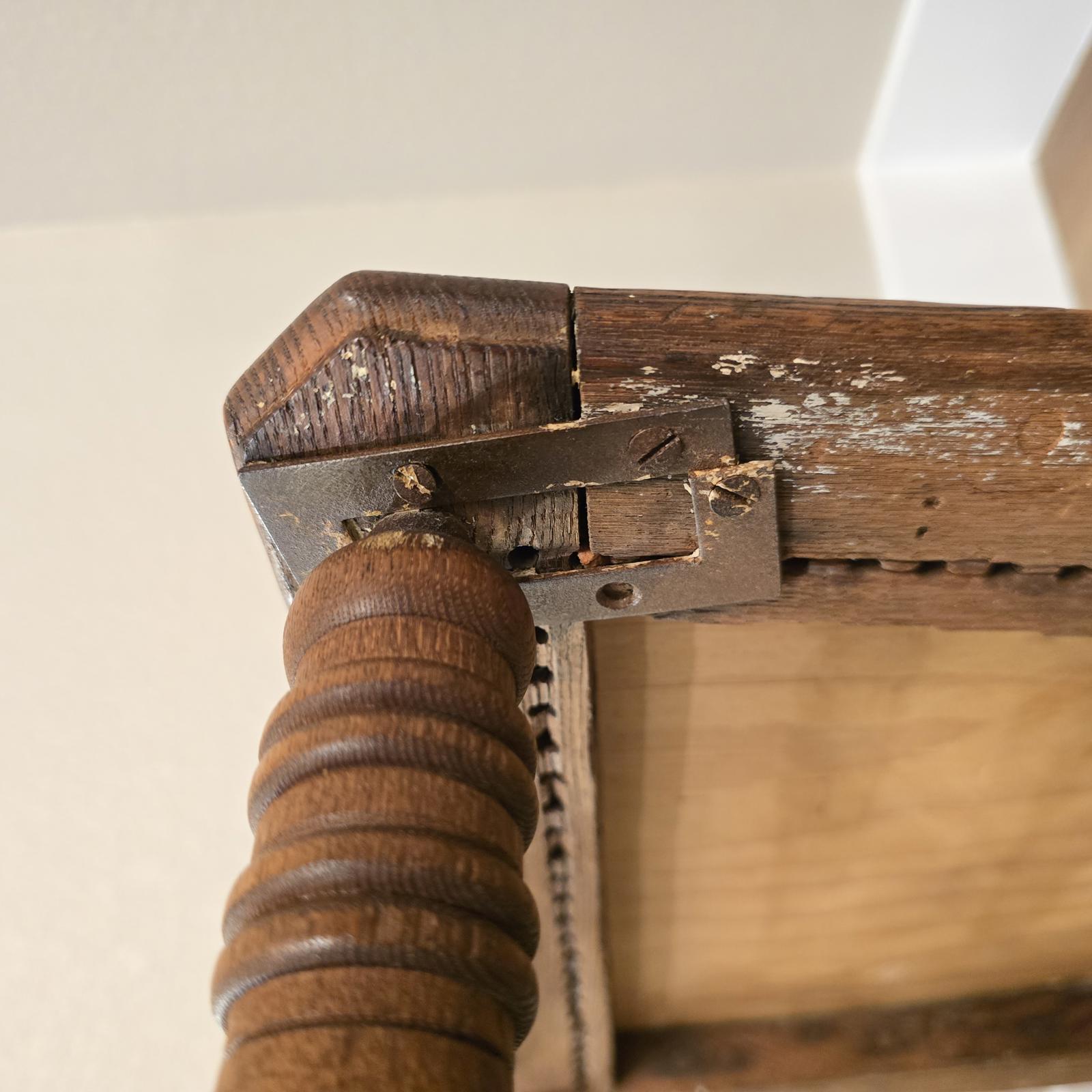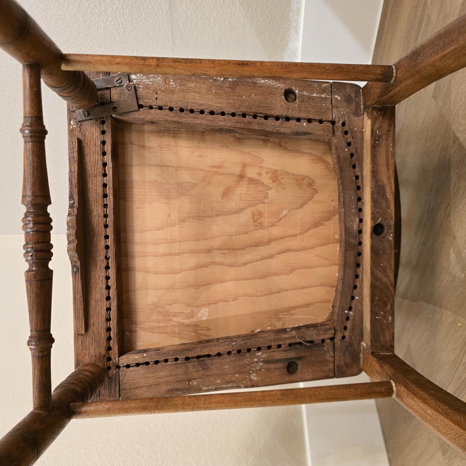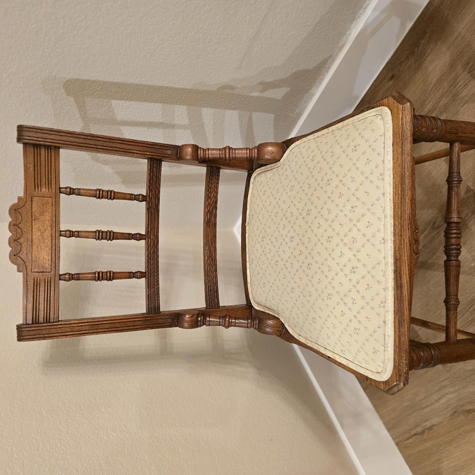 Beautiful handcrafted accent chair with intricately carved spindles and woodwork. The distinctive hip rests are sculptural and the seat has been professionally upholstered in a cream fabric with custom trim. A handsome, curated artisan piece. Please refer to photos as they are part of the description. The condition is good with minimal wear and slight staining on the fabric consistent with age and use. A previous repair was made underneath. Approximate measurements 33"H x 18.75"D x 16.5"W. Seat height 17.5" x 13"deep.