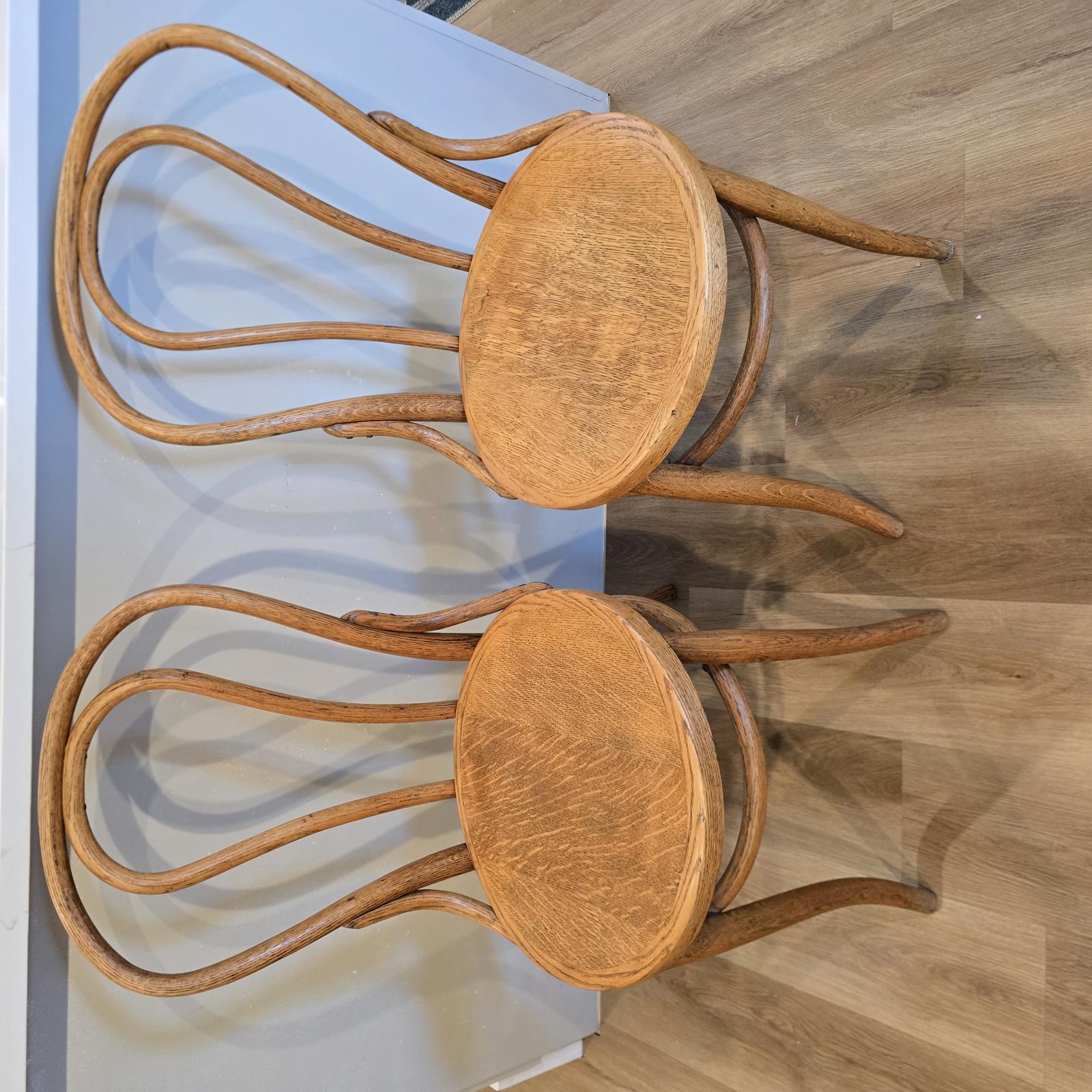 Pair of antique cafe chairs that combine form and function. Steam-bent wood arcs gracefully to create one of the most iconic and recognizable chairs ever produced. Solid wood frame and seat with a sculptural European flair. c.19th- early 20th century. Good condition with wear consistent with age and use. Please refer to photos as they are part of the description. Approximately 34.5"x 16"x16". Seat height 18-3/8" x 16" depth.