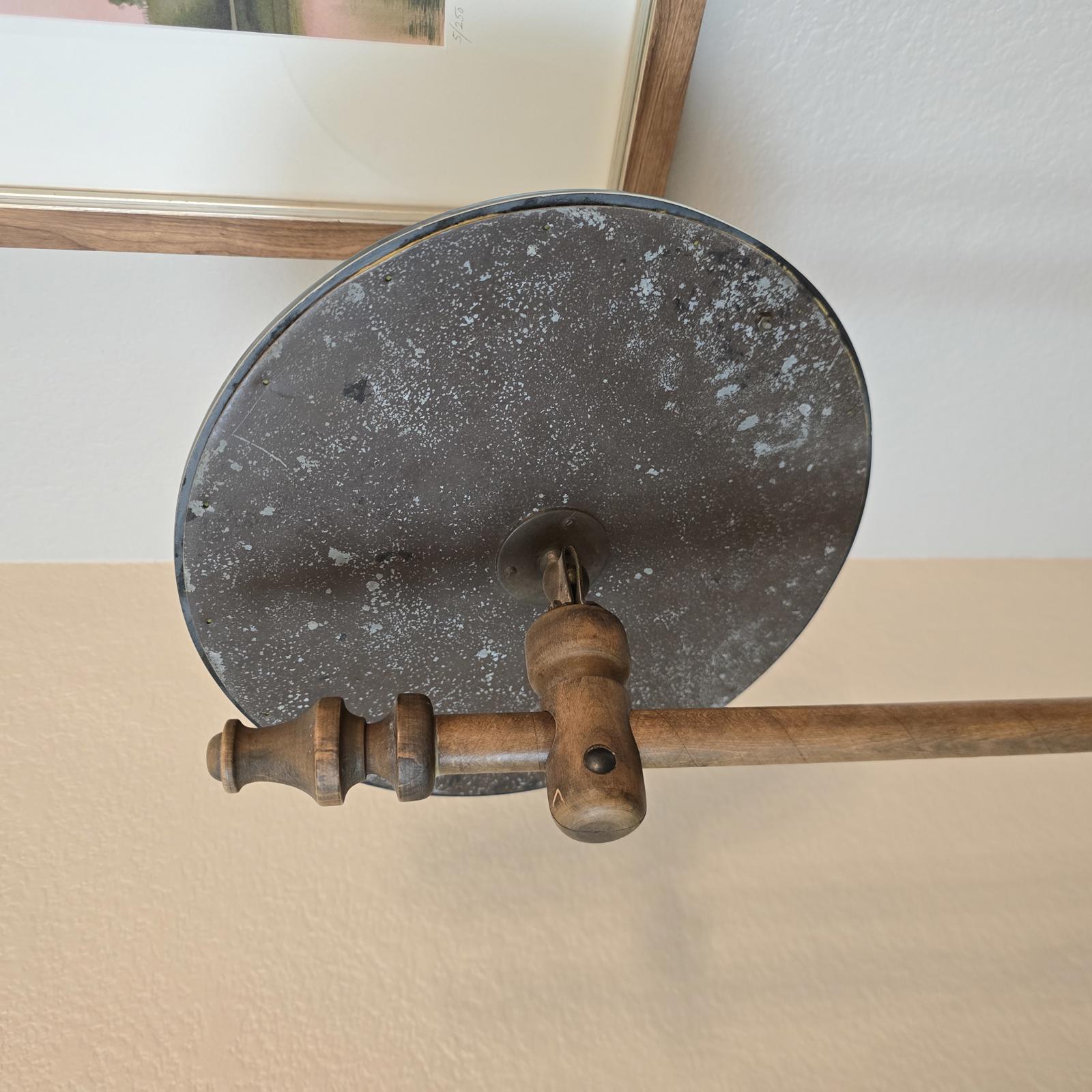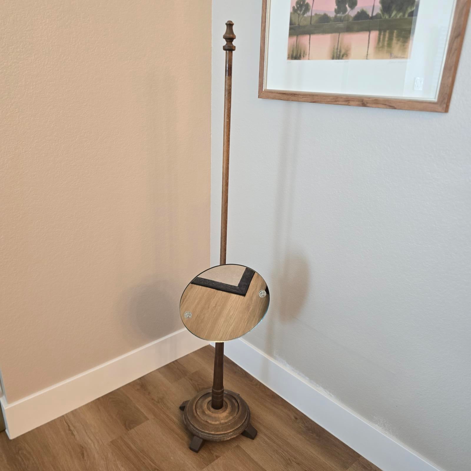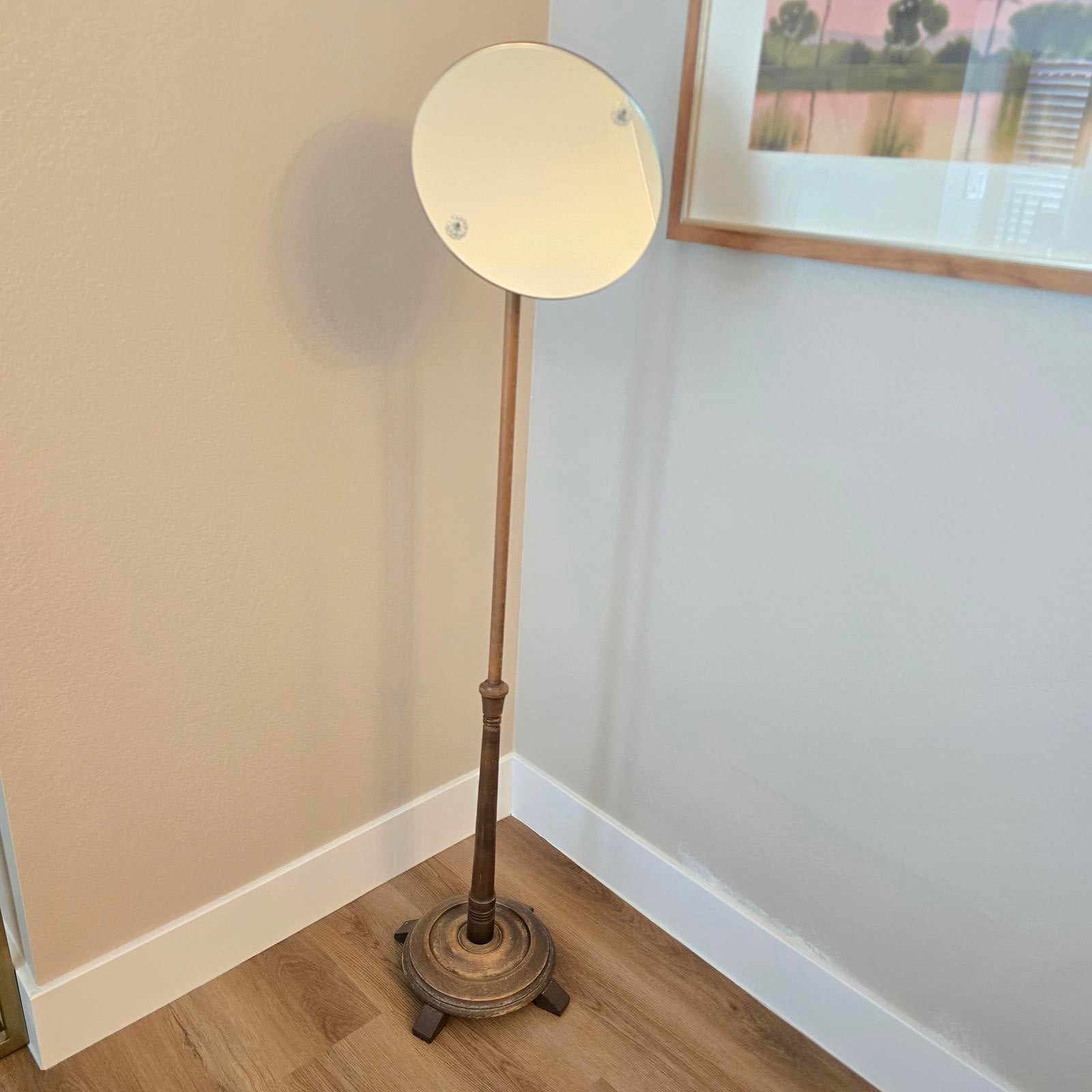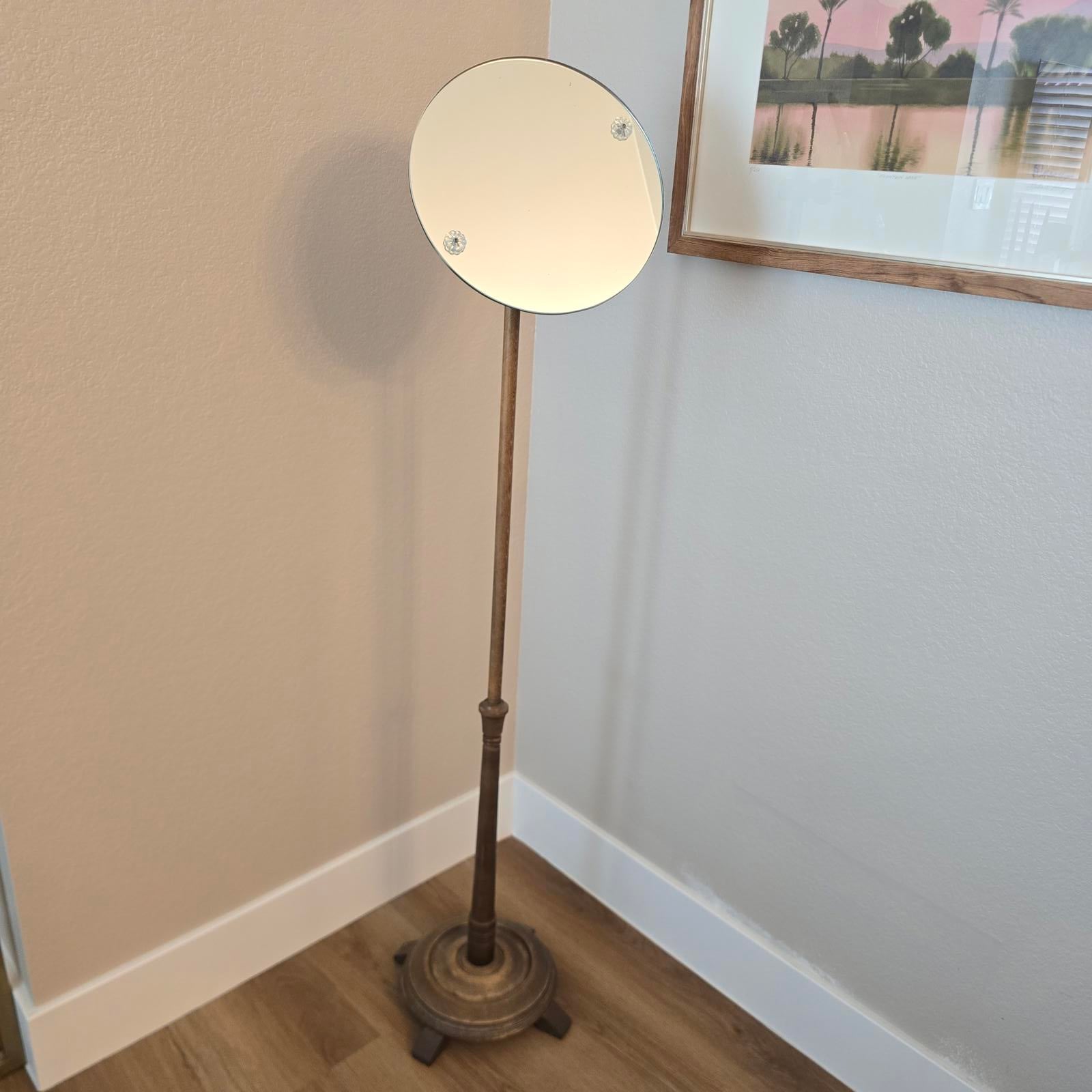 Brass finish, free-standing mirror originally used for shaving or applying cosmetics. The mirror glass has rosette accents and adjusts to tilt to your desired position. It has a substantial metal stand and a solid footed-base. Rare find which will be a great accent in your home. Perfect for salon, barbershop, or retail decor as well. The mirror front itself is in good condition with a few small scratches. The stand and mirror-back both display wear and patina consistent with age and use. Please refer to photos. Height adjusts from 28.5" to 57.25". Mirror diameter 11-3/8". Base Diameter 12-3/4".