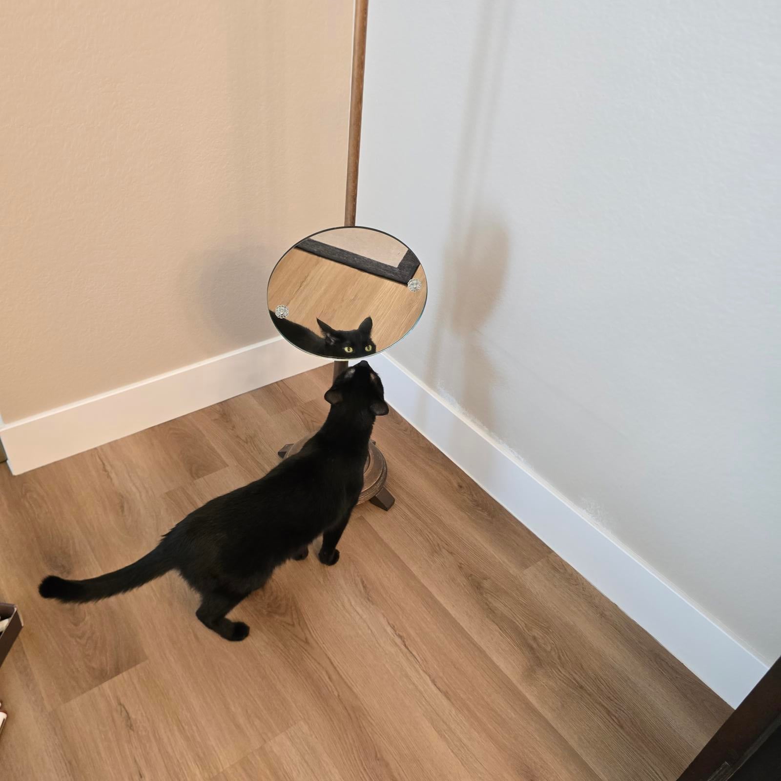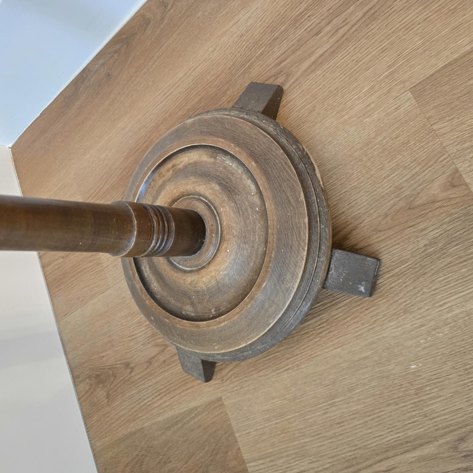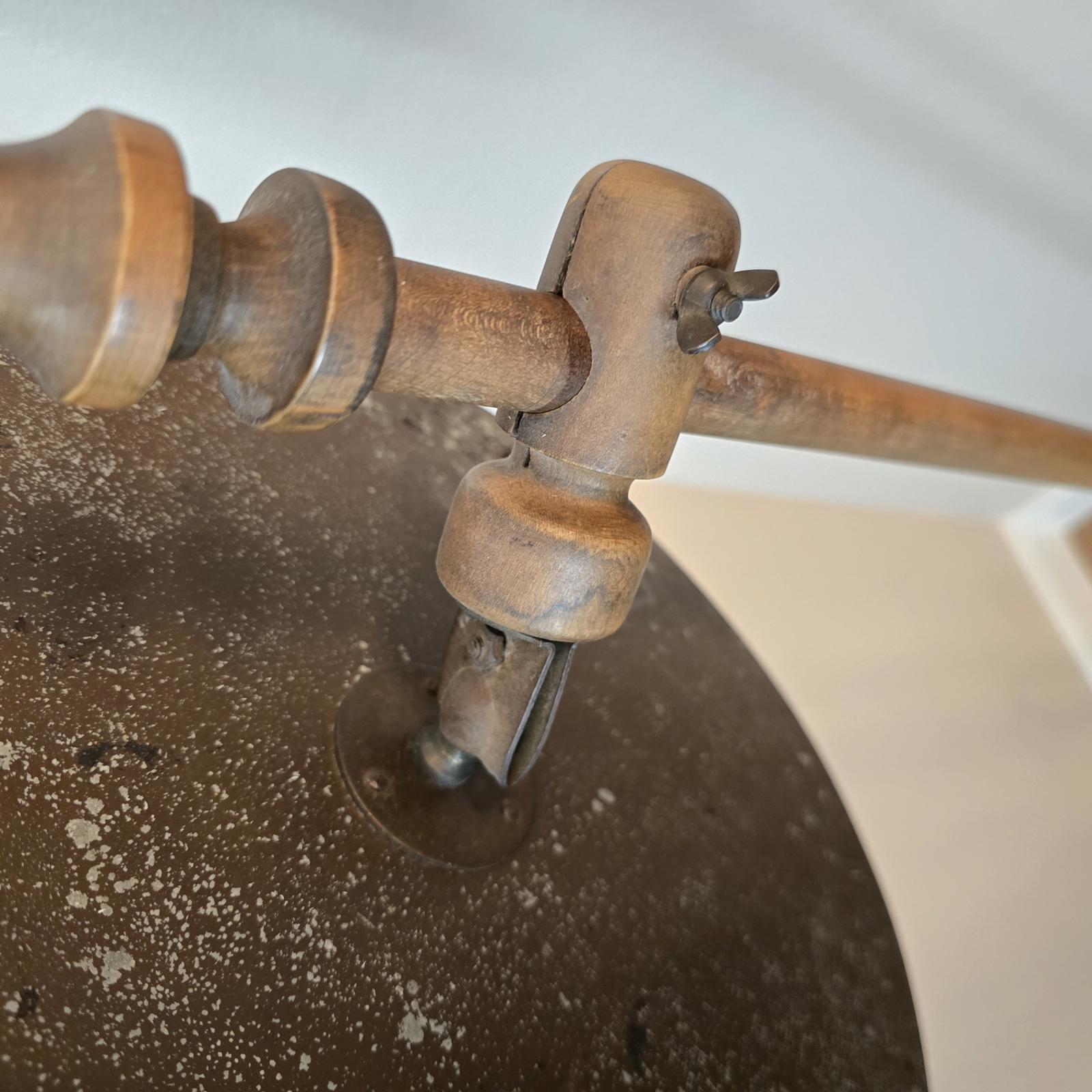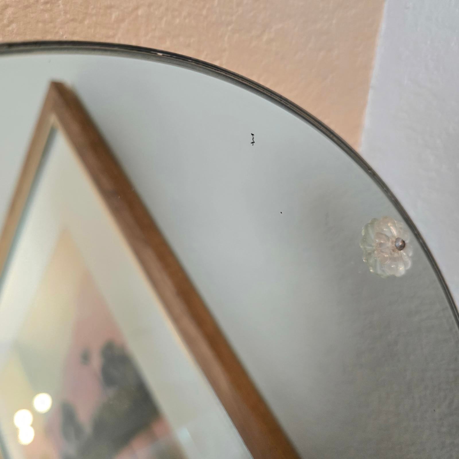 Brass finish, free-standing mirror originally used for shaving or applying cosmetics. The mirror glass has rosette accents and adjusts to tilt to your desired position. It has a substantial metal stand and a solid footed-base. Rare find which will be a great accent in your home. Perfect for salon, barbershop, or retail decor as well. The mirror front itself is in good condition with a few small scratches. The stand and mirror-back both display wear and patina consistent with age and use. Please refer to photos. Height adjusts from 28.5" to 57.25". Mirror diameter 11-3/8". Base Diameter 12-3/4".