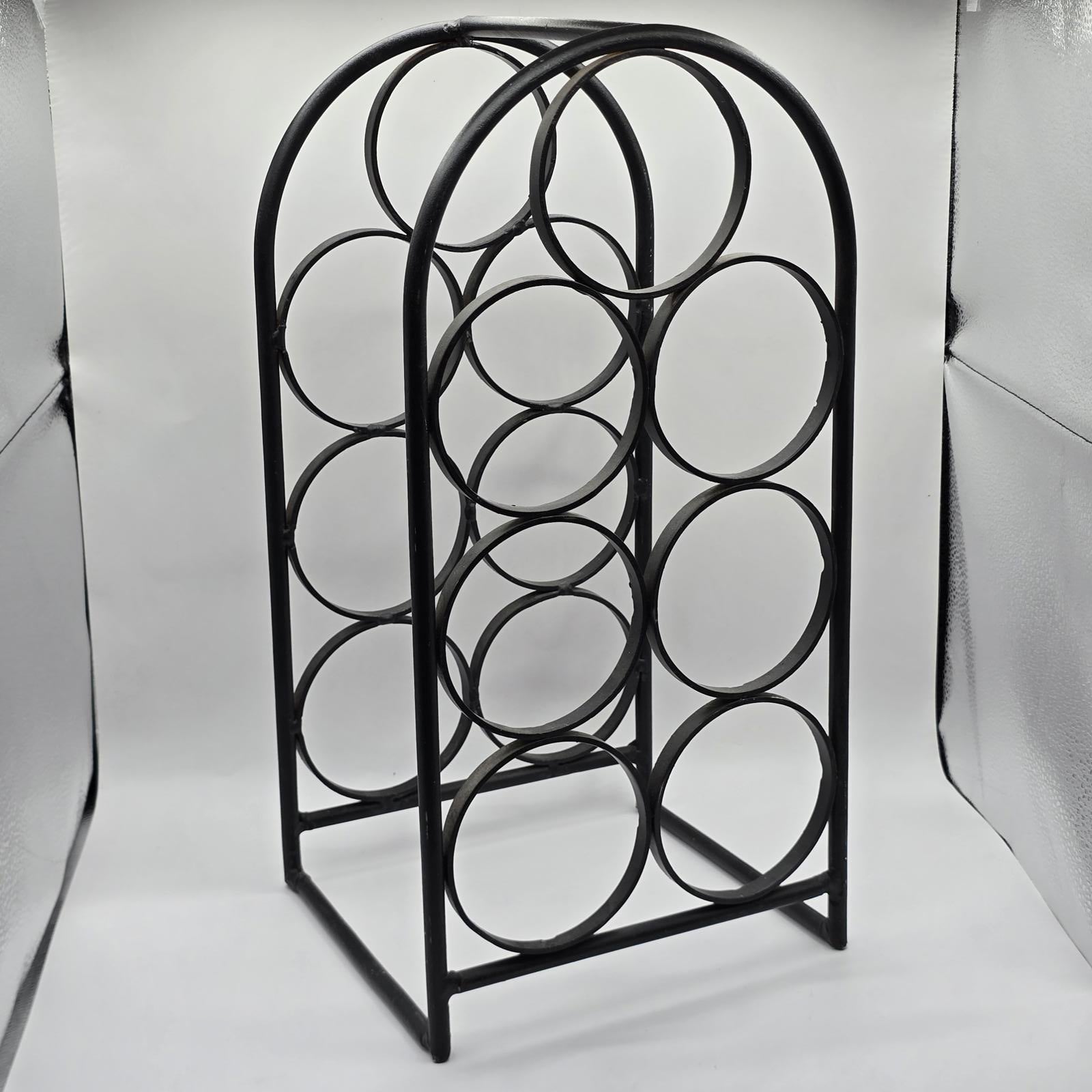 Stylish, free-standing black metal wine rack holds 7 bottles of your favorite vintage. Wear consistent with age and use. Please refer to photos as they are part of the description. Approximately 17.5"T x 8.75"W x 7.75"D.