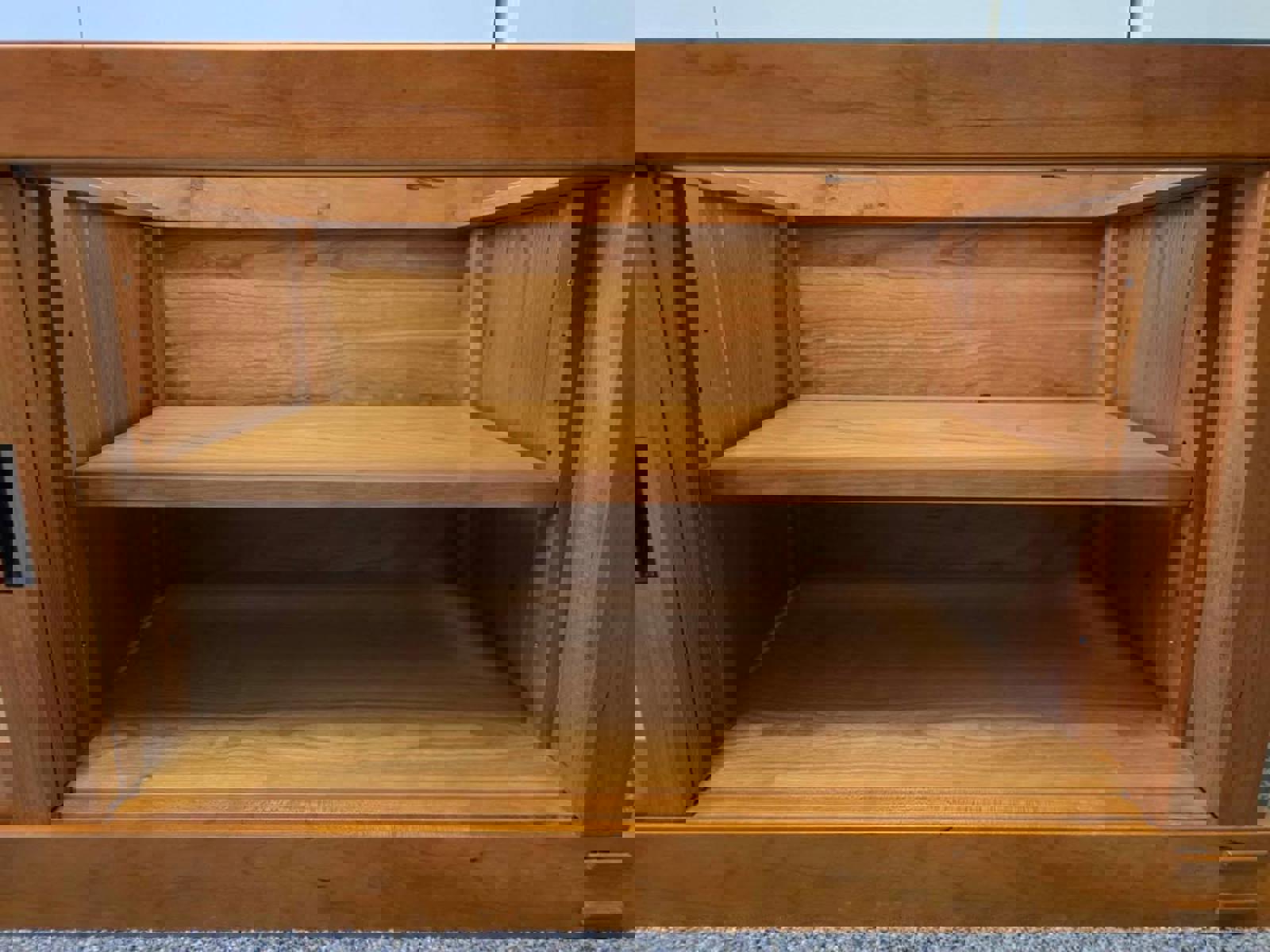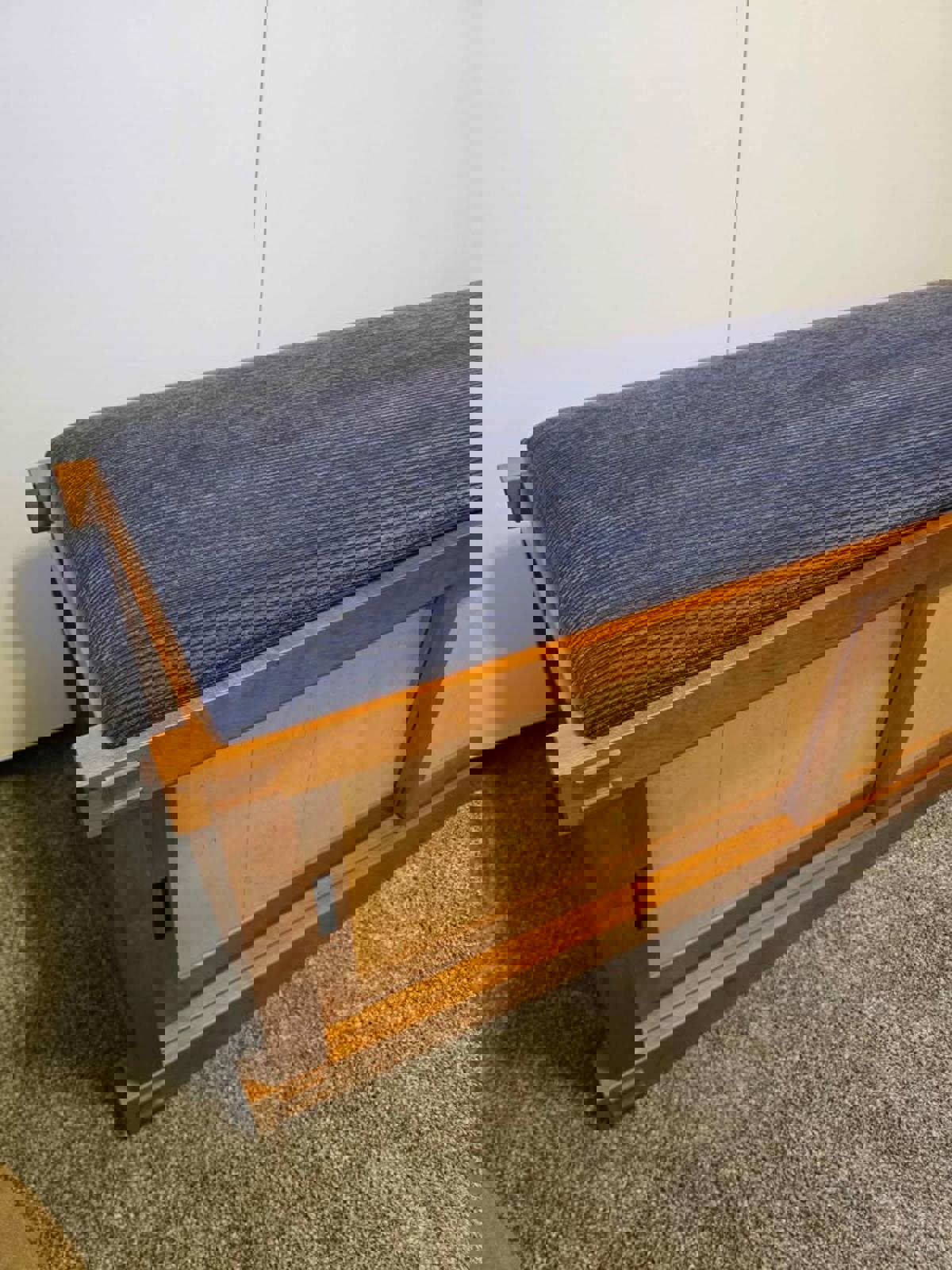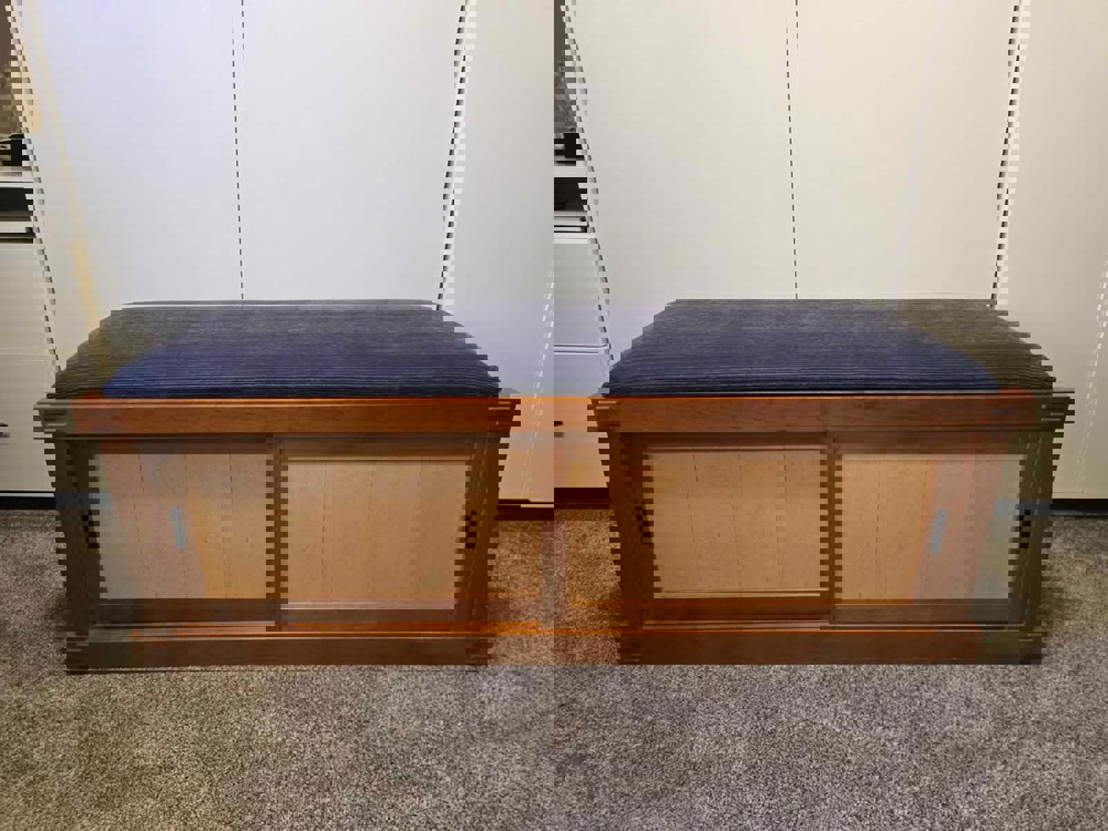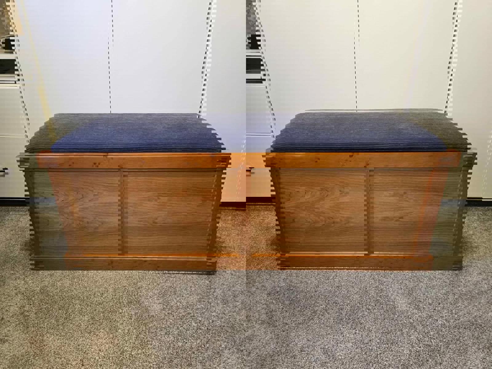 Beautiful heirloom quality, solid wood, completely finished on all sides. The cherry wood blanket chest has coordinating birds eye-maple veneer front panels which slide open to reveal adjustable wooden shelves. The padded bench-top is completely removable and is upholstered in blue textured fabric. When the top is lifted, there are some visible scratch marks on the corner edges. Elegant at the end of a bed or in any room. Custom furniture handcrafted in the USA. To purchase new, the cost is well over $5000. 53.5"L x 18"D x 20"H