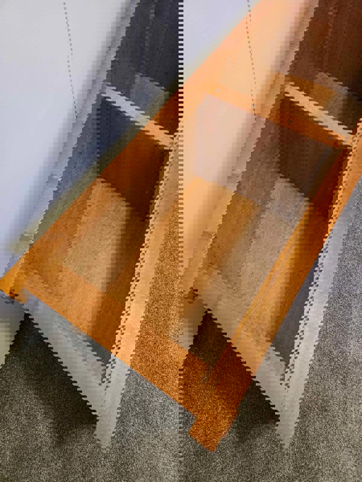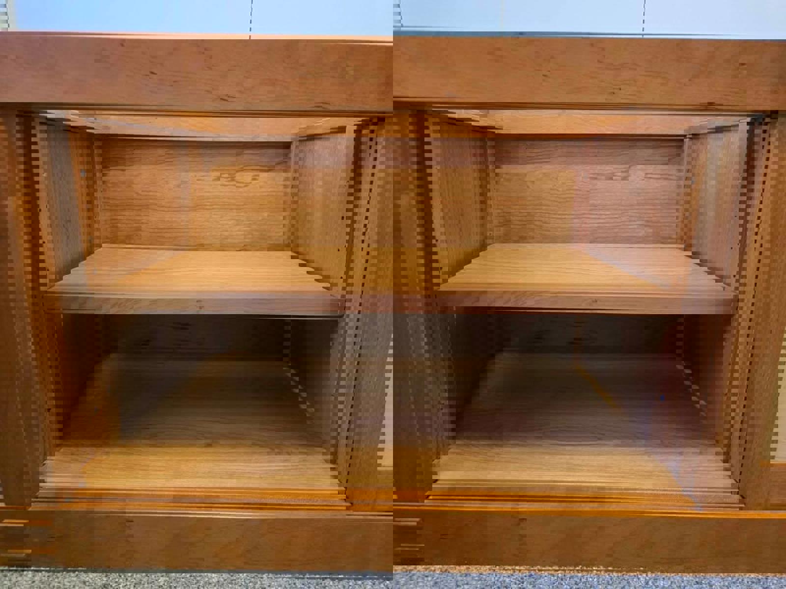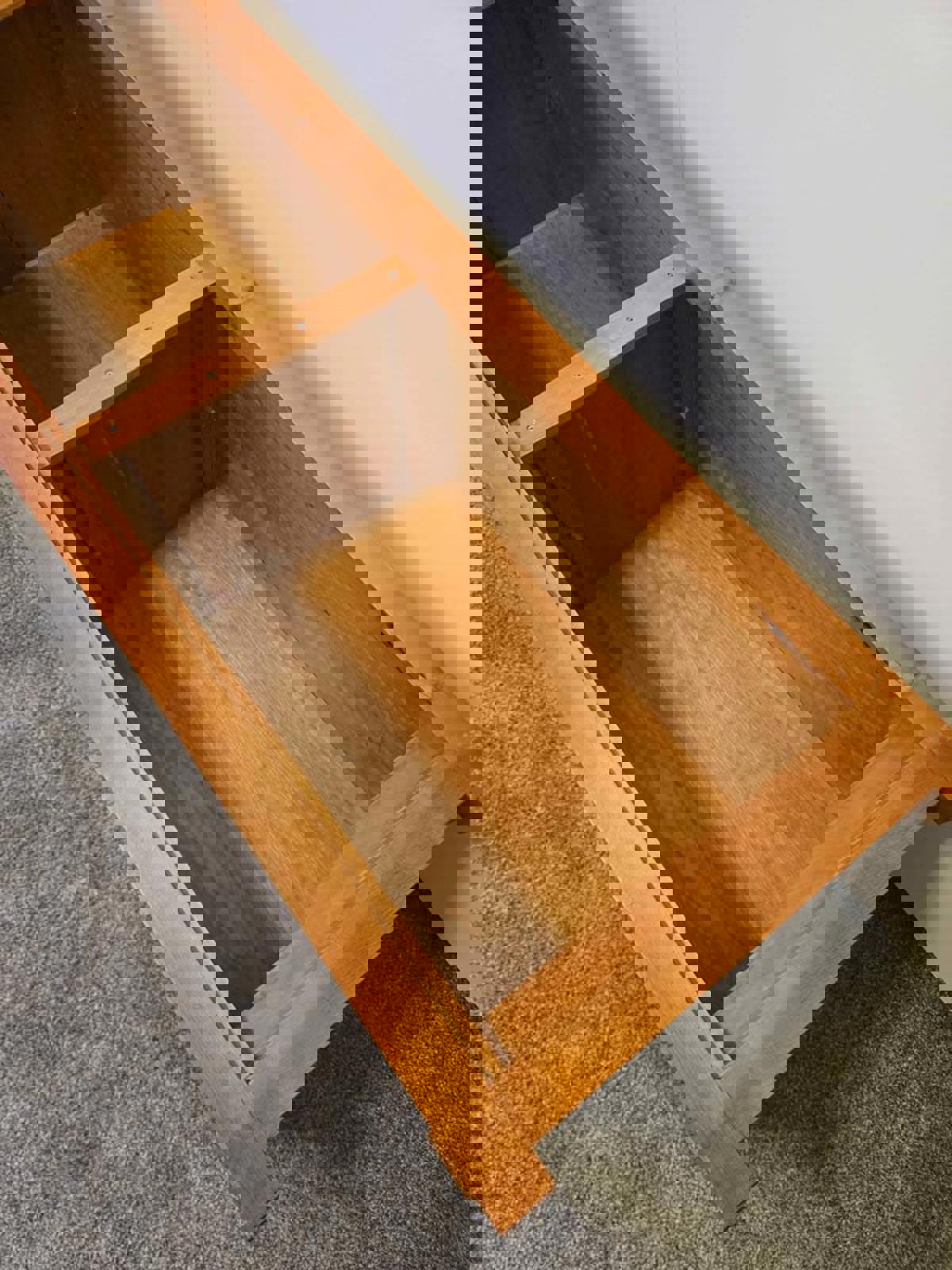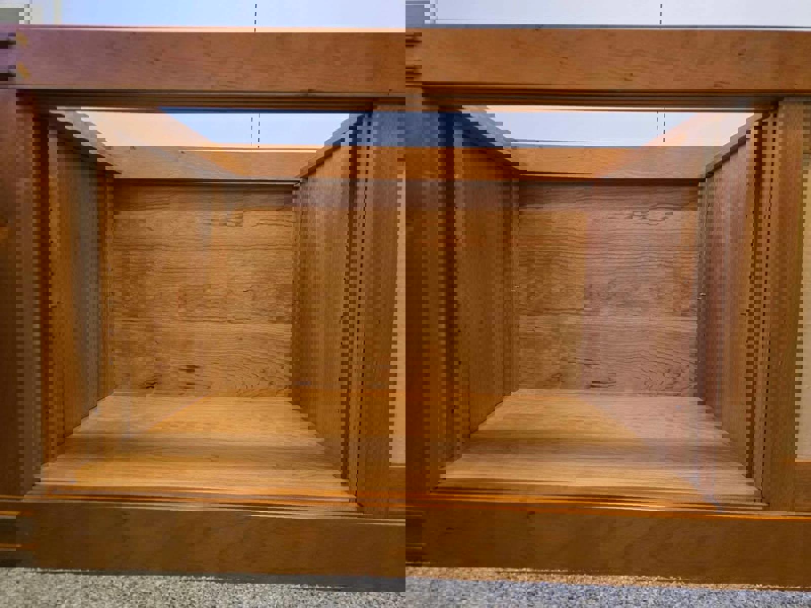 Beautiful heirloom quality, solid wood, completely finished on all sides. The cherry wood blanket chest has coordinating birds eye-maple veneer front panels which slide open to reveal adjustable wooden shelves. The padded bench-top is completely removable and is upholstered in blue textured fabric. When the top is lifted, there are some visible scratch marks on the corner edges. Elegant at the end of a bed or in any room. Custom furniture handcrafted in the USA. To purchase new, the cost is well over $5000. 53.5"L x 18"D x 20"H