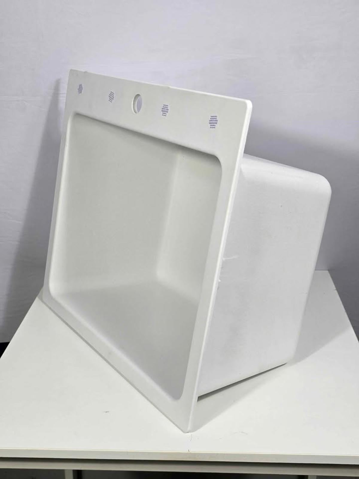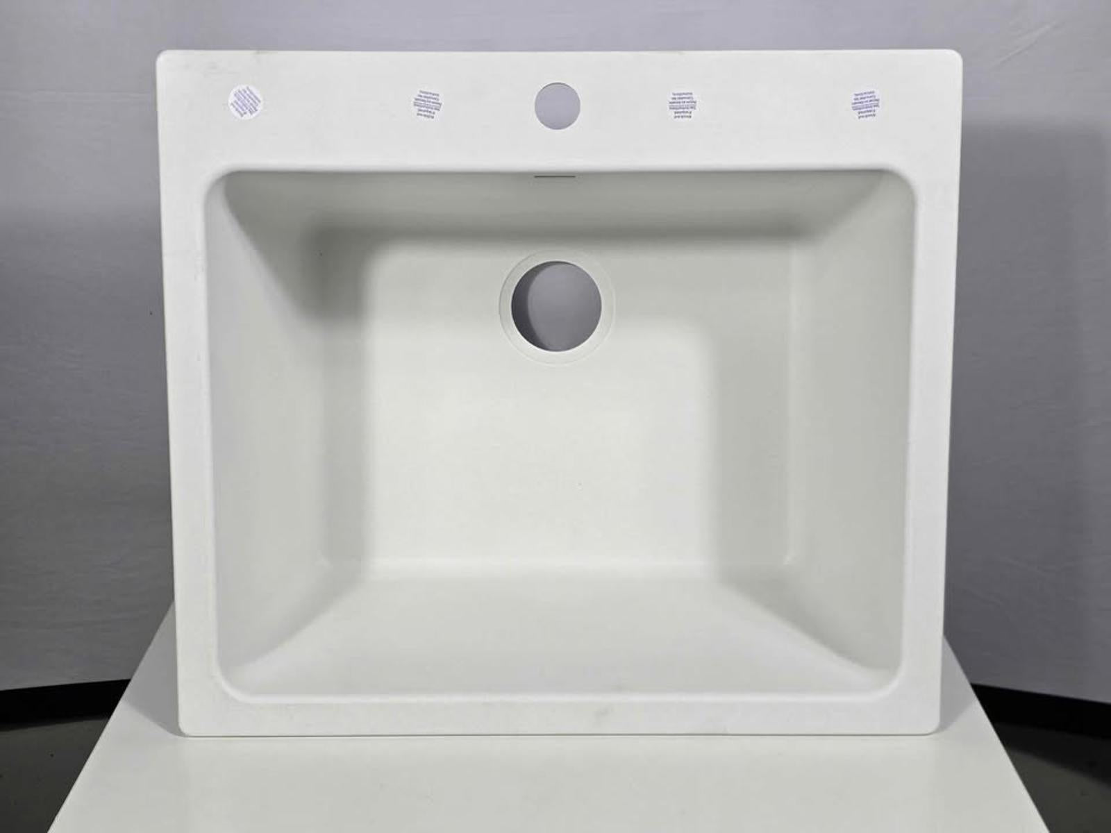The best laid plans....I can't fit a sink in my laundry room. Granite composite sink which makes it long lasting and durable, with dual mount design for drop-in or undermount installation. Predrilled for a single faucet but has 4 knockouts for flexibility. Exterior 25"L x 22"W x 13"H. Basin 22-1/4"L x 17"W x 12"D. Minimum cabinet size 30". Drain 3-1/2". Sink only, no faucet or drain basket. Currently listed at Build.com $561.60 sigh...