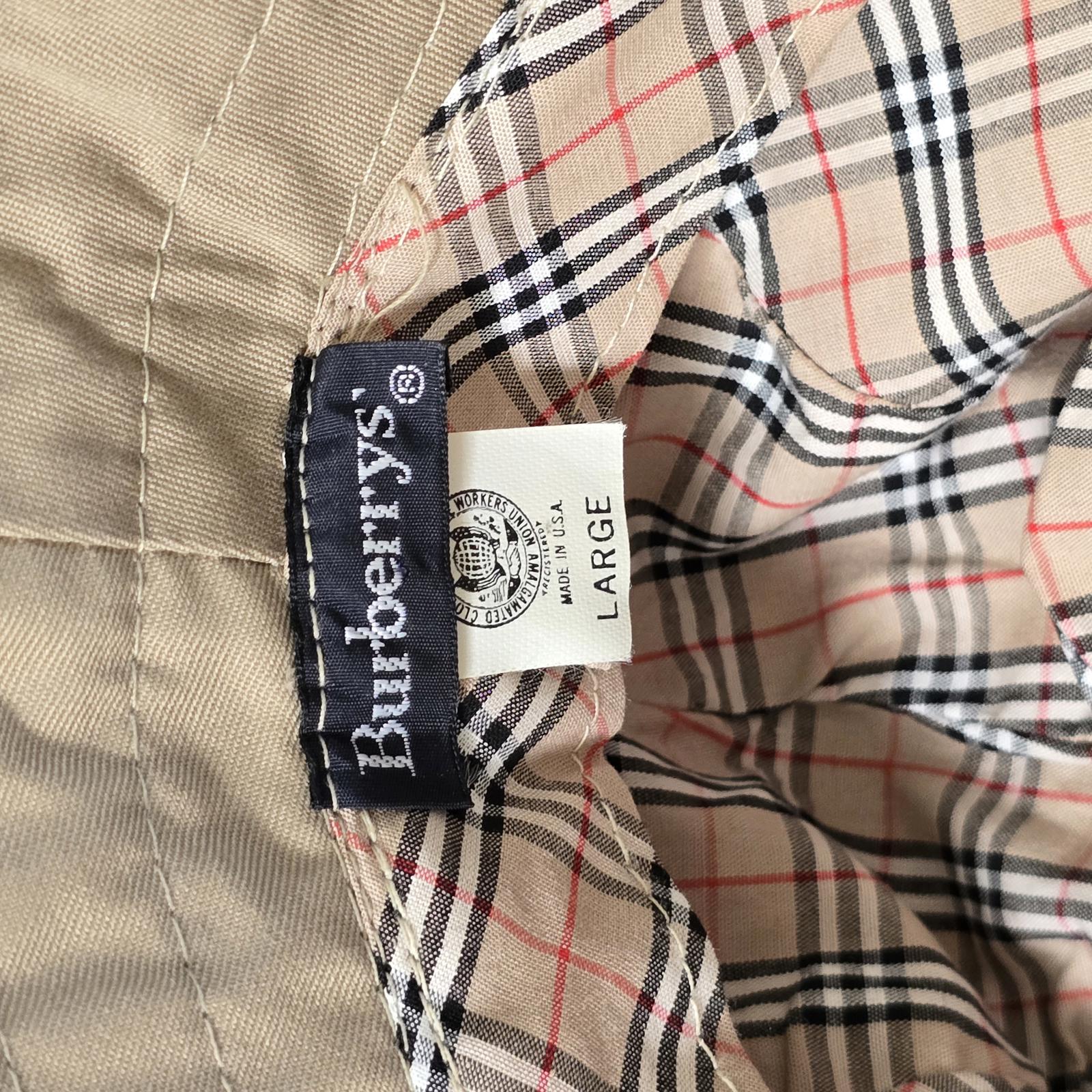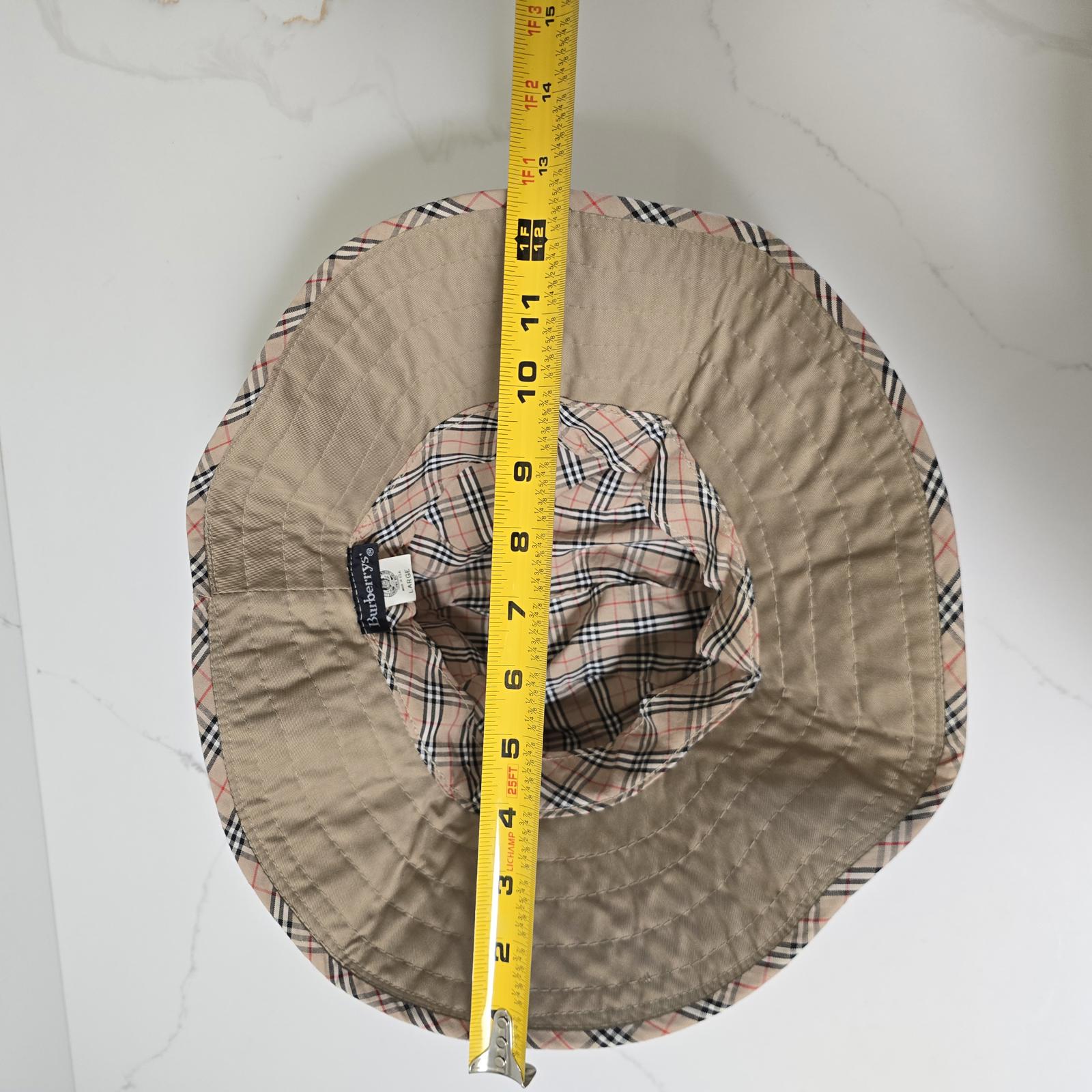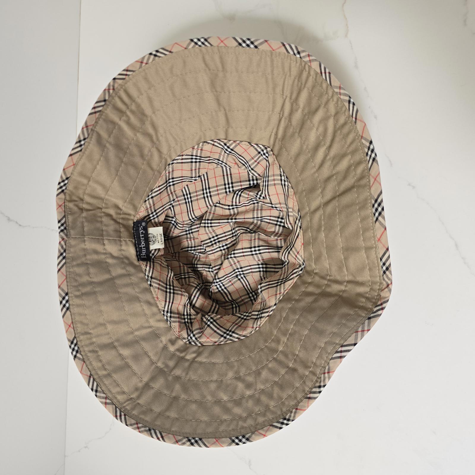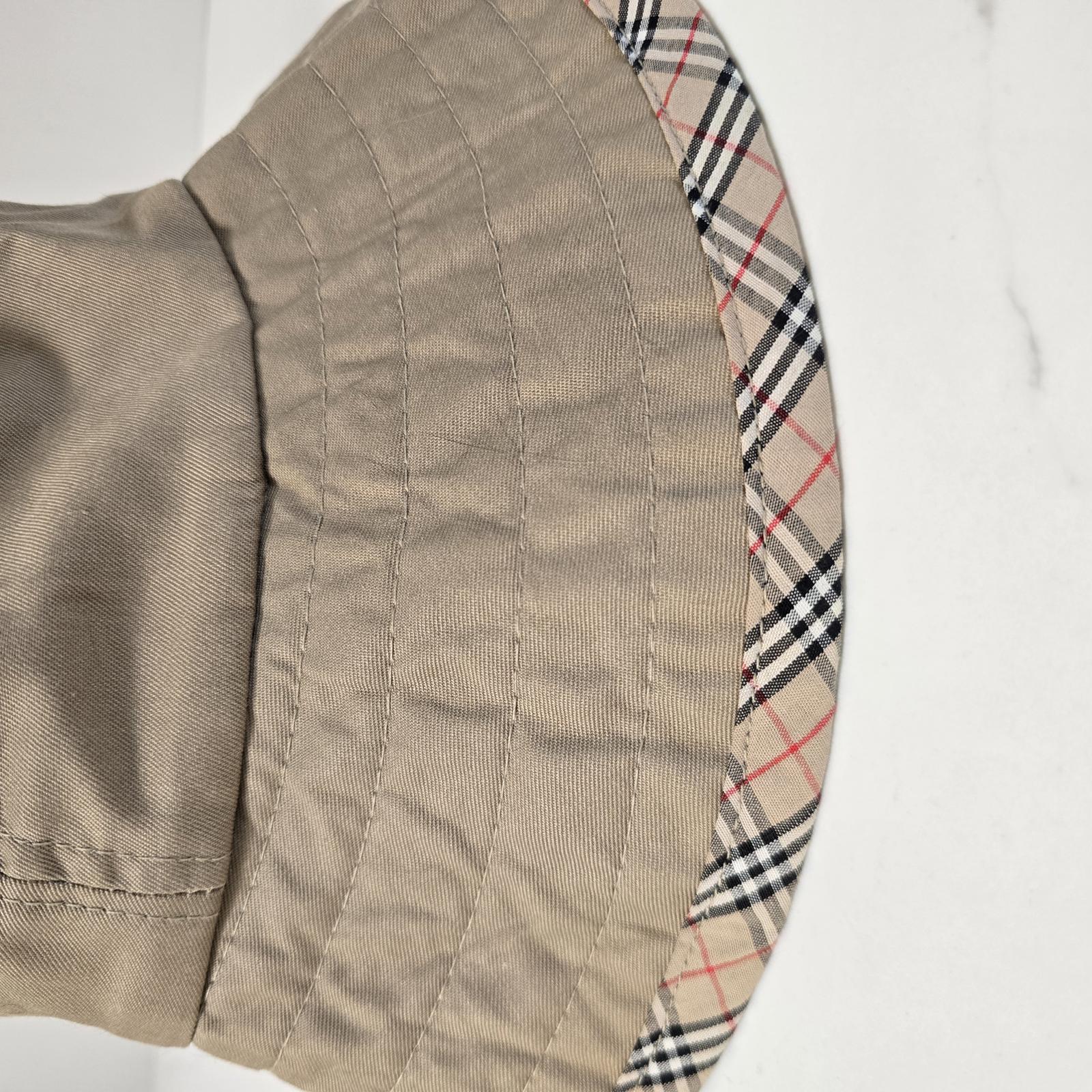 Burberry vintage(pre-1999), khaki bucket hat with their famous Nova Check lined crown and edge banding. Double-seamed detailing adds that extra flair and style. Inside head measurement approximately 7.5" Diameter. Outer edge-to-edge 11.5".