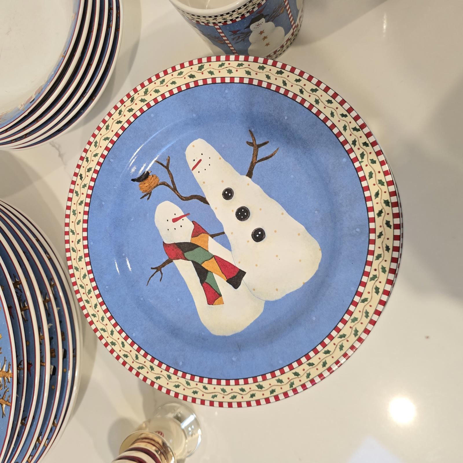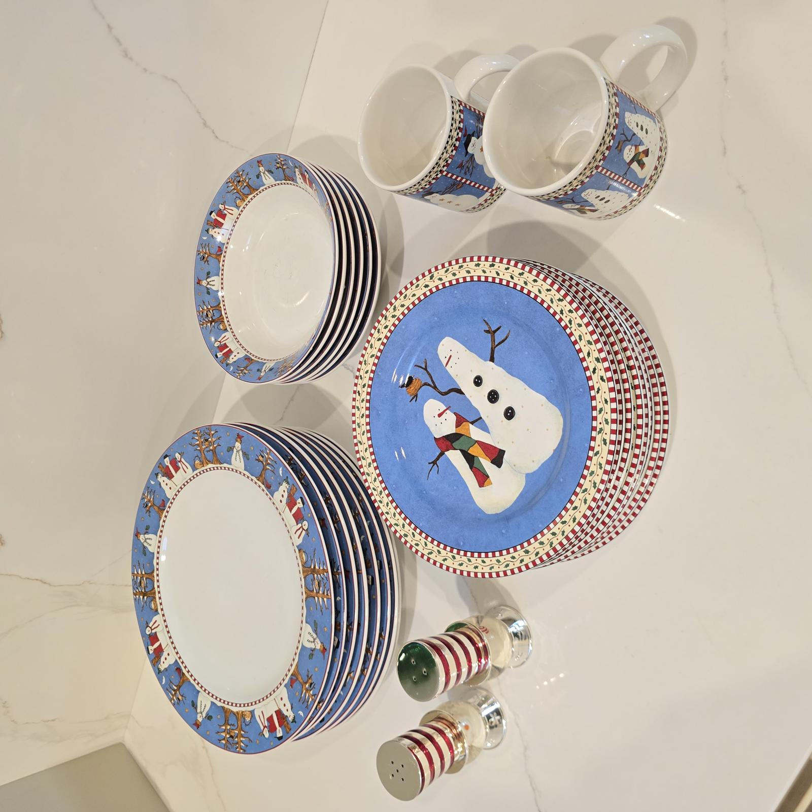 Debbie Mumm Snowman Dinnerware and Vintage Reed and Barton Snowman S & P Shakers