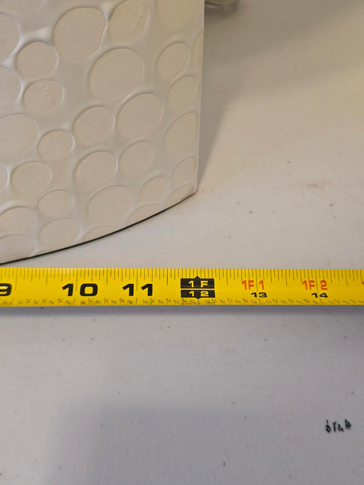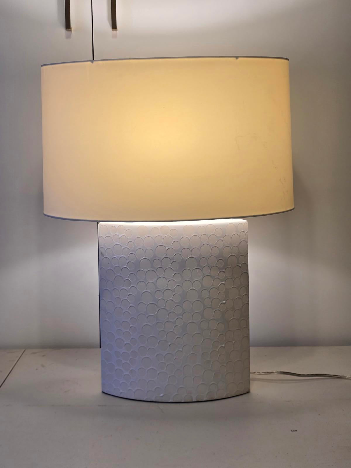 High-end, modern white table lamp features a textured circular pattern on the ceramic base and a white fabric shade, offering a clean and sleek design. Ideal for contemporary interiors. Lamp 26.5"H to top of shade. Base 12"W x 4"D. Shade 19"W.