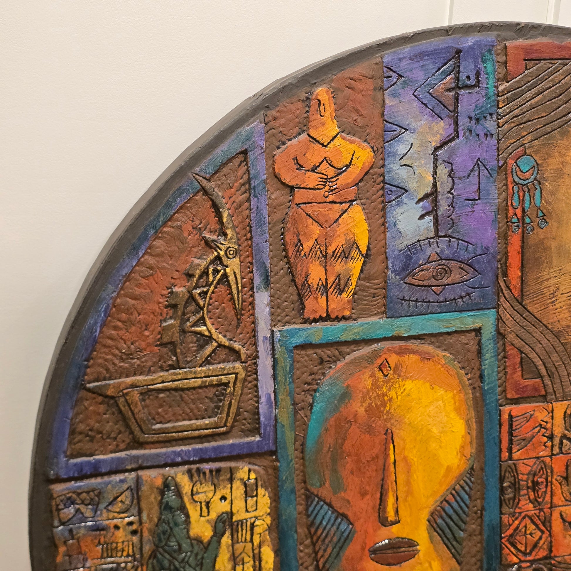 Artist Al Masri's paintings incorporate different forms of ancient art and cultural symbols such as inscriptions, pottery, weapons, or jewelry. Most of his paintings reflect images, faces and shapes of ancient heritages from Nabataeans, Sumerian, Egyptian or Mesopotamia. This can range from coins over palm trees to vases or fishes. Al Masri usually works on a prepared medium, where he carves the main lines of his image. He then paints the picture with earth tones and sometimes other bold colors such as red, turquoise, blue or purple. The carving adds to the three-dimensional shape and underlines the texture and reminds one of ancient inscriptions. Artist signed and dated 2006. Back bracket supports this impressive and monumental 39" diameter art piece.