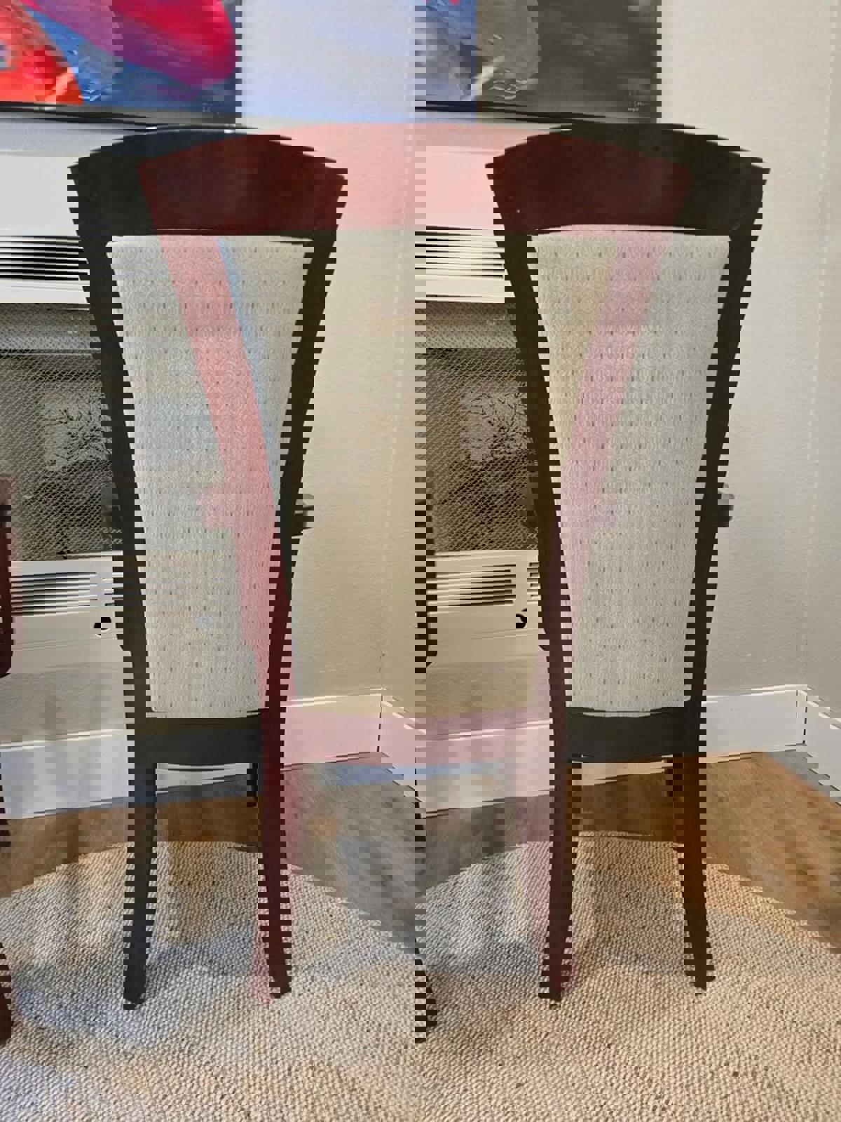 Armed side chairs with wood trim featuring an upholstered backrest and seat in a light, patterned fabric. The heavy, wooden frame showcases a rich finish, curved arms, and sleek legs. Both chairs are in good condition with minimal signs of use. Beautiful design would look great at either end of a dining room table or in any setting. 39.5"T x 22.25"W x 25"D. Seat height 19"