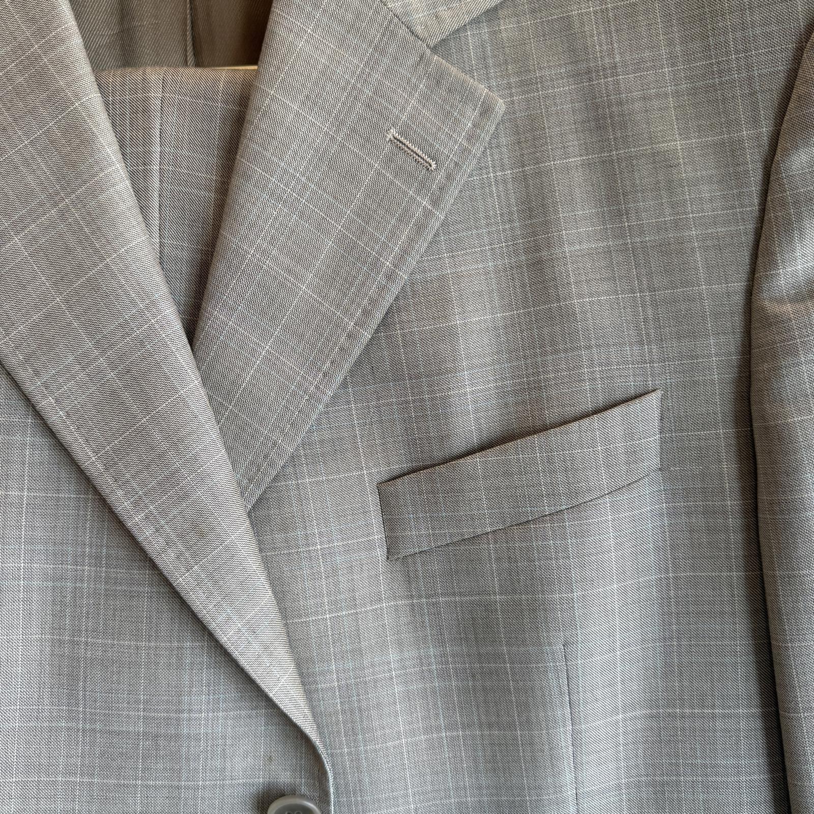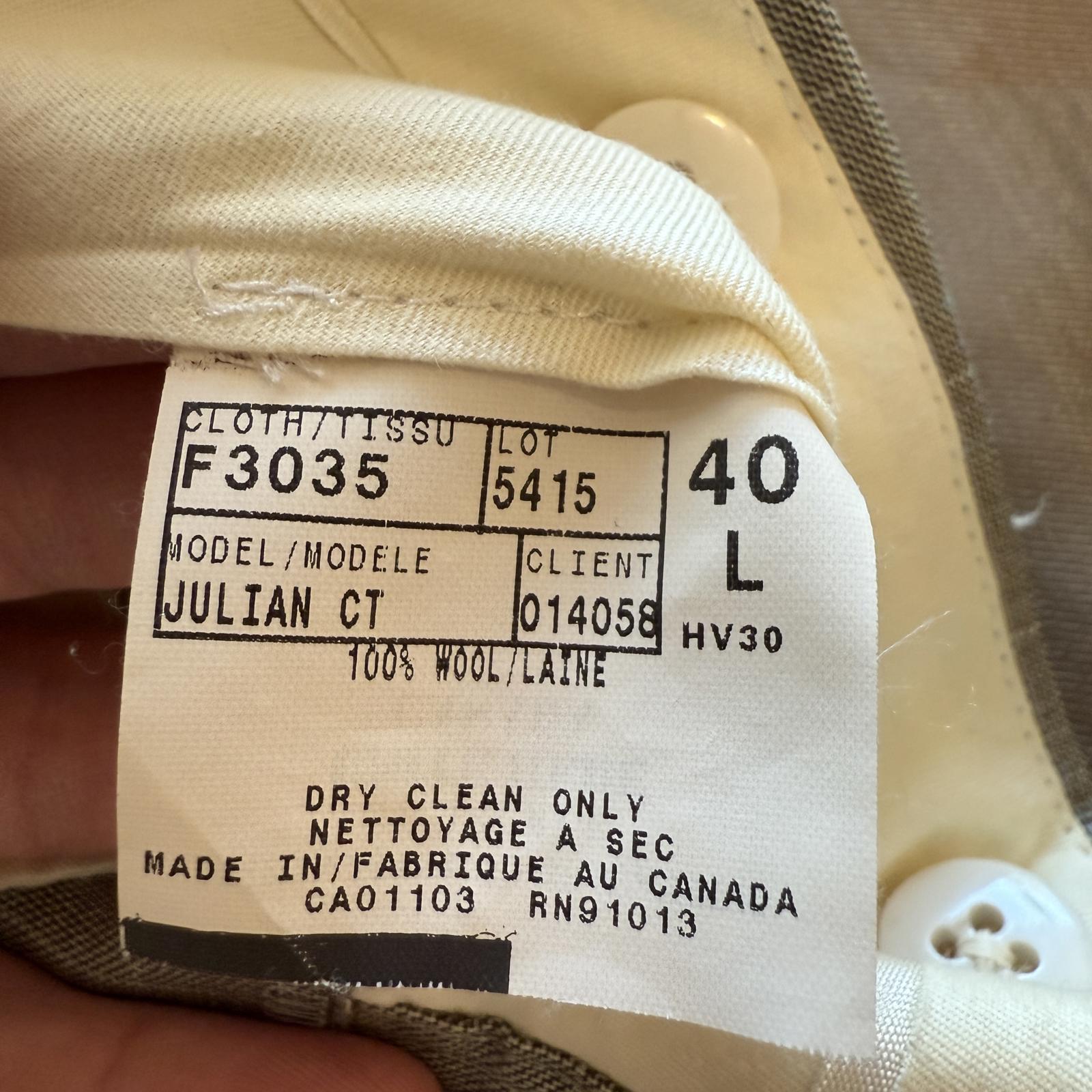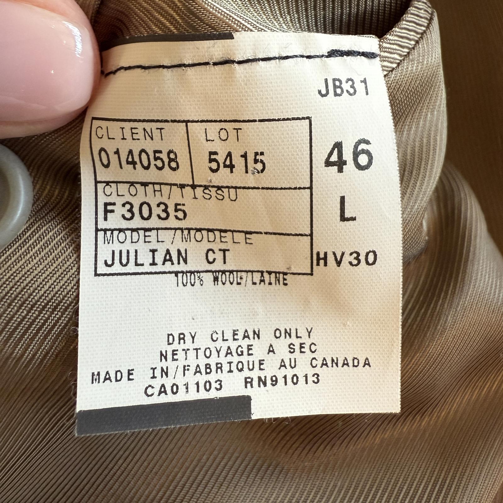 Sophisticated, stylish, lightweight suit in great color. Made in Canada. 100% Wool. Model Julian CT. Excellent condition. Men's size 46L Jacket and 40L Pants