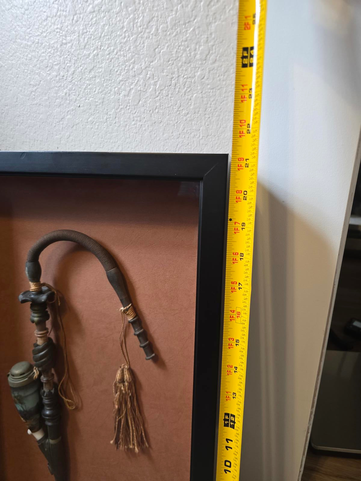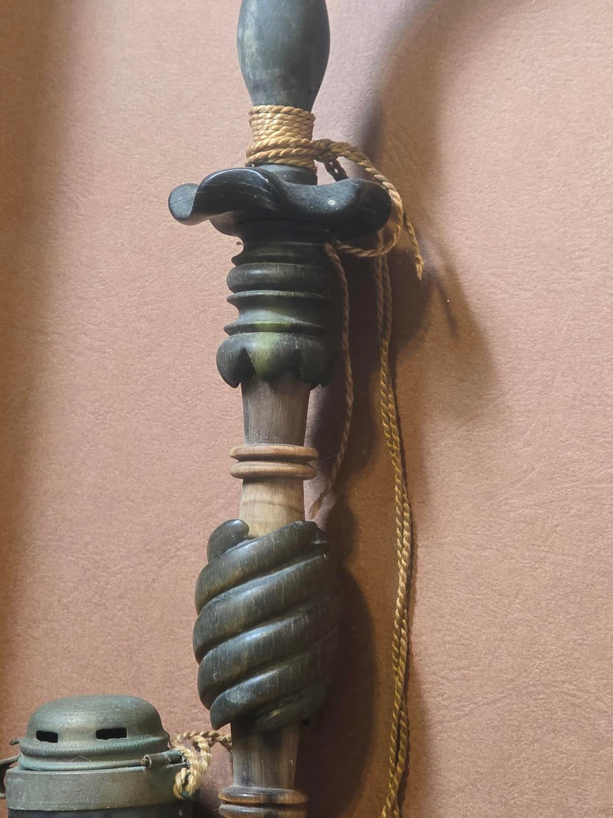 Popular in Bavaria and the Black Forest, the pipe has a long, flexible stem, and a decorative hand-painted hunting scene on the porcelain bowl. Wood, brass and tassels accent this handsome pipe. c.late 1900's-early 20th century. Minimal wear consistent with age and use. 21.75" x 3" x 12.75".