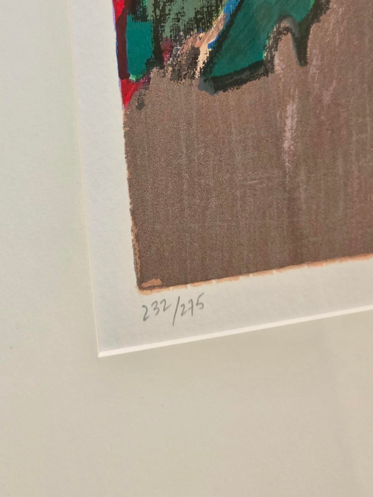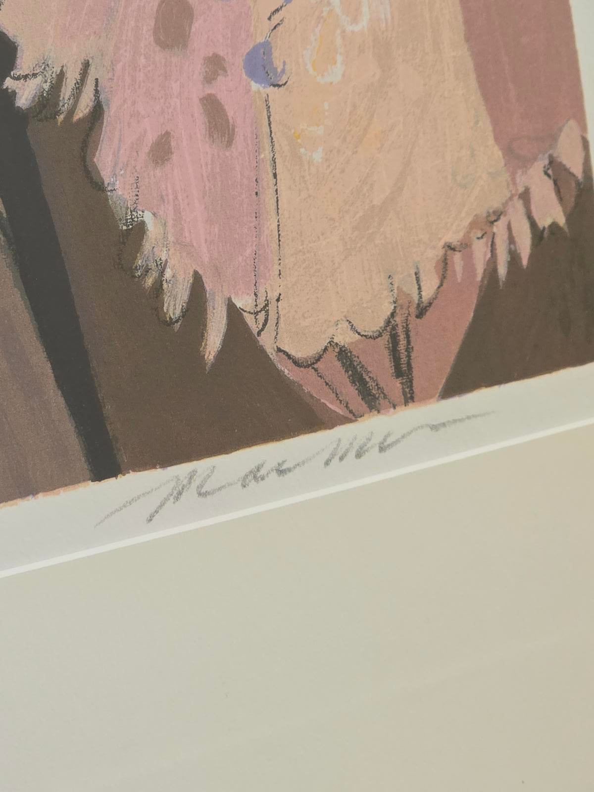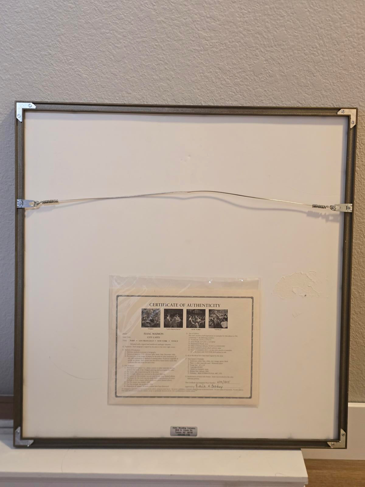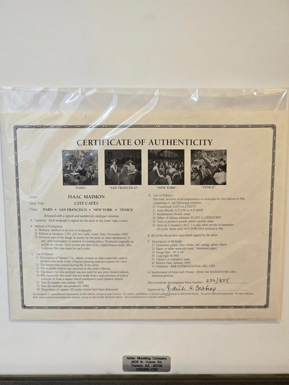 Artist Isaac Maimon is known for his depictions of Cafe Society and elegant women. His style blends realism and impressionism, characterized by bold brushwork and a vivid color palette. He explains that when art lovers enter his world, they "feel relaxed and connect with the scene. They can forget their everyday problems and become emerged in the romantic fantasy”. The artwork features two women in a cafe setting, with a Venetian canal scene and a gondolier in the background, showcasing Maimon's signature style of beautiful colors and expressive forms. Hand-signed by the artist in the lower right corner and numbered 232/275 in the lower left. 1992. The Certificate of Authenticity is on the reverso. The art is in mint condition and the frame has some minimal wear. Frame 25" x 24", image 16" x 16".