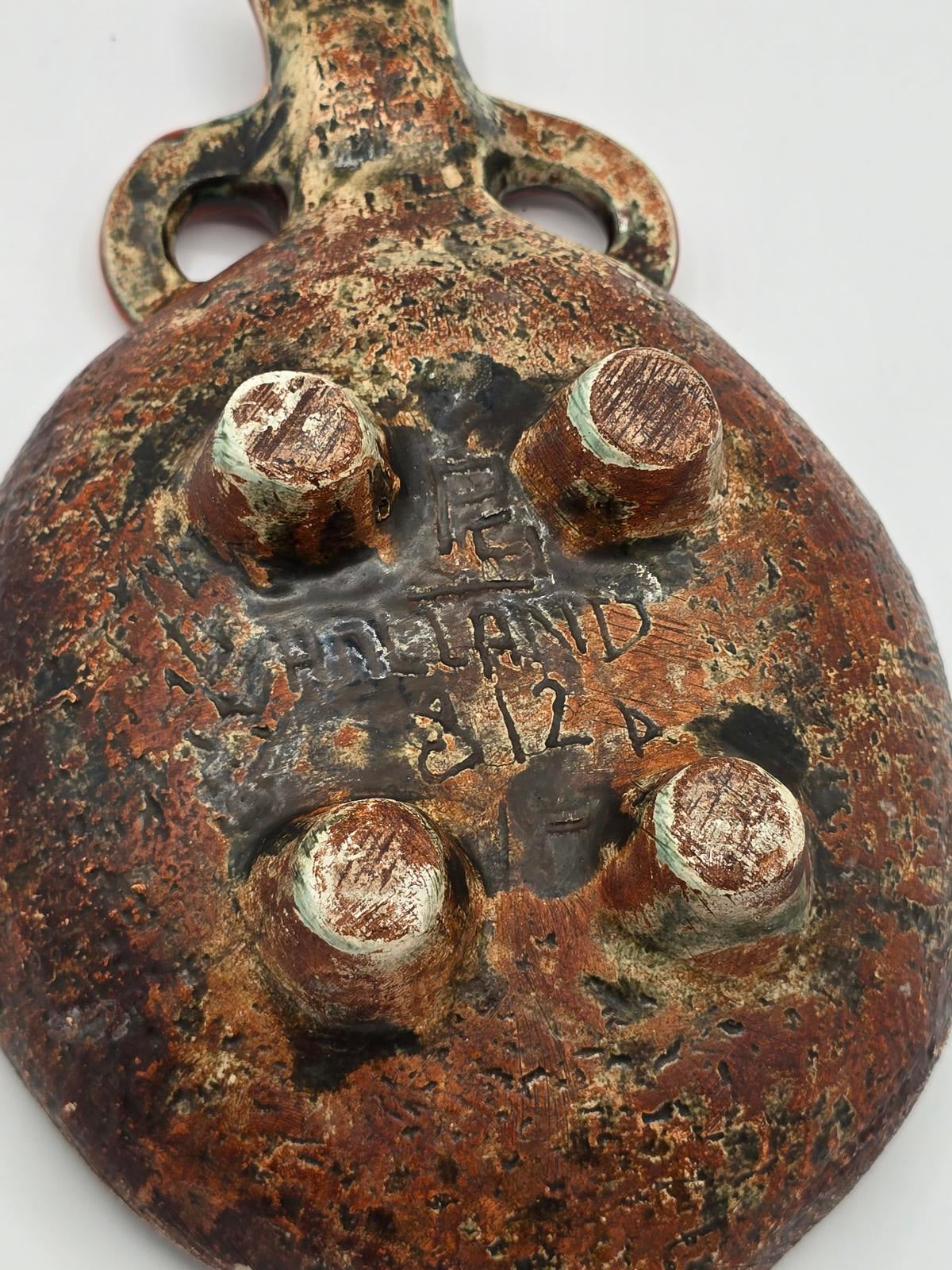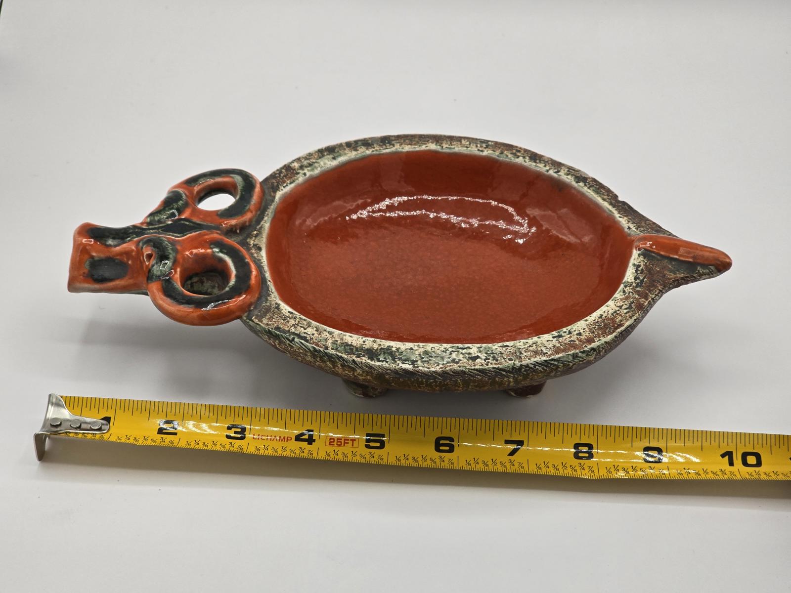 Pieter Groeneveldt (1889-1982), was a renowned Dutch pottery artist. He was famous for his development of innovative and textured glazes. This piece was produced during his freelance factory period,1925-1972, and is one of the "Groeneveldt Monsters". It exhibits the travetjin (travertine) effect, a rough surface with a dark surface, which he introduced in the 1950's. Brilliant orange contrasts with the dark textured surround of a primitive and whimsical carabao or water buffalo. Groeneveldt was a contemporary of other noted modern ceramic artists such as Fantoni, Gambone, Andrae, Brouwer, and Lanooij. The bowl is signed by the artist and was crafted in Holland. c. 1960's. It is in excellent condition and a rare find. Measures 10" x 6" x 2".