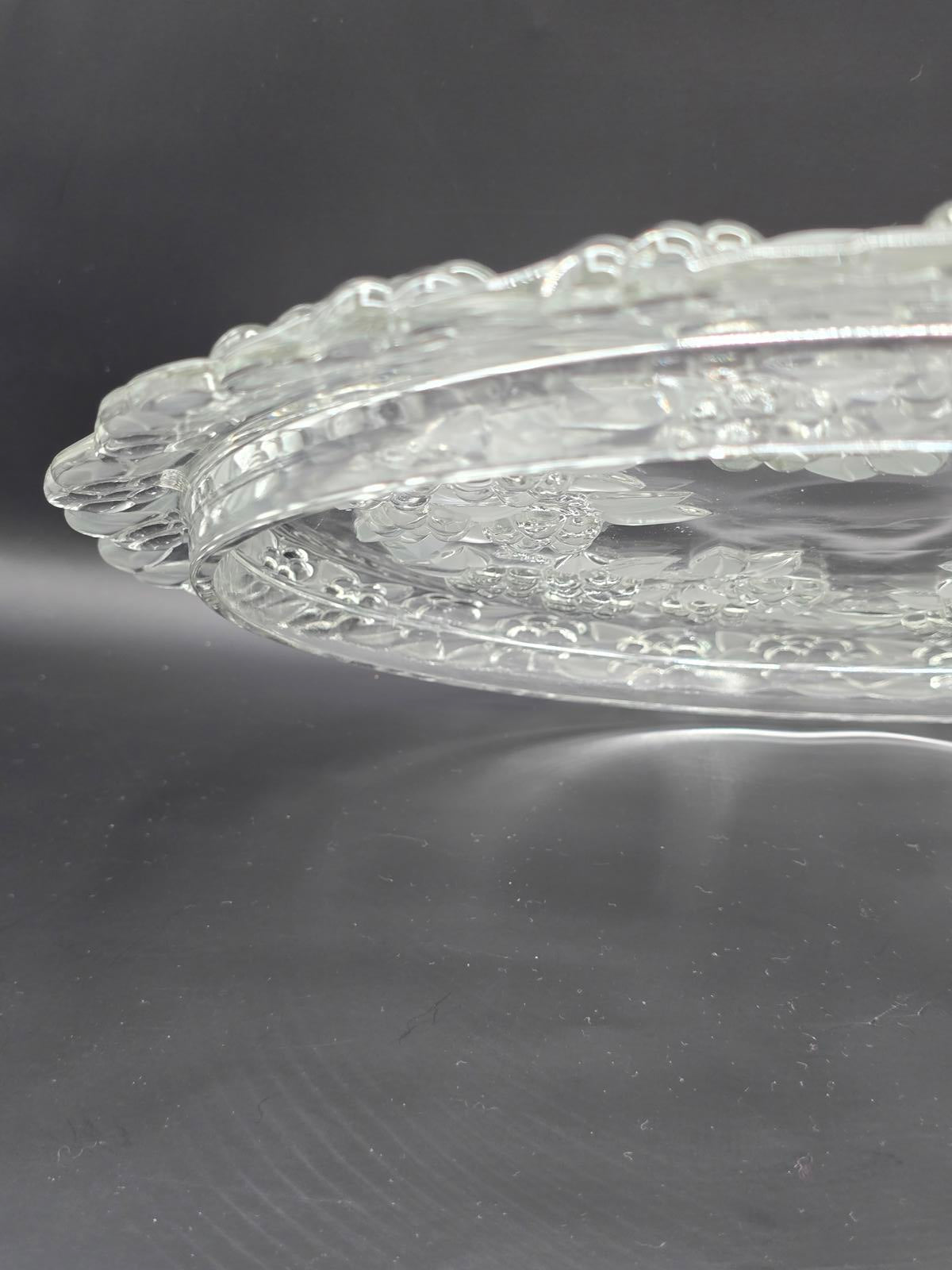 Create a beautiful presentation with this vintage lead-crystal platter featuring a floral pattern with clear flowers, frosted leaves and a textured, scalloped edge detail. Made in Germany. Good condition with wear consistent with age and use. 4 lb 2 oz