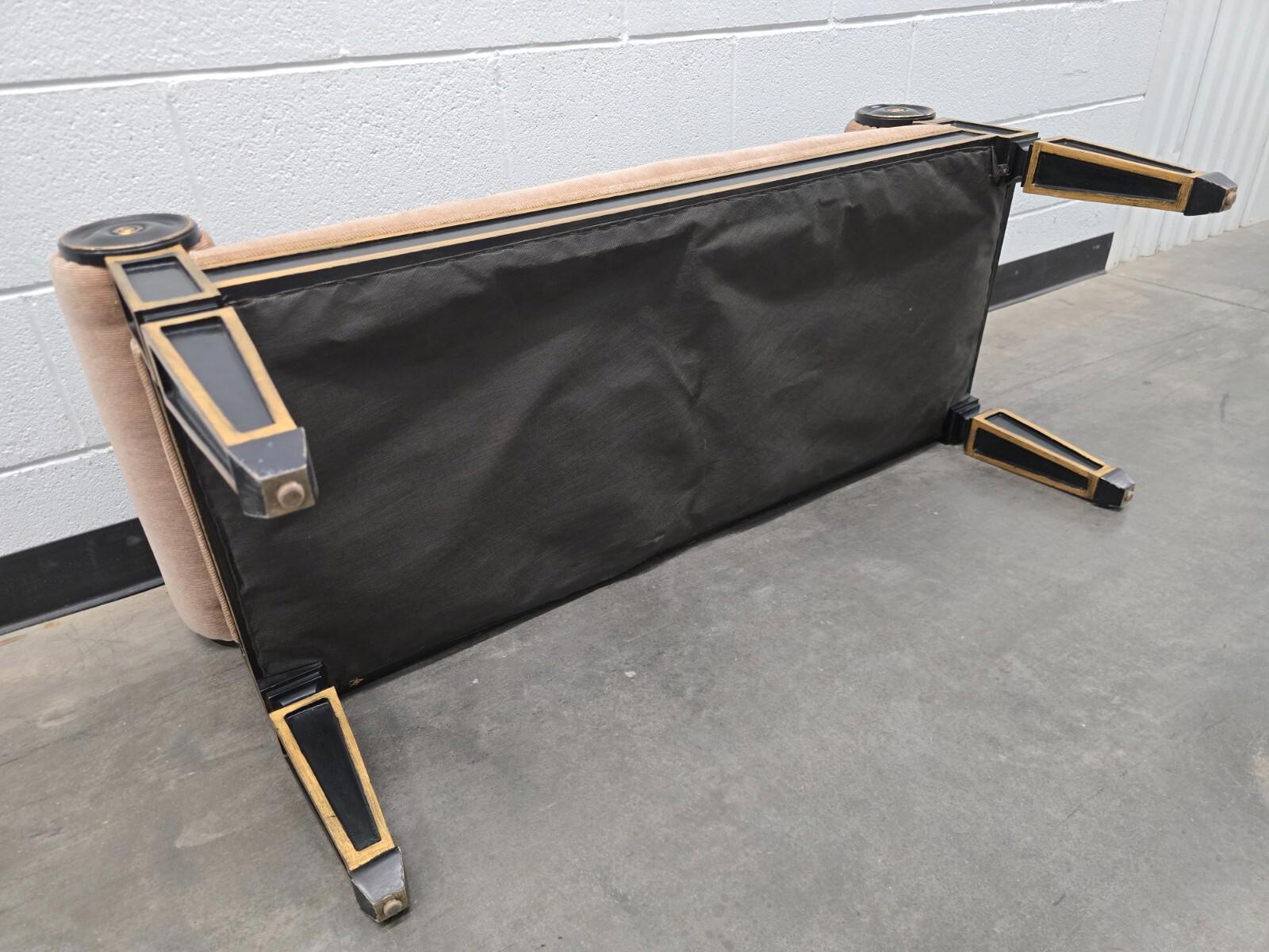 Beautiful, Hollywood Regency inspired, bench. The bench has an ebonized and gilded base with textured, taupe, mohair upholstery. Perfect for the bedroom or foyer. Good Condition. Measures h. 23", w. 48-1/2", d. 16-1/2"