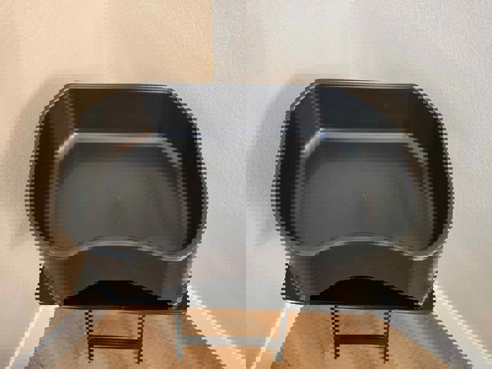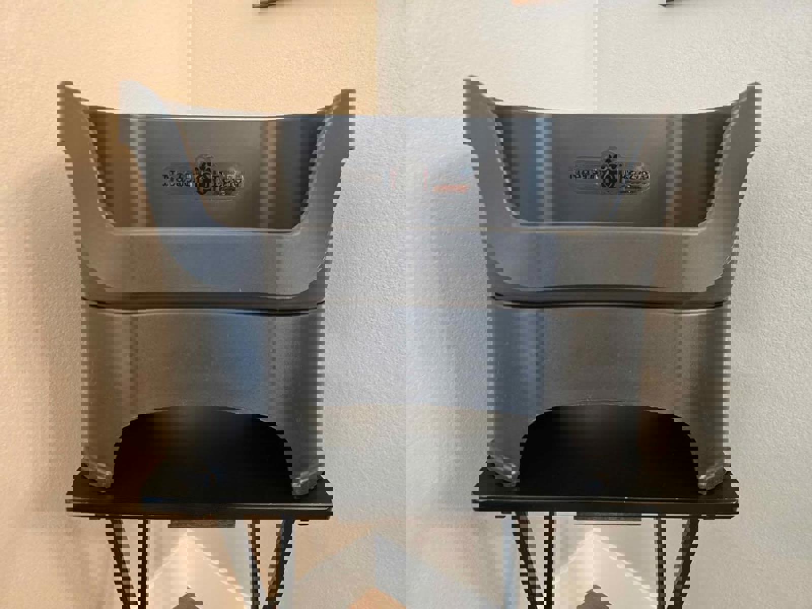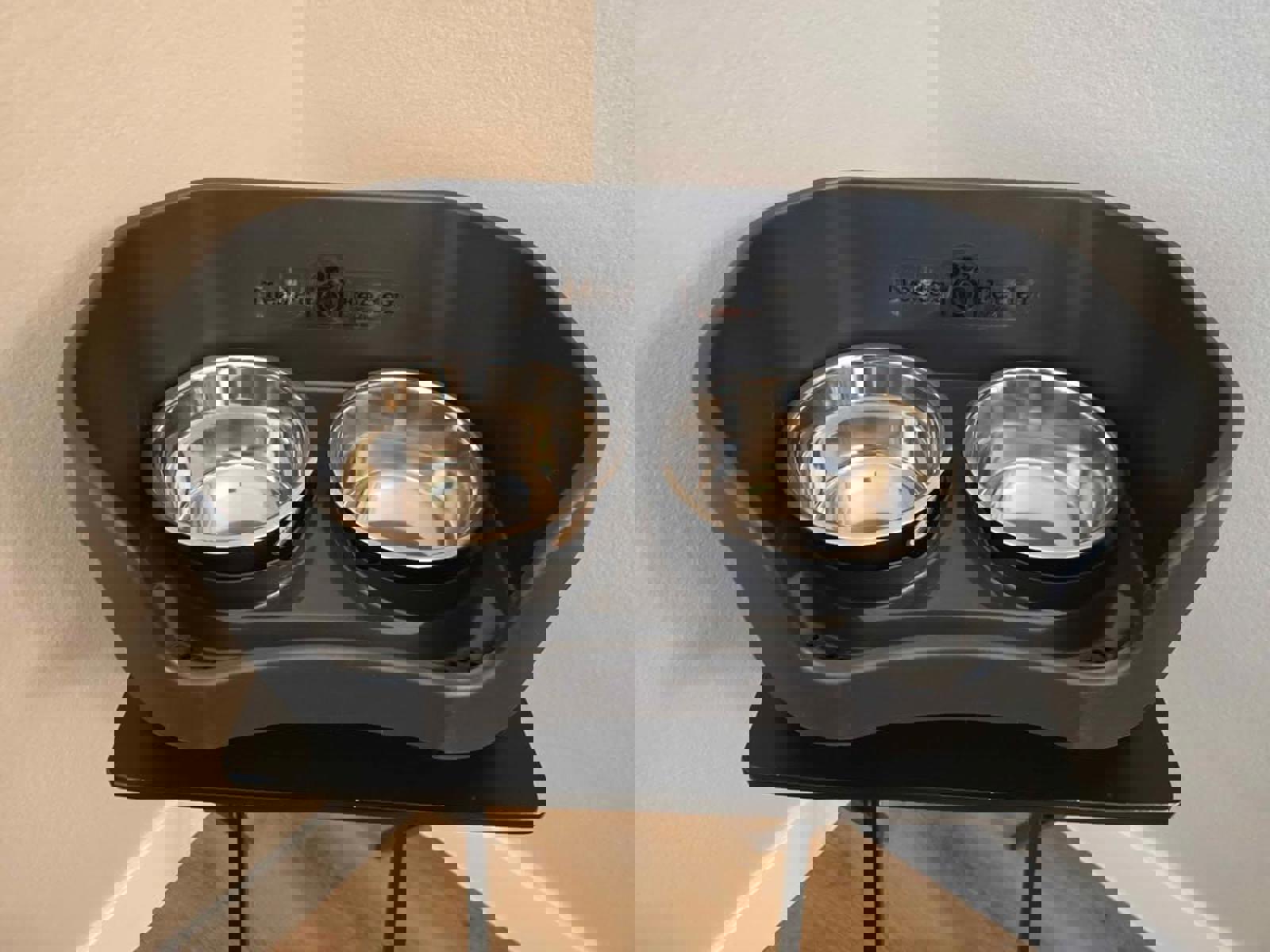 For large dogs, no-spill raised dog feeder. Has tray underneath to catch food and water. Comes with extensions and stainless steel food and water bowls. Made in USA. Black.