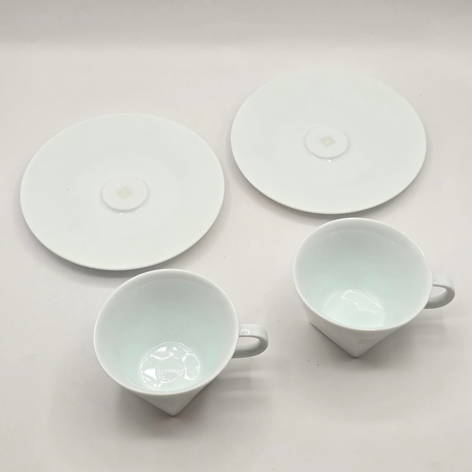 Pair of 2 cappuccino cups and saucers in white porcelain. They are perfect for everyday use or for guests with clean lines and a subtle Nespresso design. Drink your favorite brew in style. Please refer to the photos as they are part of the description. Approximately 3-5/8"D at top x 2.5" T. ~4.5" at widest. Saucer 6.25"D. 6oz capacity.