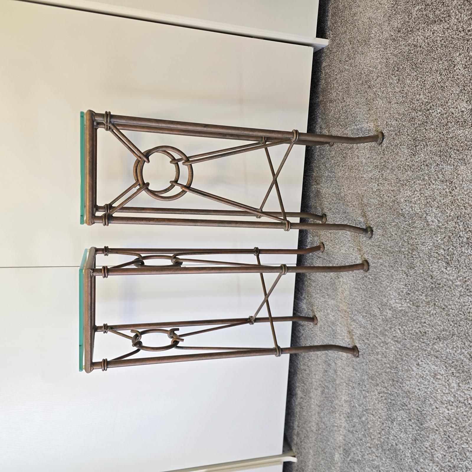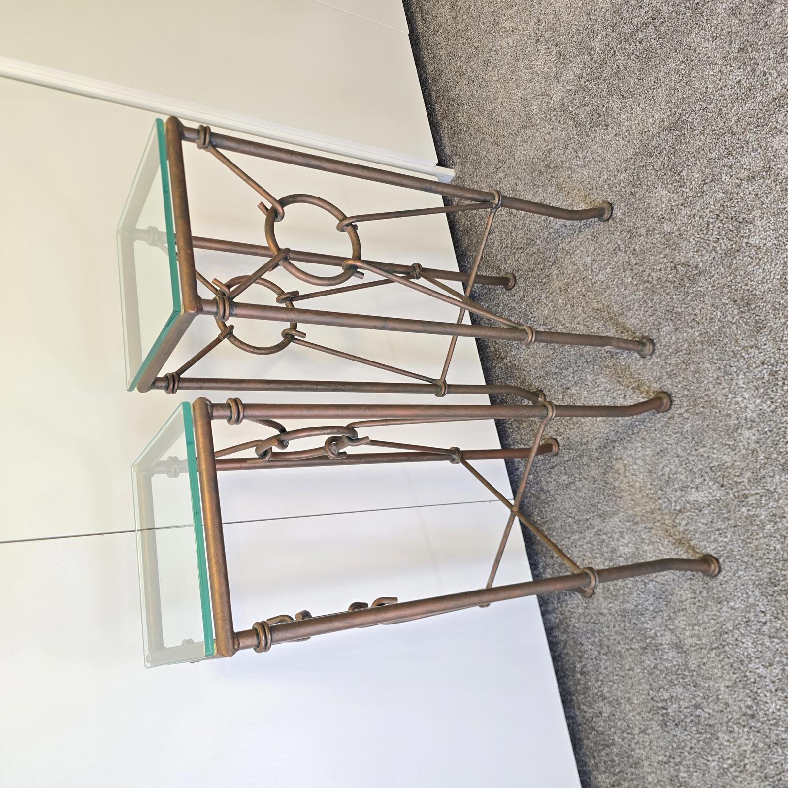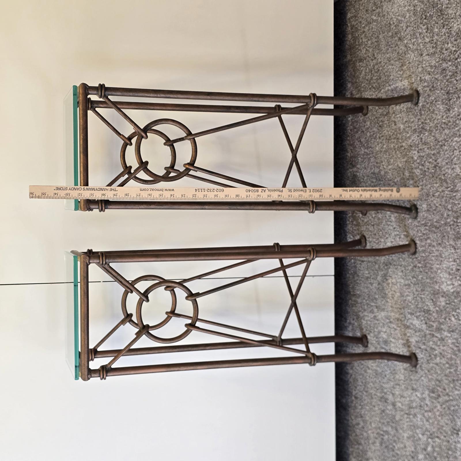 Gilded wrought iron pedestal tables are a perfect way to showcase plants or your favorite art. The Hermes style features intricate rings and hooks that resemble a horse bit. Beautiful patina and glass top. Good condition with some wear consistent with age and use. Please refer to photos for condition. Approximately 32" tall x 11" square.