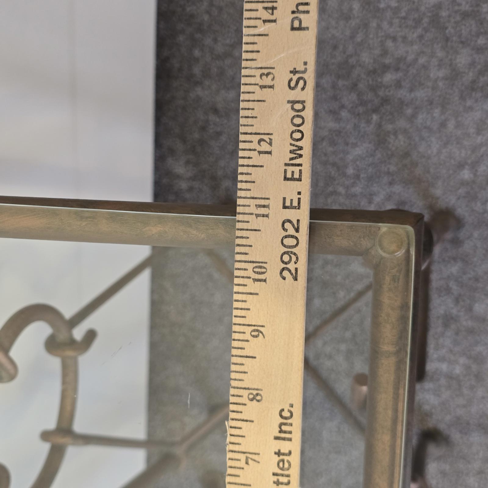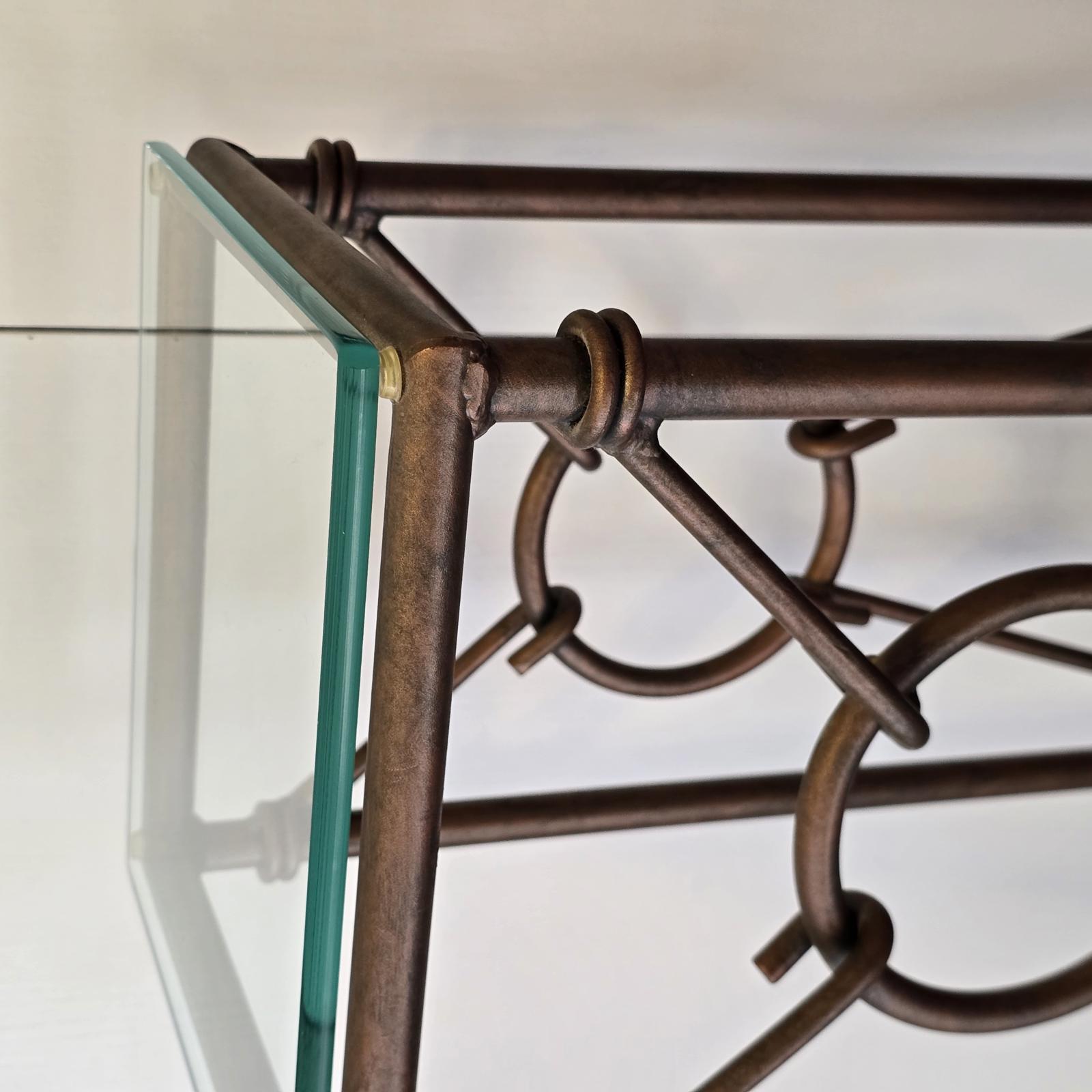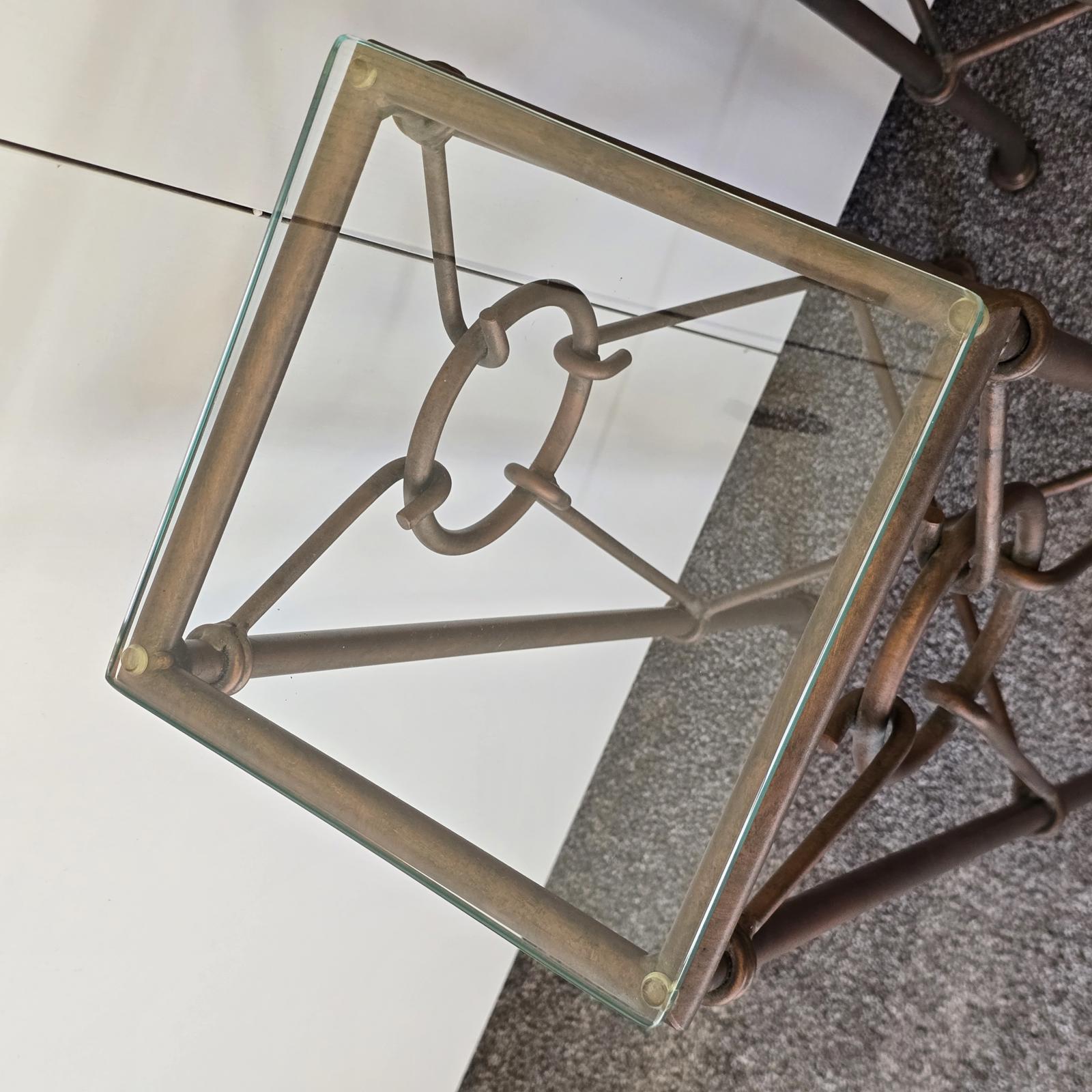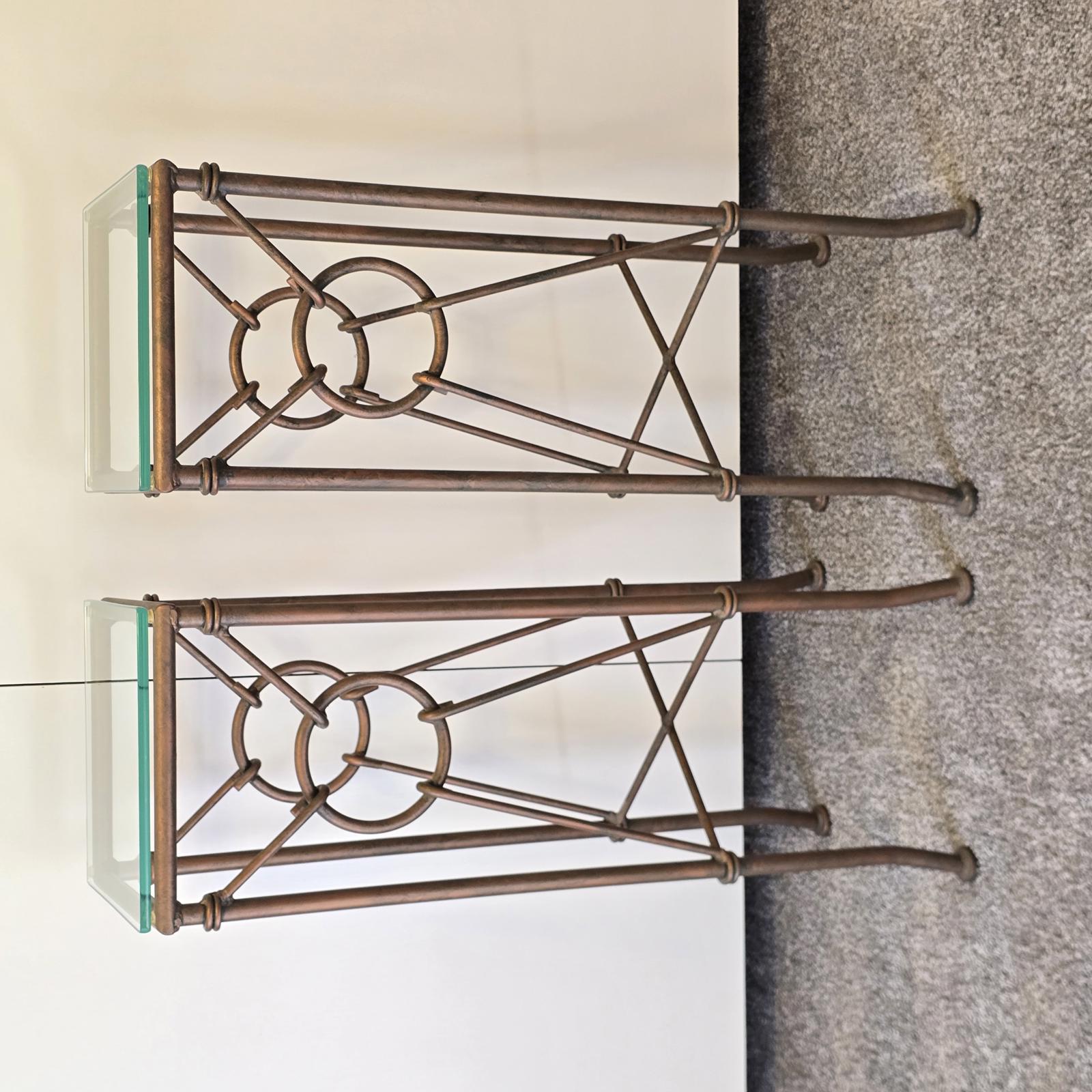 Gilded wrought iron pedestal tables are a perfect way to showcase plants or your favorite art. The Hermes style features intricate rings and hooks that resemble a horse bit. Beautiful patina and glass top. Good condition with some wear consistent with age and use. Please refer to photos for condition. Approximately 32" tall x 11" square.
