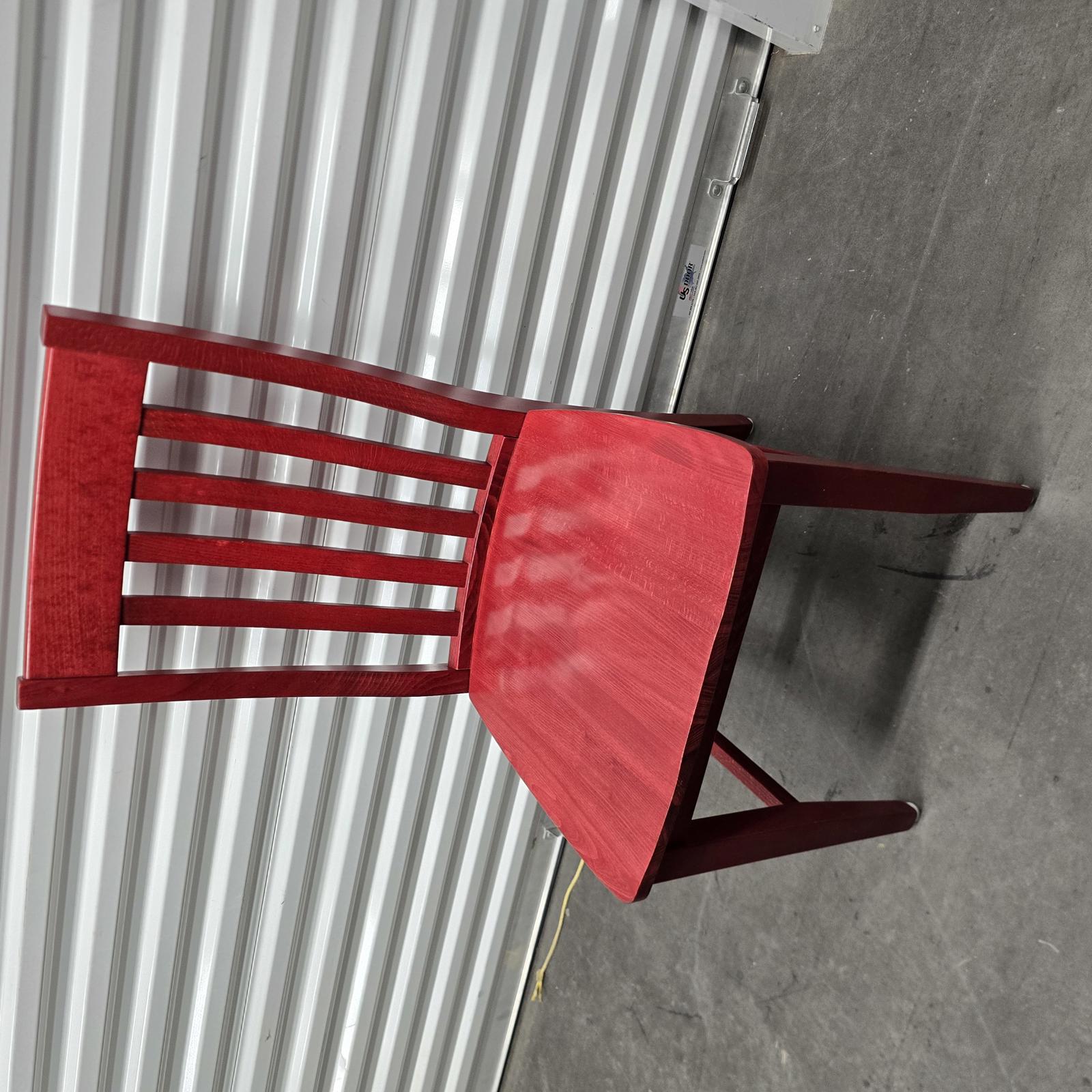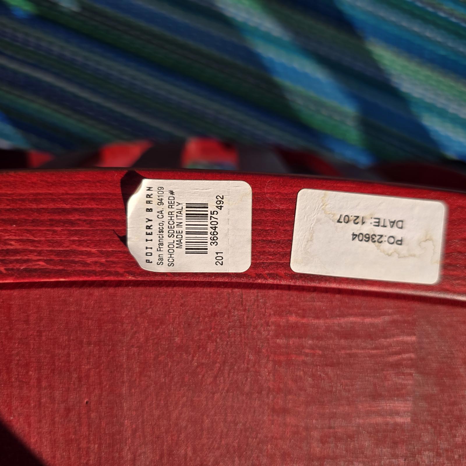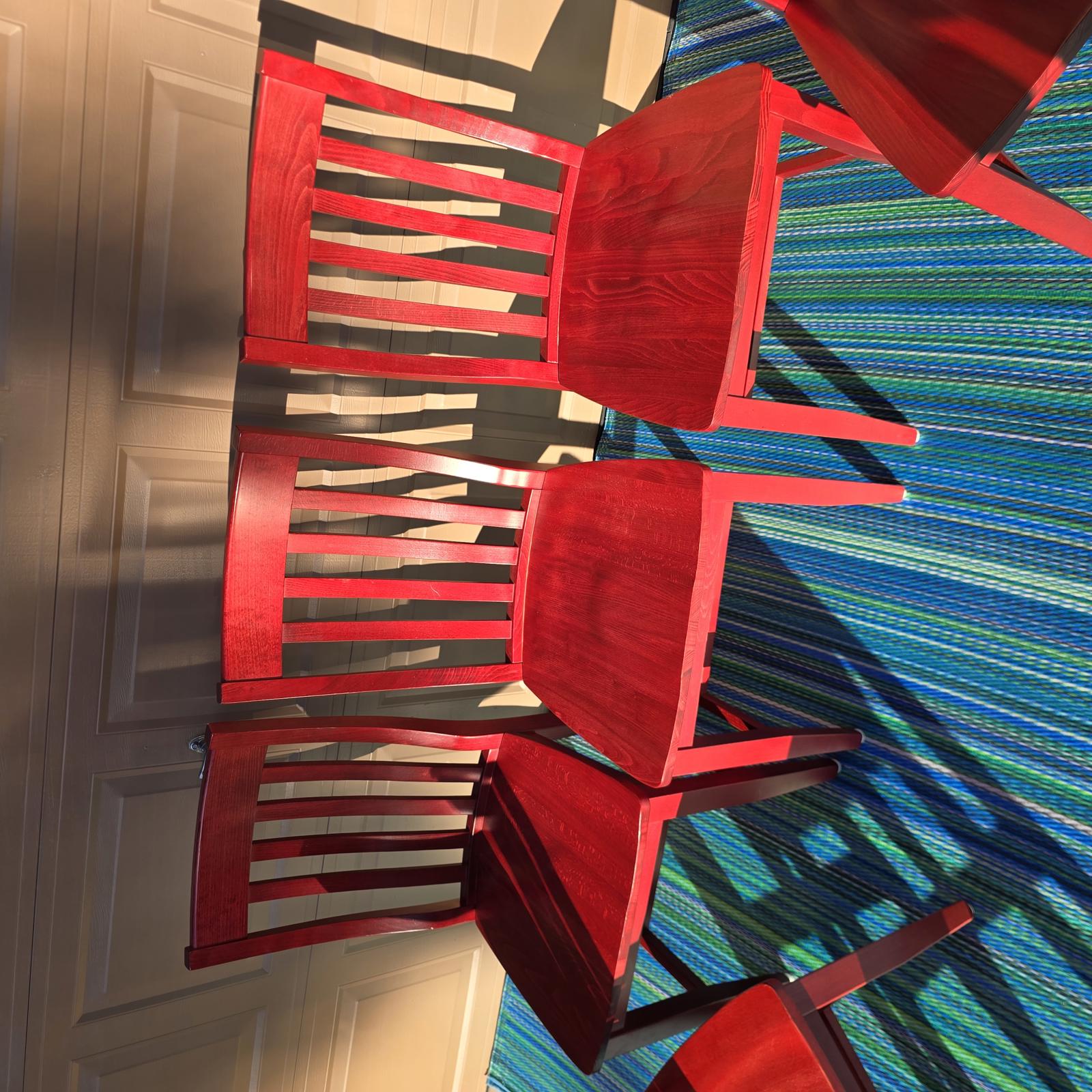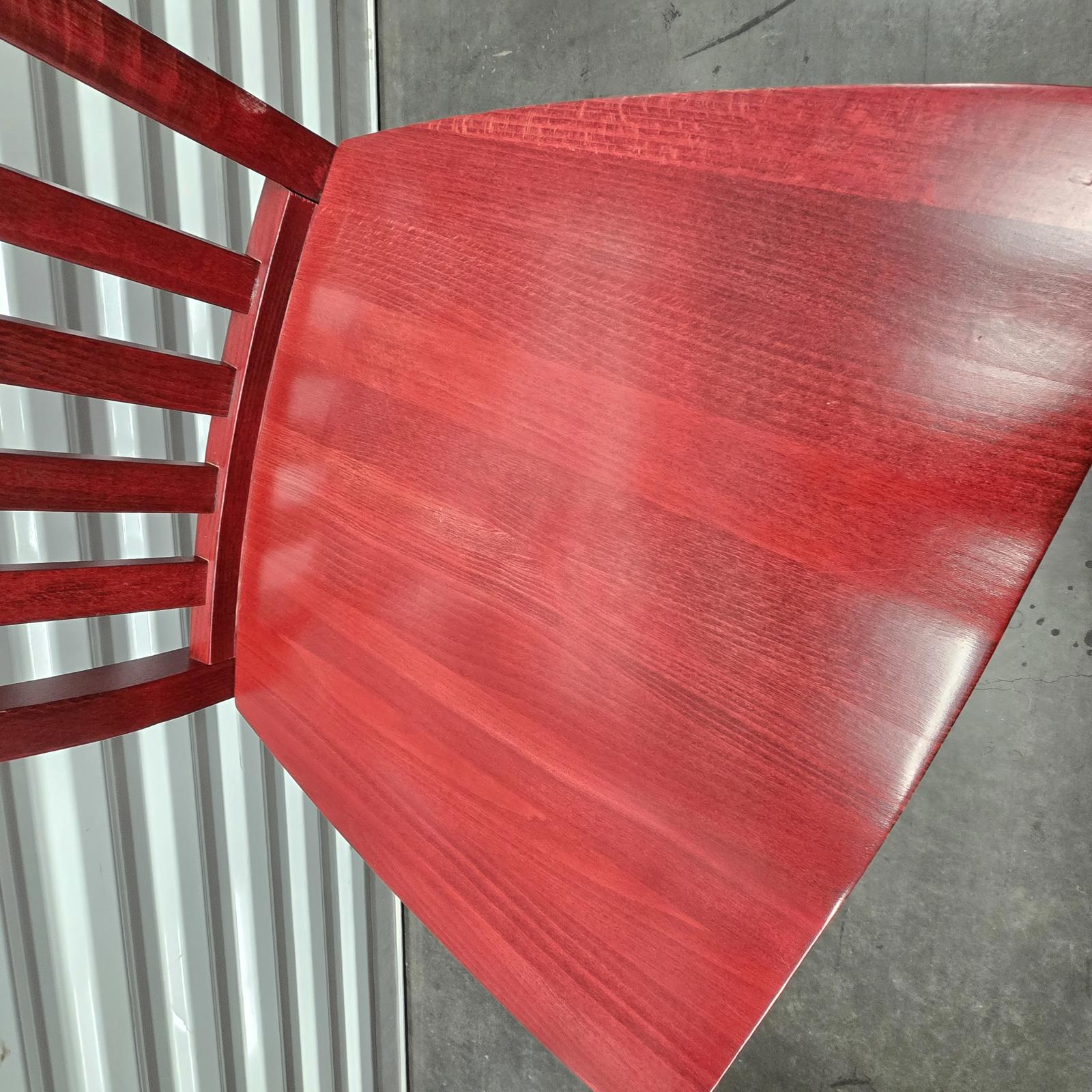 Add a pop-of-color with this great set of 7 Pottery Barn chairs made in Italy. They are perfect for your kitchen or dining room. The chairs are solid wood with a rich red stain finish that can easily be stained or painted to suite your design aesthetic. Quality chairs in good condition with minimal wear consistent with age and use. Please refer to photos. 36.25"H x 18.25"W x 21.25"D. Seat height 18.75" x 15.5" depth