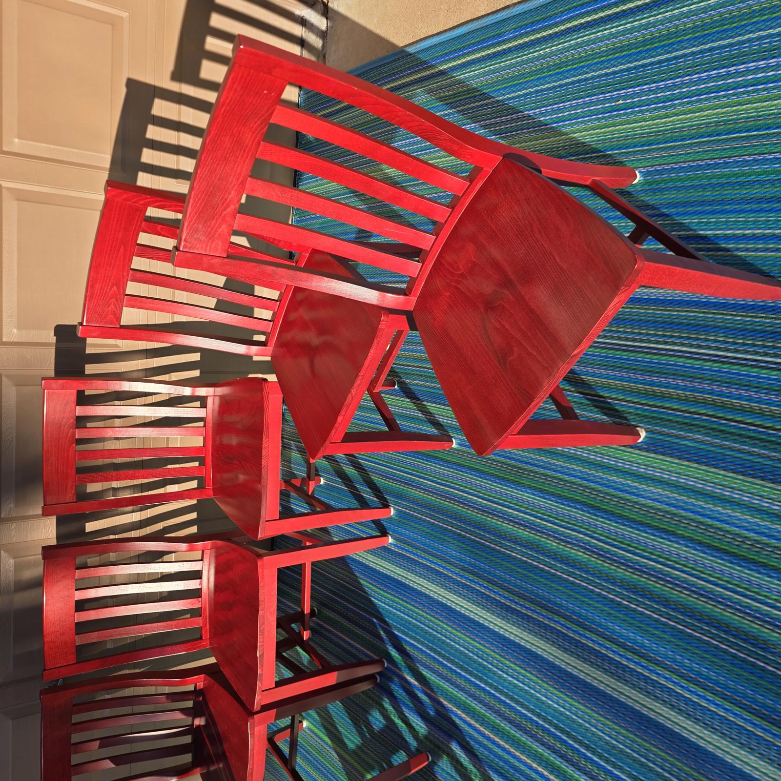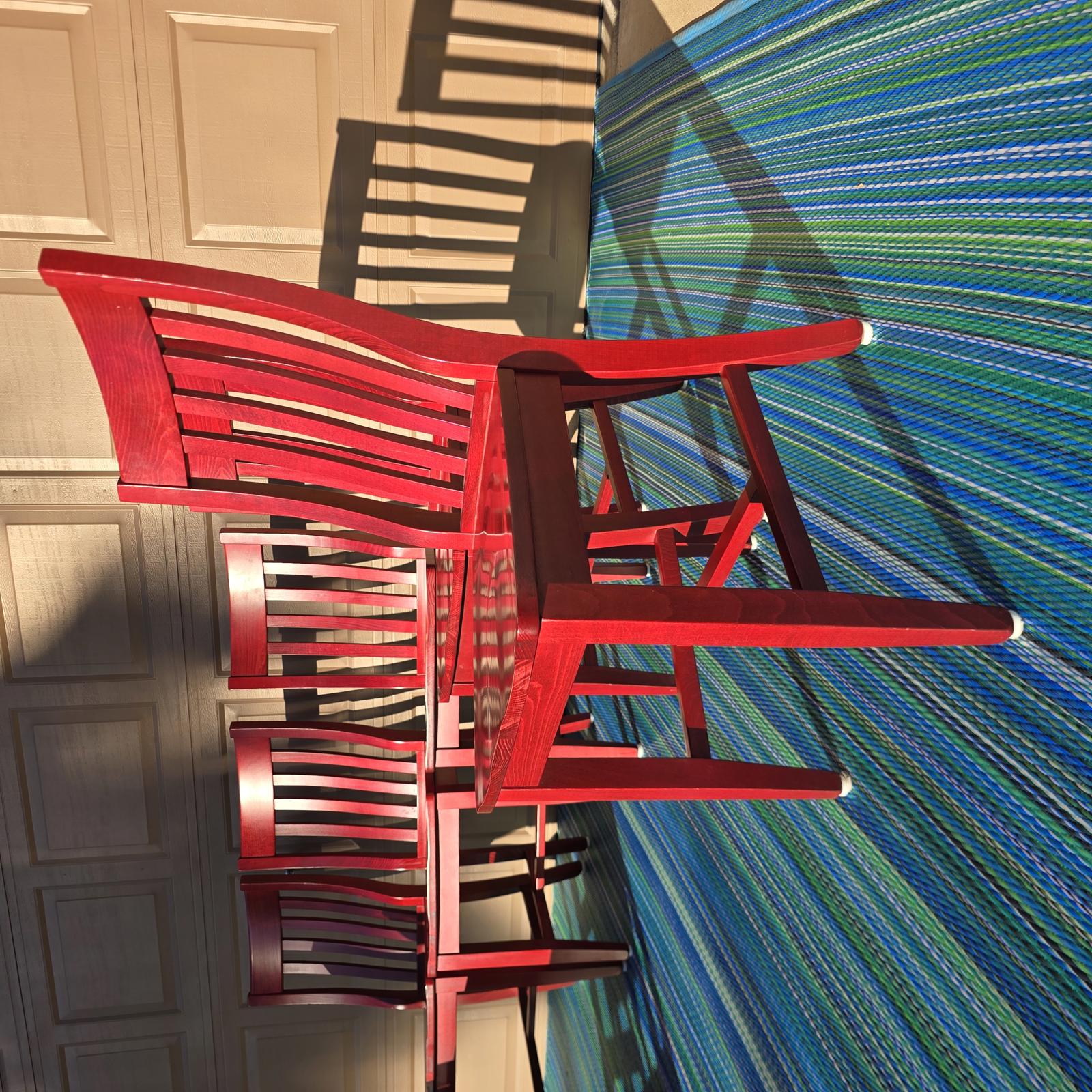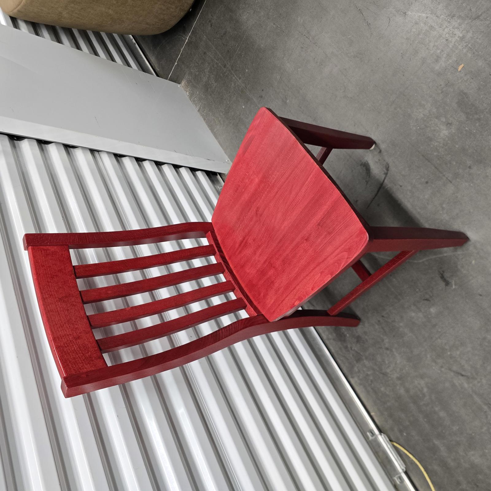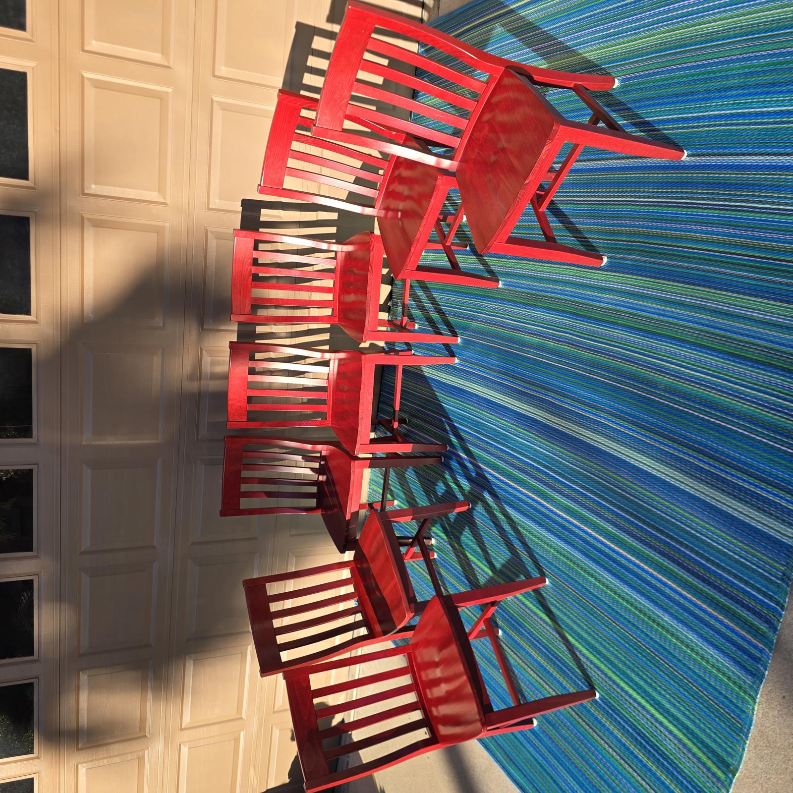 Add a pop-of-color with this great set of 7 Pottery Barn chairs made in Italy. They are perfect for your kitchen or dining room. The chairs are solid wood with a rich red stain finish that can easily be stained or painted to suite your design aesthetic. Quality chairs in good condition with minimal wear consistent with age and use. Please refer to photos. 36.25"H x 18.25"W x 21.25"D. Seat height 18.75" x 15.5" depth