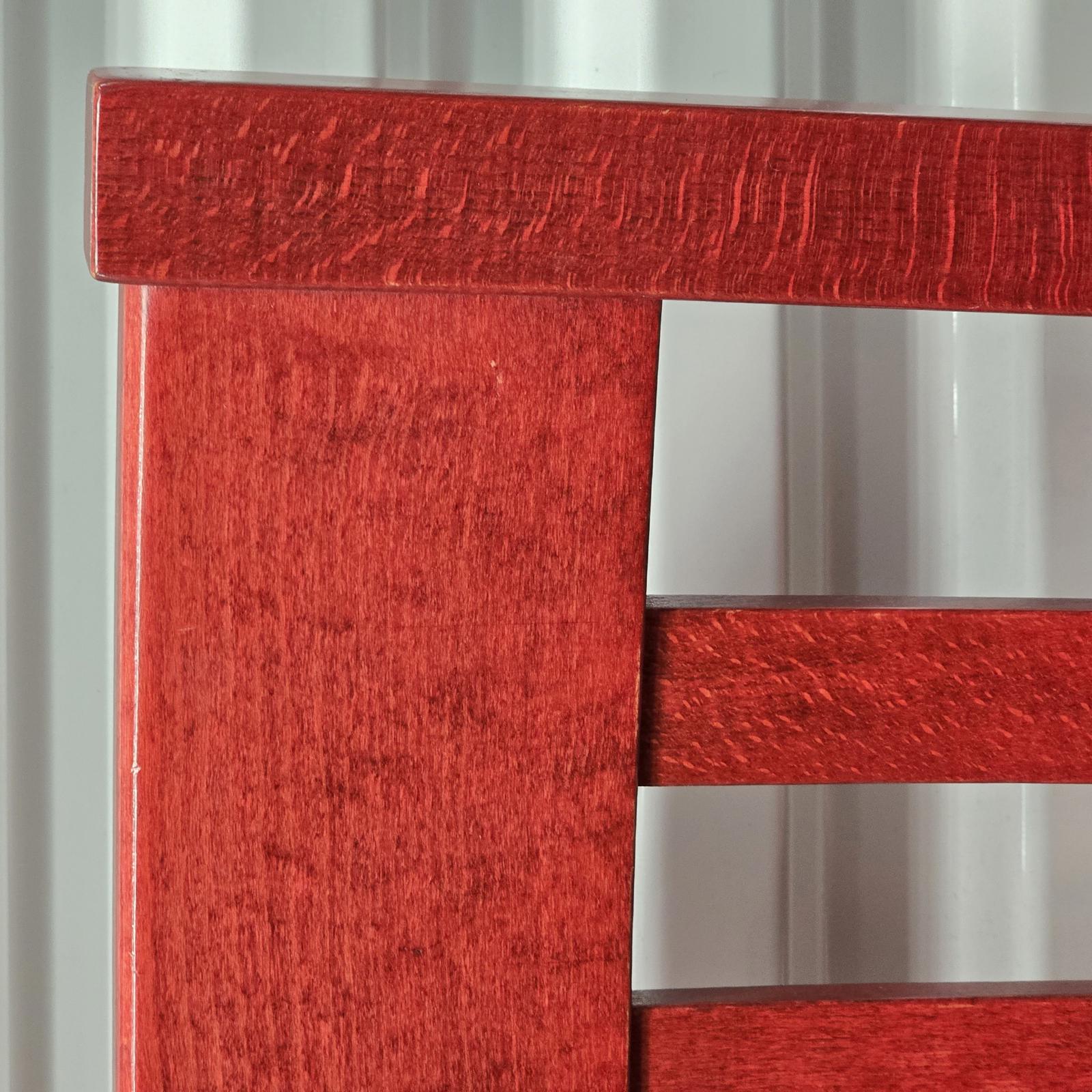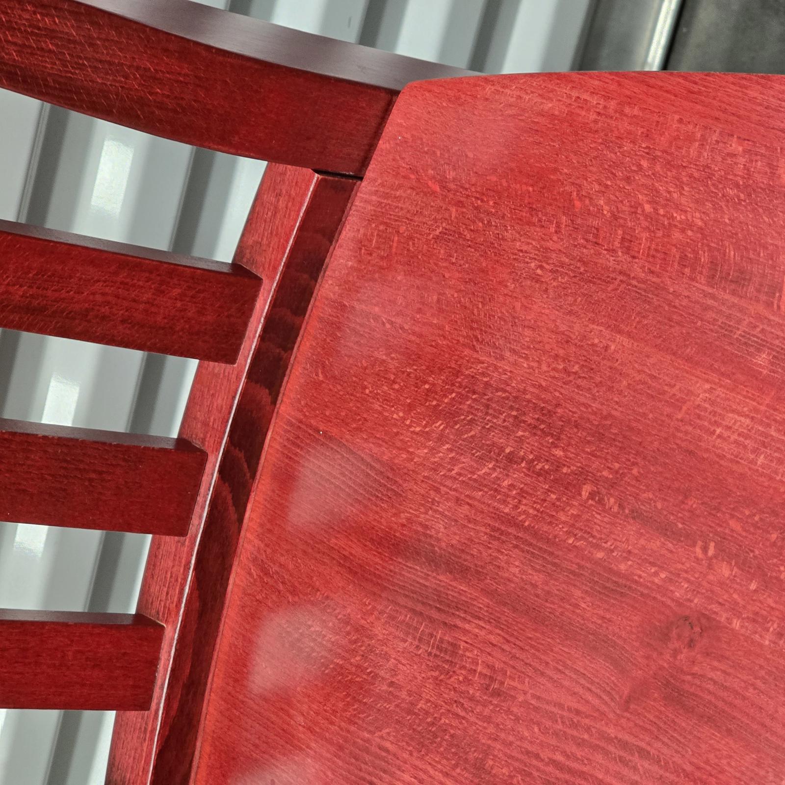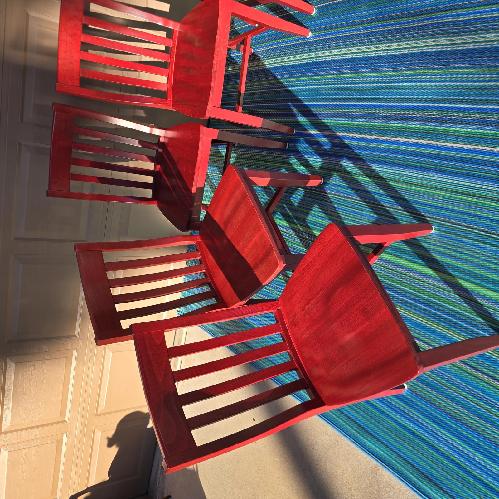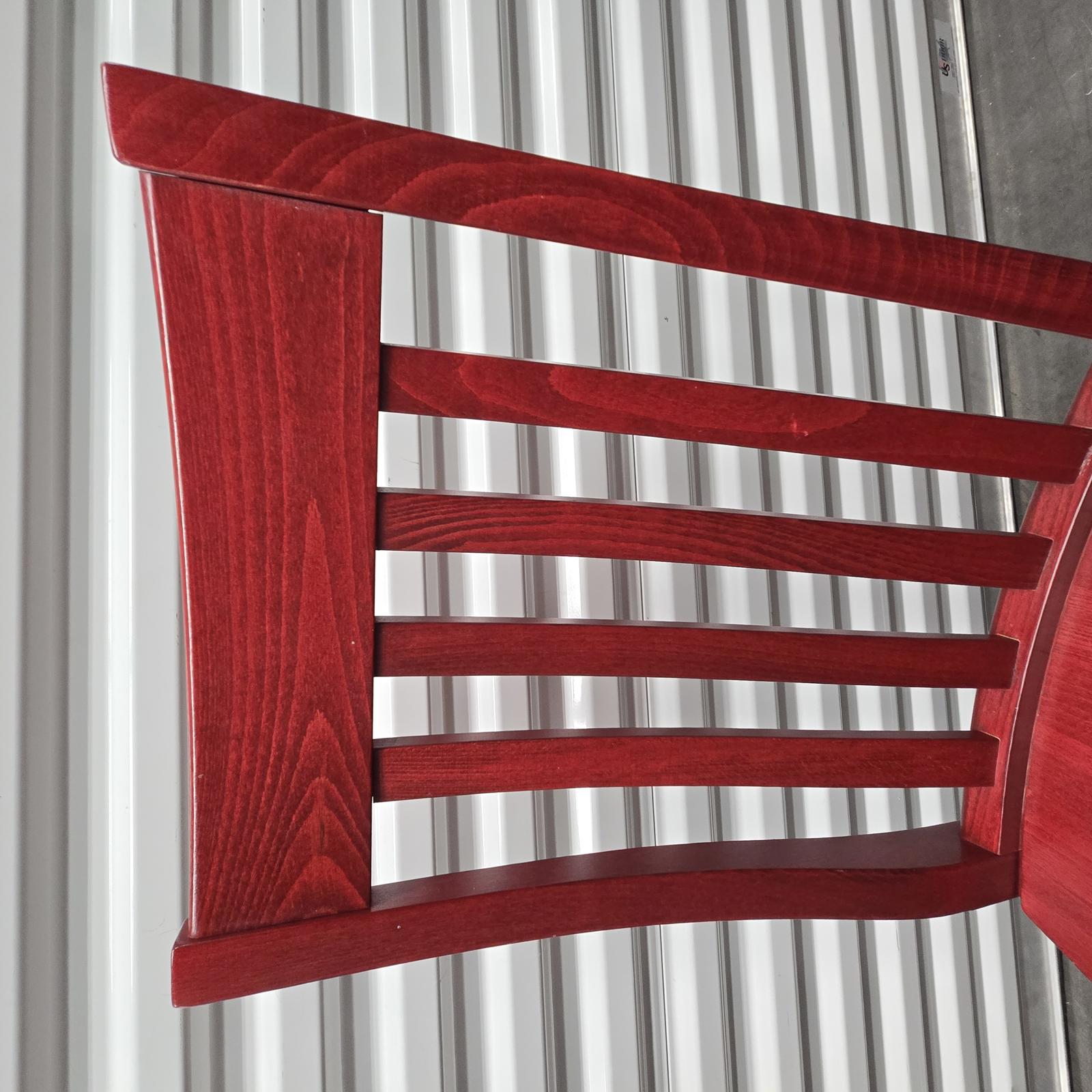 Add a pop-of-color with this great set of 7 Pottery Barn chairs made in Italy. They are perfect for your kitchen or dining room. The chairs are solid wood with a rich red stain finish that can easily be stained or painted to suite your design aesthetic. Quality chairs in good condition with minimal wear consistent with age and use. Please refer to photos. 36.25"H x 18.25"W x 21.25"D. Seat height 18.75" x 15.5" depth