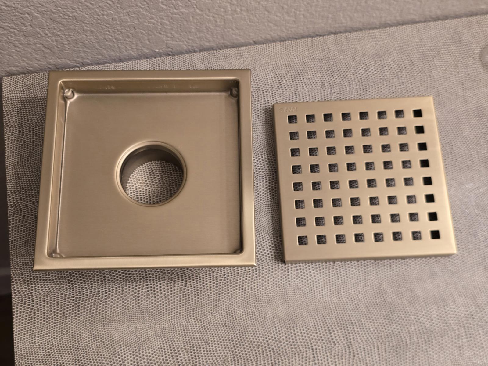 Modern 6" x 6" Shower drain with detachable grid plate and separate hair drain.