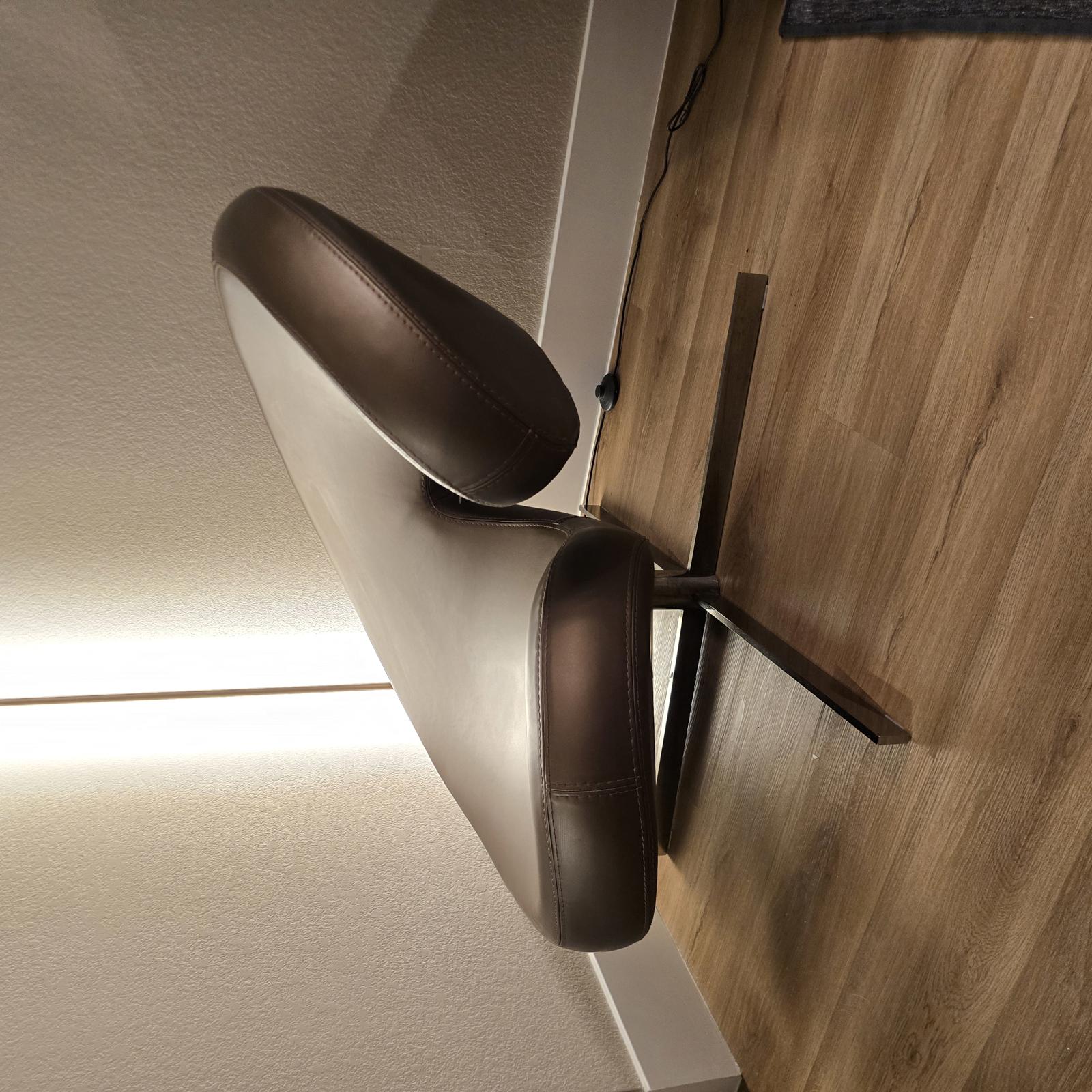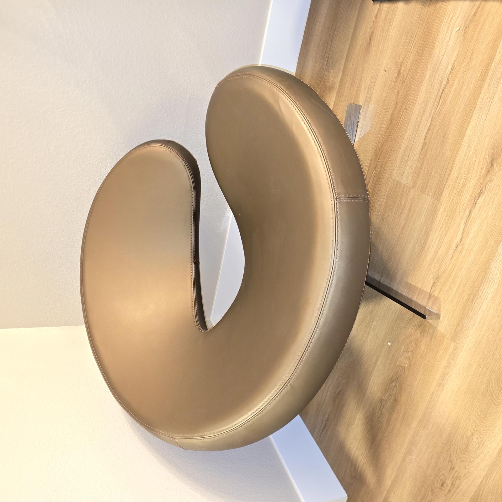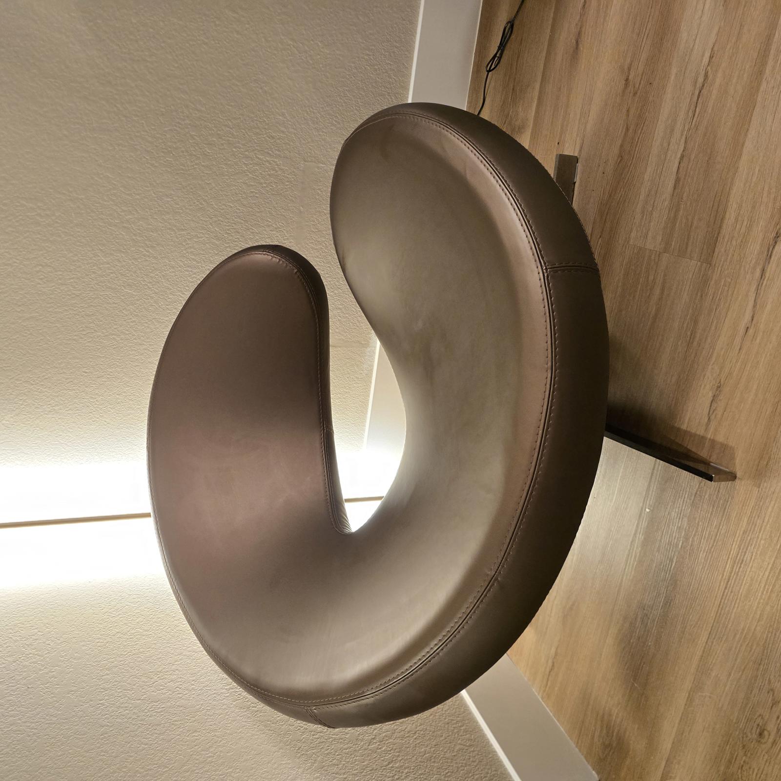 Iconic Roche Bobois Chair crafted in Italy and designed by Roberto Tapinassi and Maria Cristina Nogarotto. The chair is shaped like an "@ "or a cloud (Nuage is French for cloud), and you will feel like you are sitting in a cloud due to the plush, enveloping, and generous size. Beautiful bronze/brown leather and a chrome base that swivels 360°. c.1990's. Some wear consistent with age and use. Please refer to the photos as they are part of the description. There is a scratch on the top of seat back but it is not noticeable from the front. This has been factored into the price. 28"H x 36"W x 36"D. Seat height 12" x 22" Seat depth.