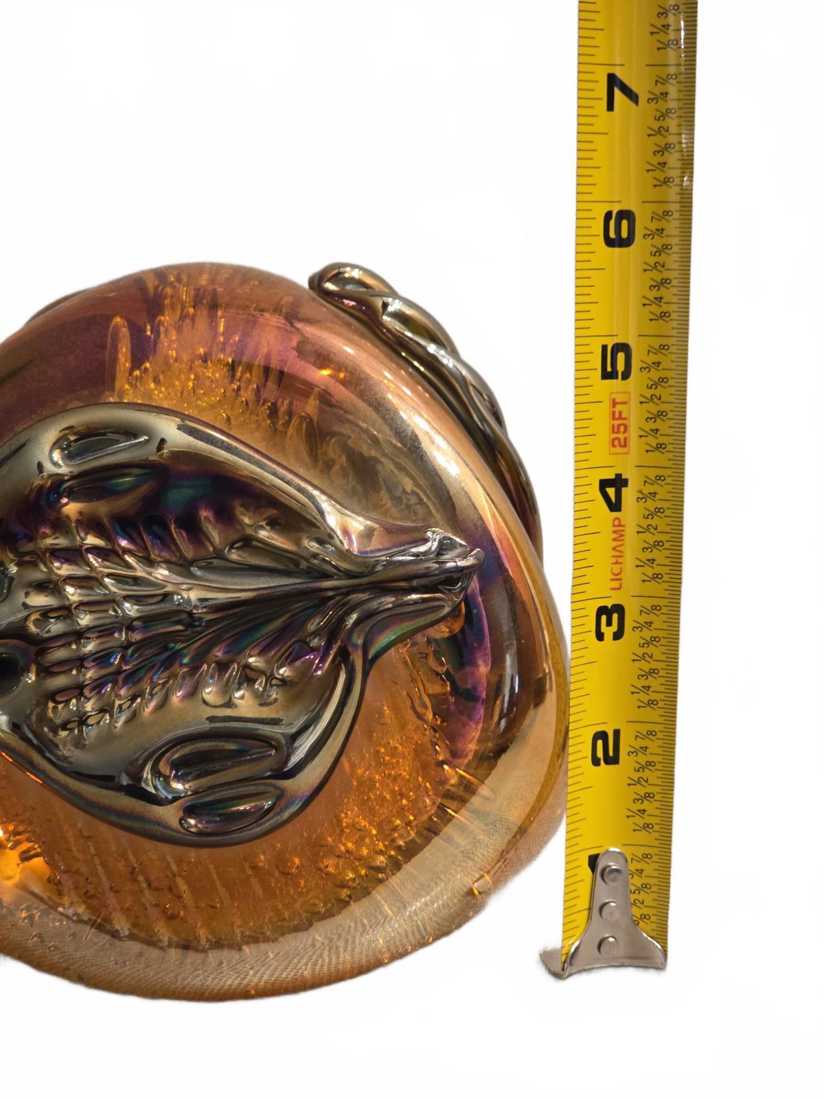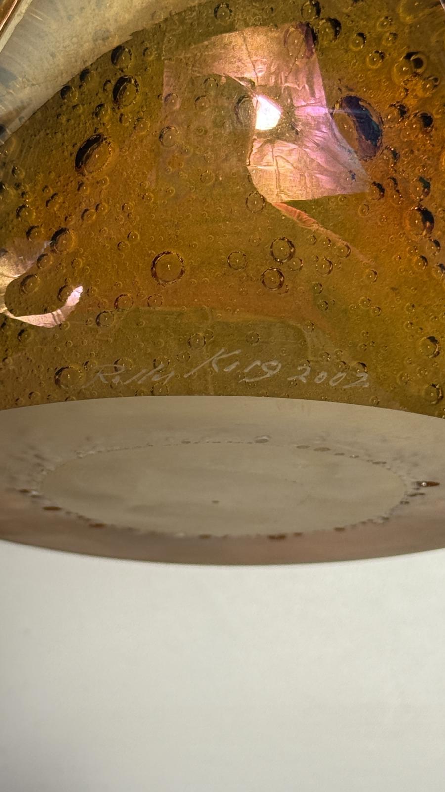 Rollin Karg is a renowned glass artist from the Midwest. He is now retired which make his pieces even more desirable. Iridescent bronze and multi-color design with intricate abstract patterns throughout. Signed and dated 2002 by the artist.