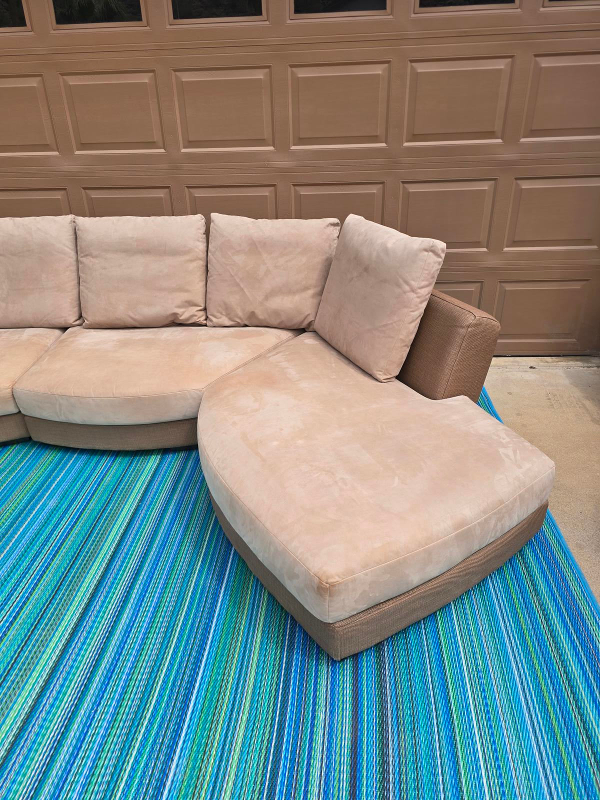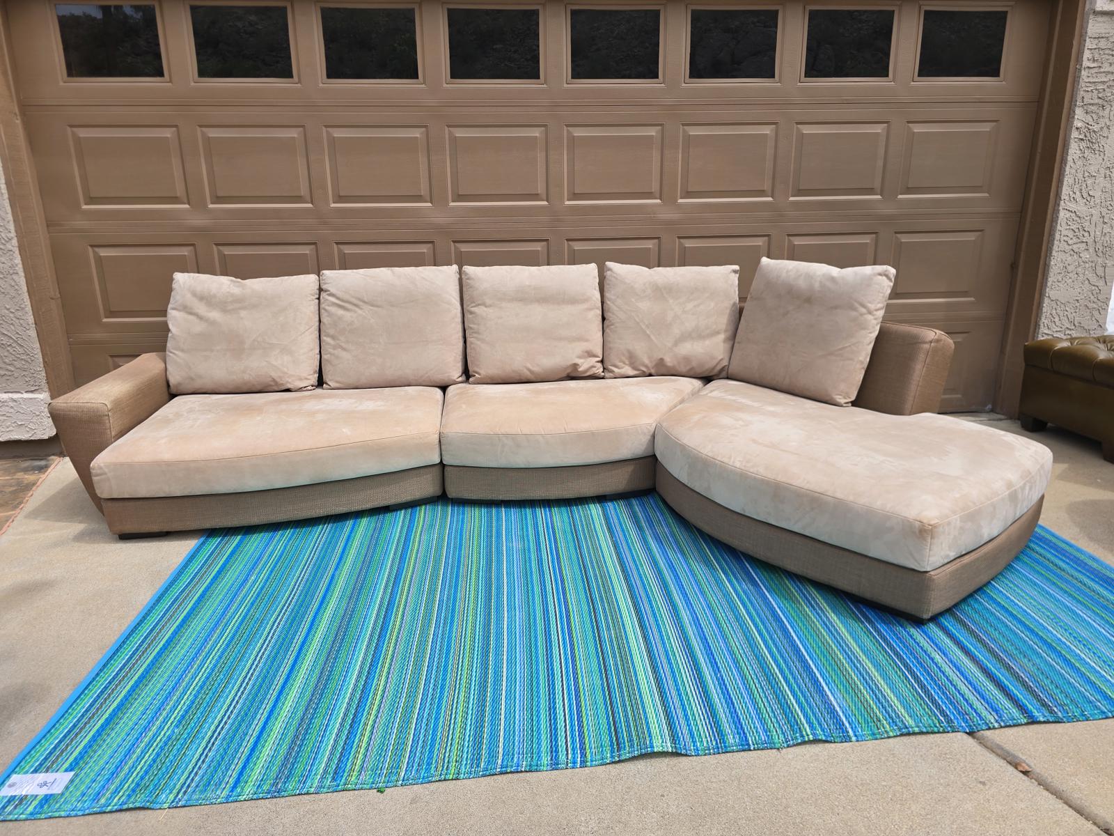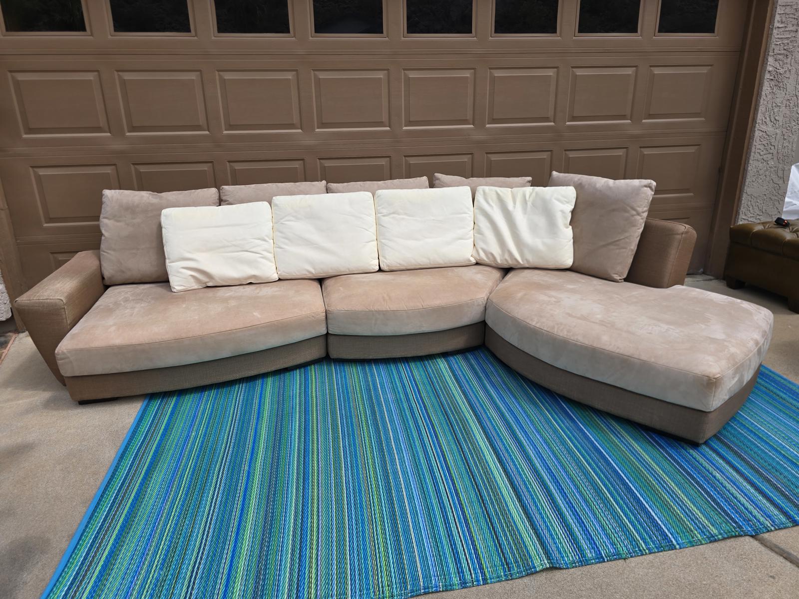 Beach Bay designed by Hans Hopfer. 3-piece sectional covered with taupe microsuede cushions and 5 cream colored accent pillows. The darker end pieces are covered in a heavy textured corded linen-type fabric that subtly contrasts with the cushions. Roche Bobois is known for their quality and unique design. Measures 47"D x 142"L x 32"H with cushions, 27"to back. Seat height 15.5". Missing connecting pieces to hook couch together, didn't seem to slide around without them but something can be fabricated very easily as a replacement for this. Good condition with some wear on arm and corners, consistent with age and use.