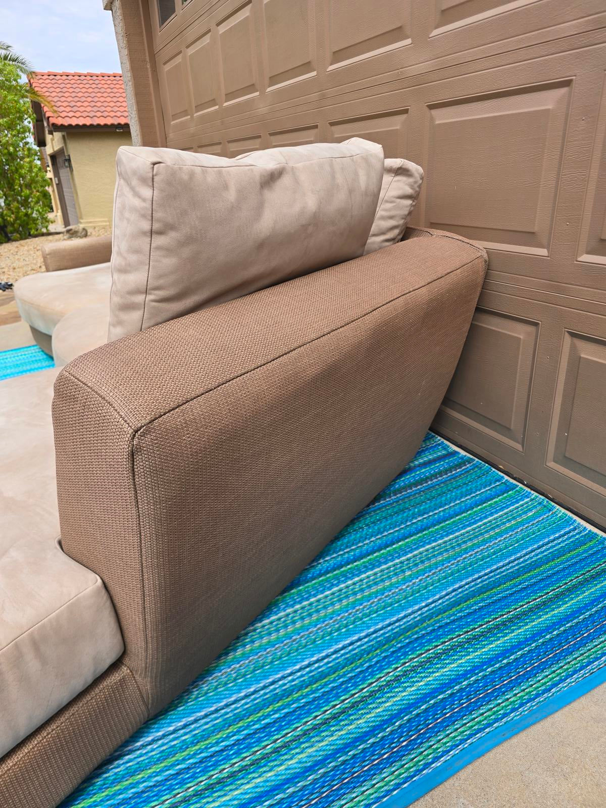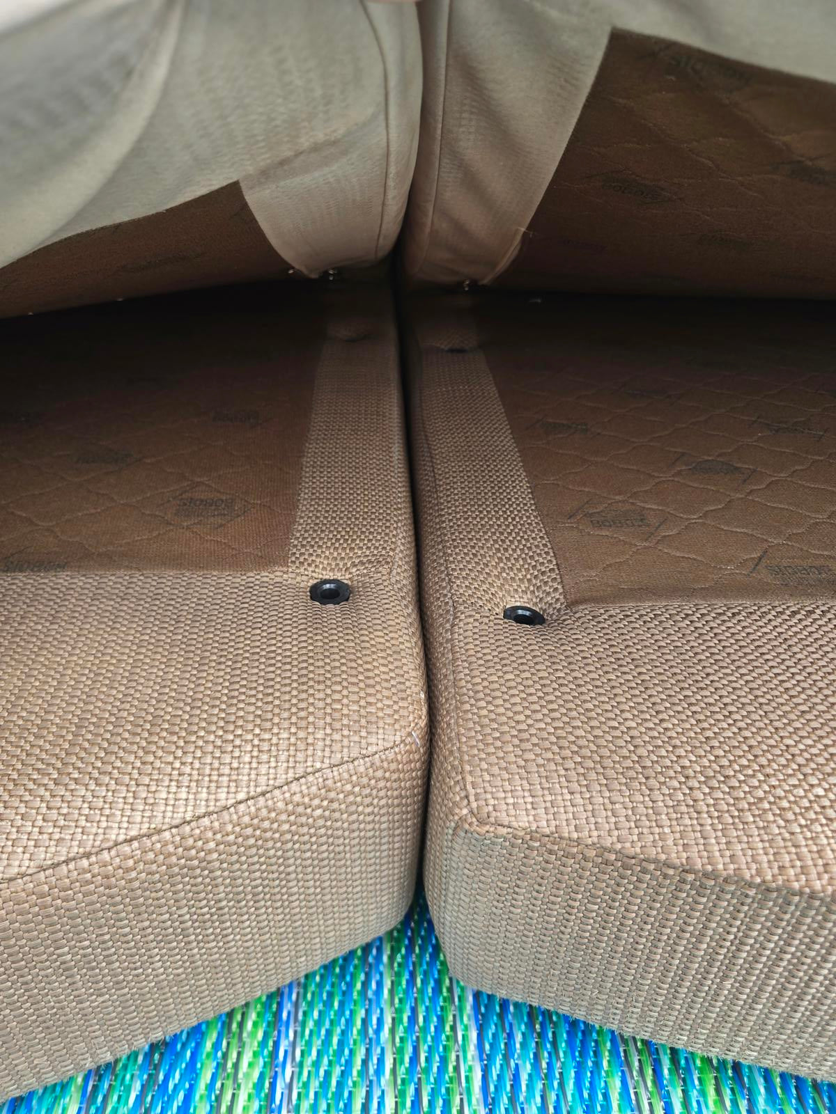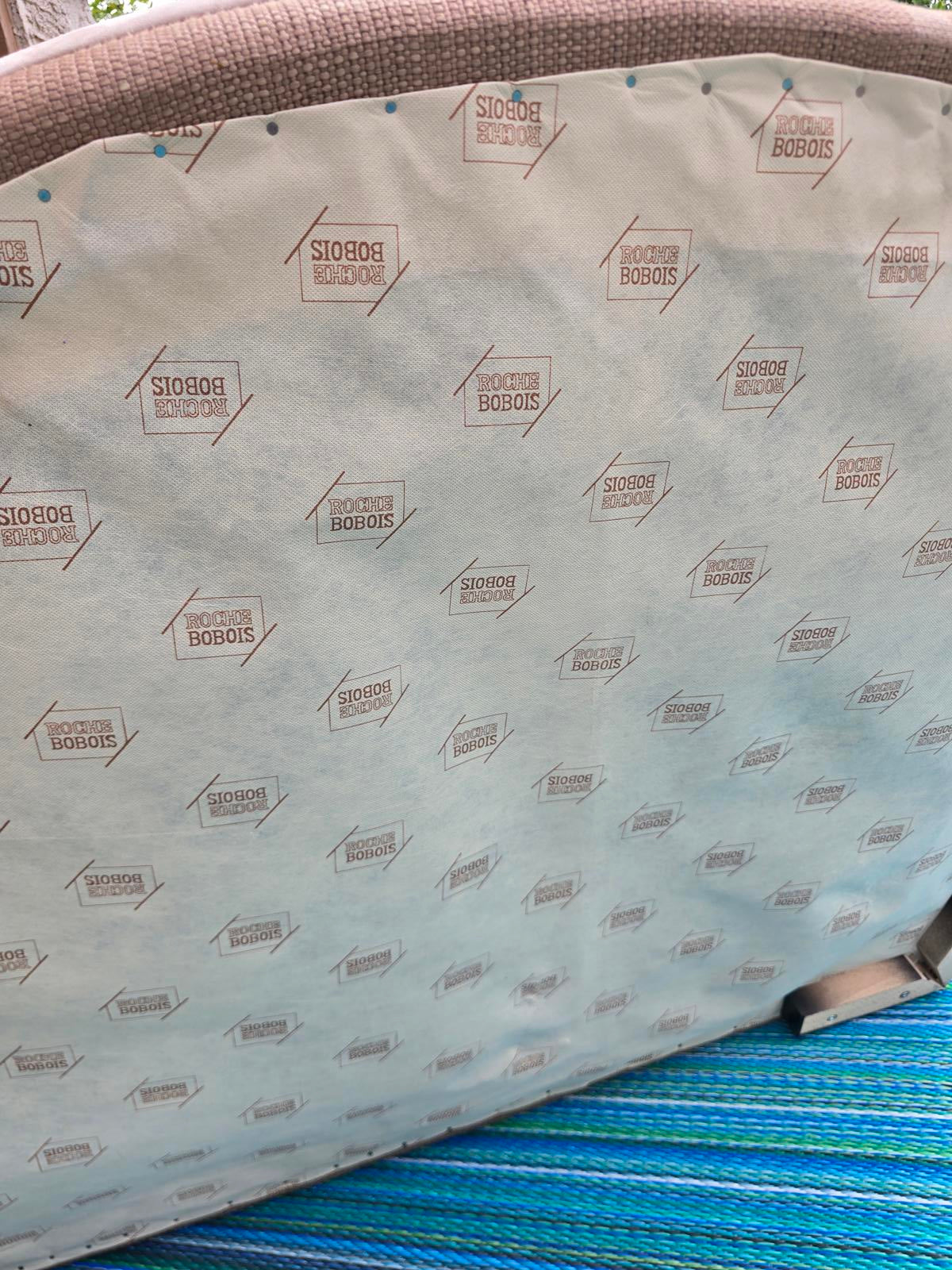 Beach Bay designed by Hans Hopfer. 3-piece sectional covered with taupe microsuede cushions and 5 cream colored accent pillows. The darker end pieces are covered in a heavy textured corded linen-type fabric that subtly contrasts with the cushions. Roche Bobois is known for their quality and unique design. Measures 47"D x 142"L x 32"H with cushions, 27"to back. Seat height 15.5". Missing connecting pieces to hook couch together, didn't seem to slide around without them but something can be fabricated very easily as a replacement for this. Good condition with some wear on arm and corners, consistent with age and use.
