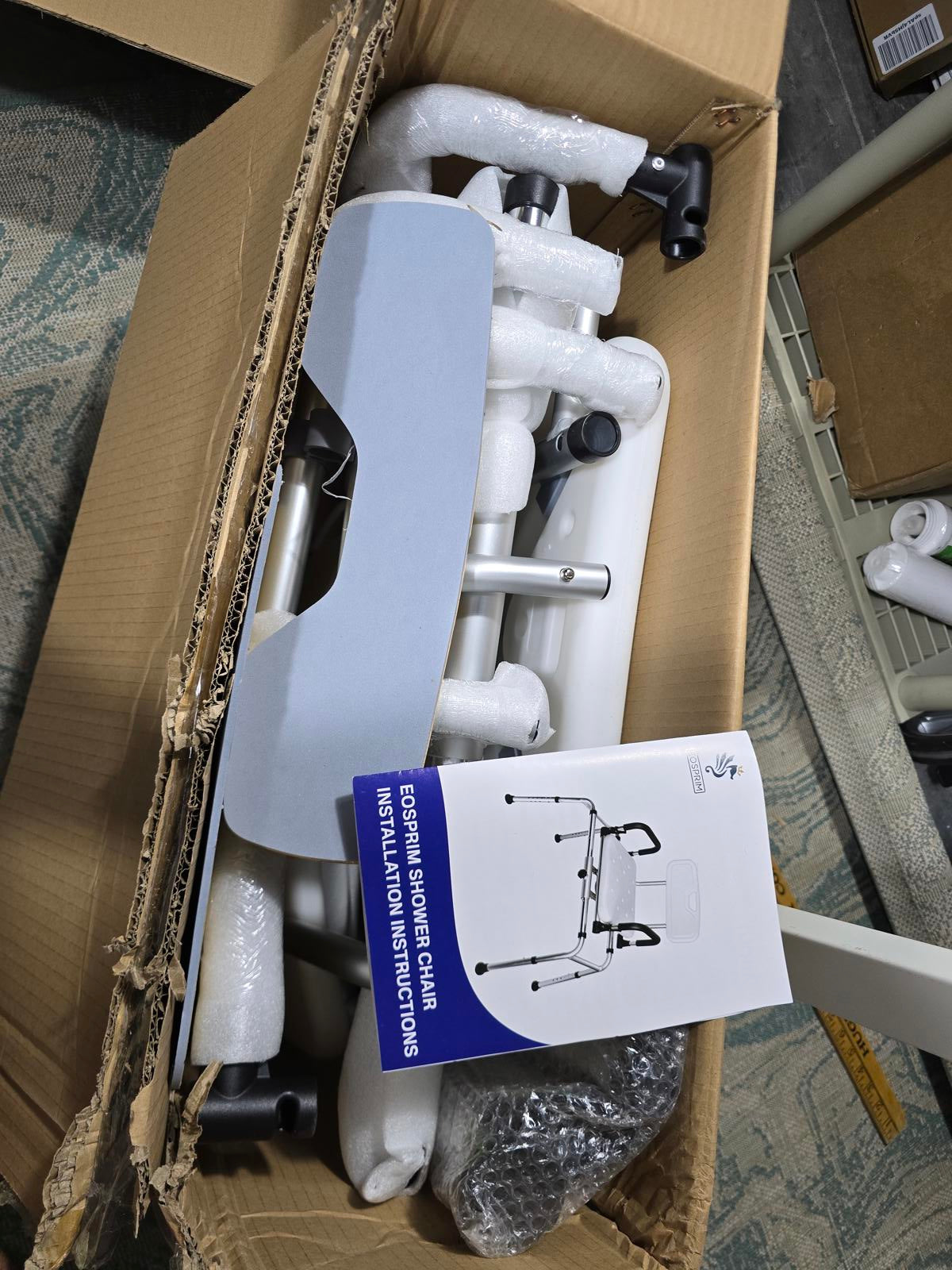 High quality sliding transfer chair with 2 armrests and clip to keep shower head nearby. Locking mechanism to keep seat in place, safety belt, and drainage holes to reduce water pooling. Seat height adjusts from 16"-21.5" and will bear weight up to 400lbs.